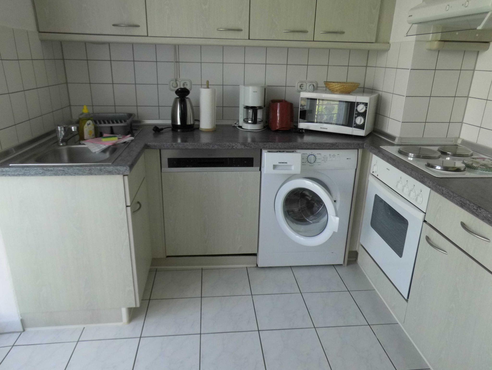 Eine gut ausgestattete Küche mit Waschmaschine, Geschirrspüler, vollständigem Geschirr, Küchengeräten, Kaffeemaschine, Wasserkocher und Toaster sind vorhanden.