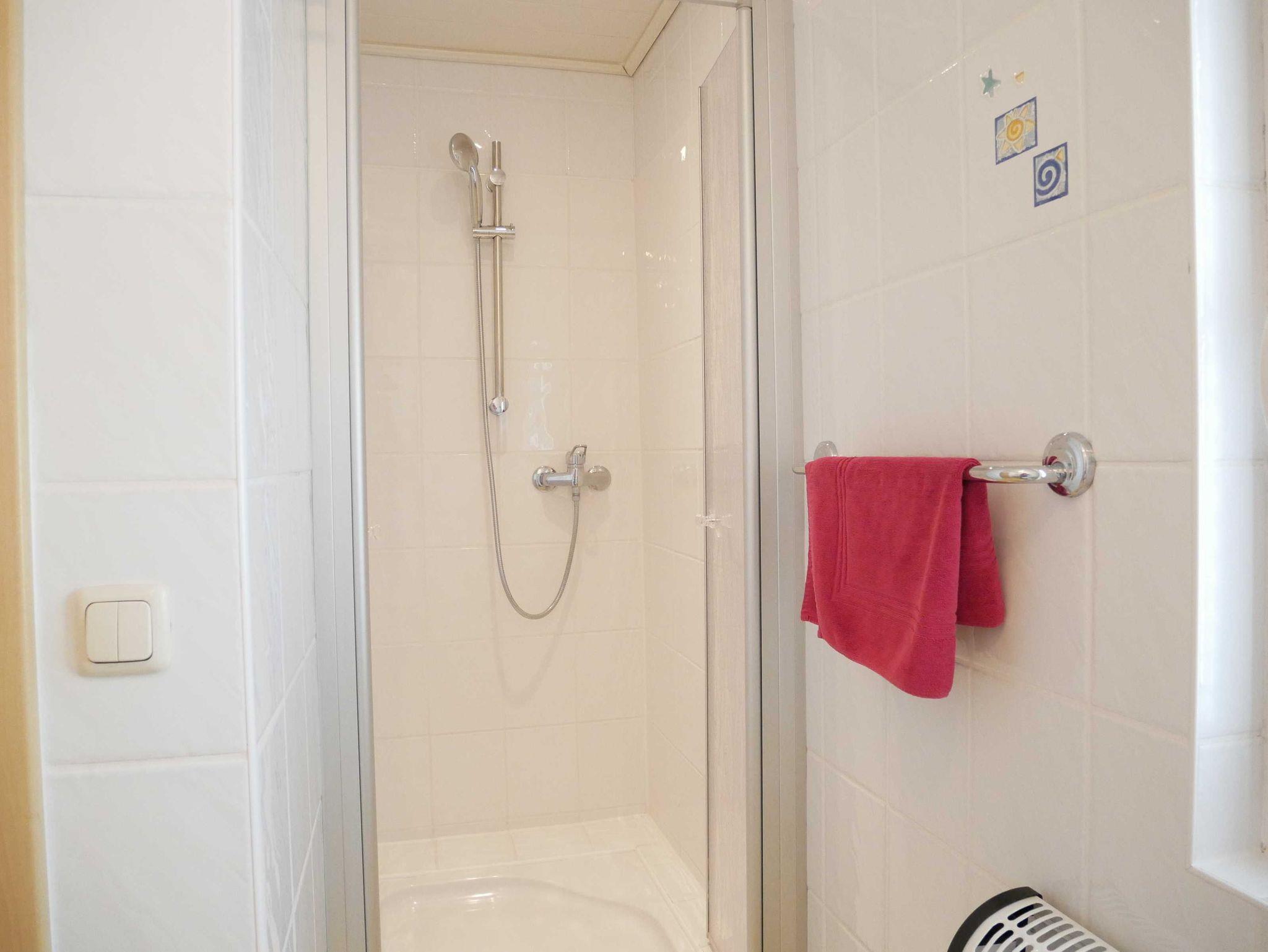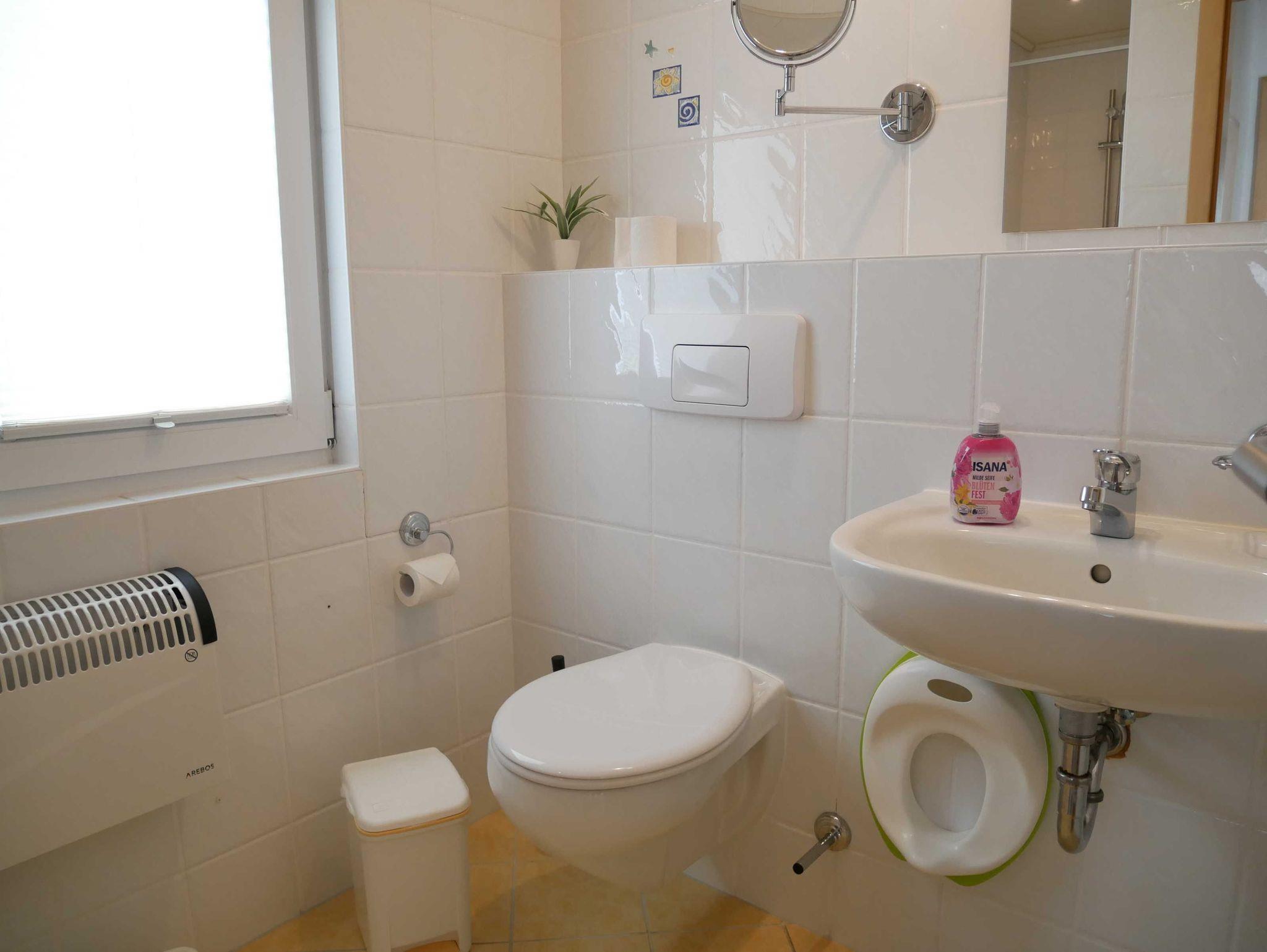 Das Badezimmer verfügt über eine Dusche, Haartrockner, separatem Schminkspiegel und einer zusätzlichen Beleuchtung über dem Spiegel.