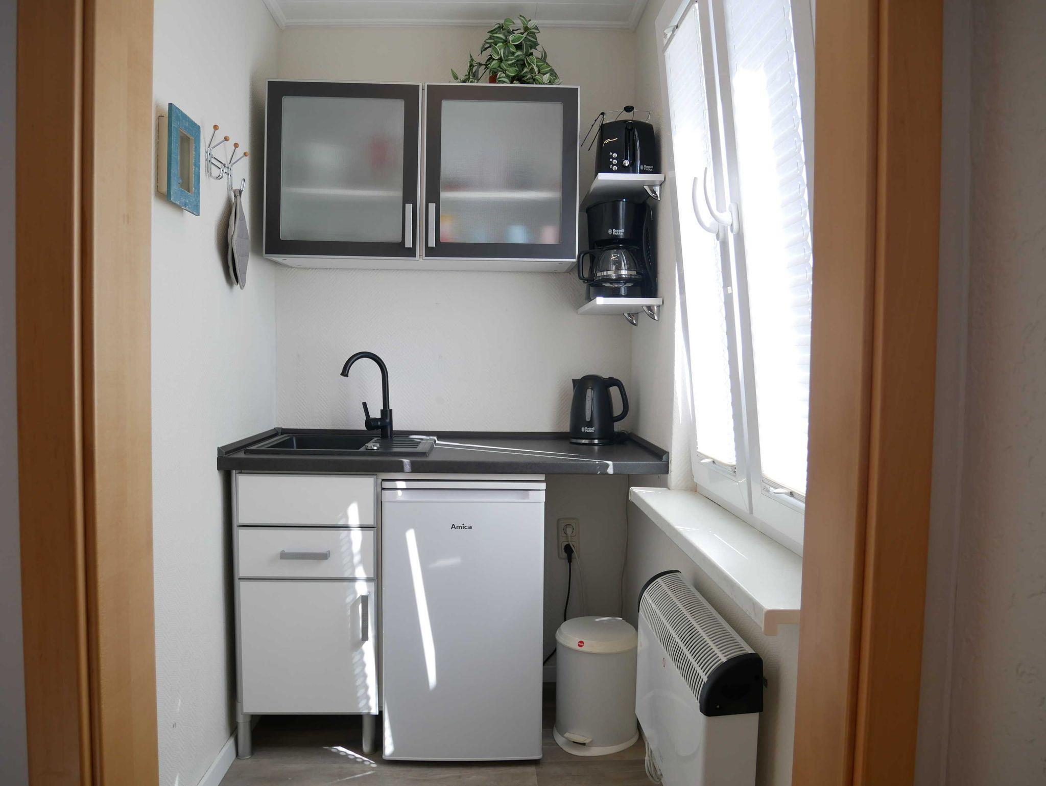 Die Pantryküche ist mit zwei mobilen Kochplatten, Kühlschrank, Toaster, Kaffeemaschine, Wasserkocher und einer Mikrowelle ausgestattet.