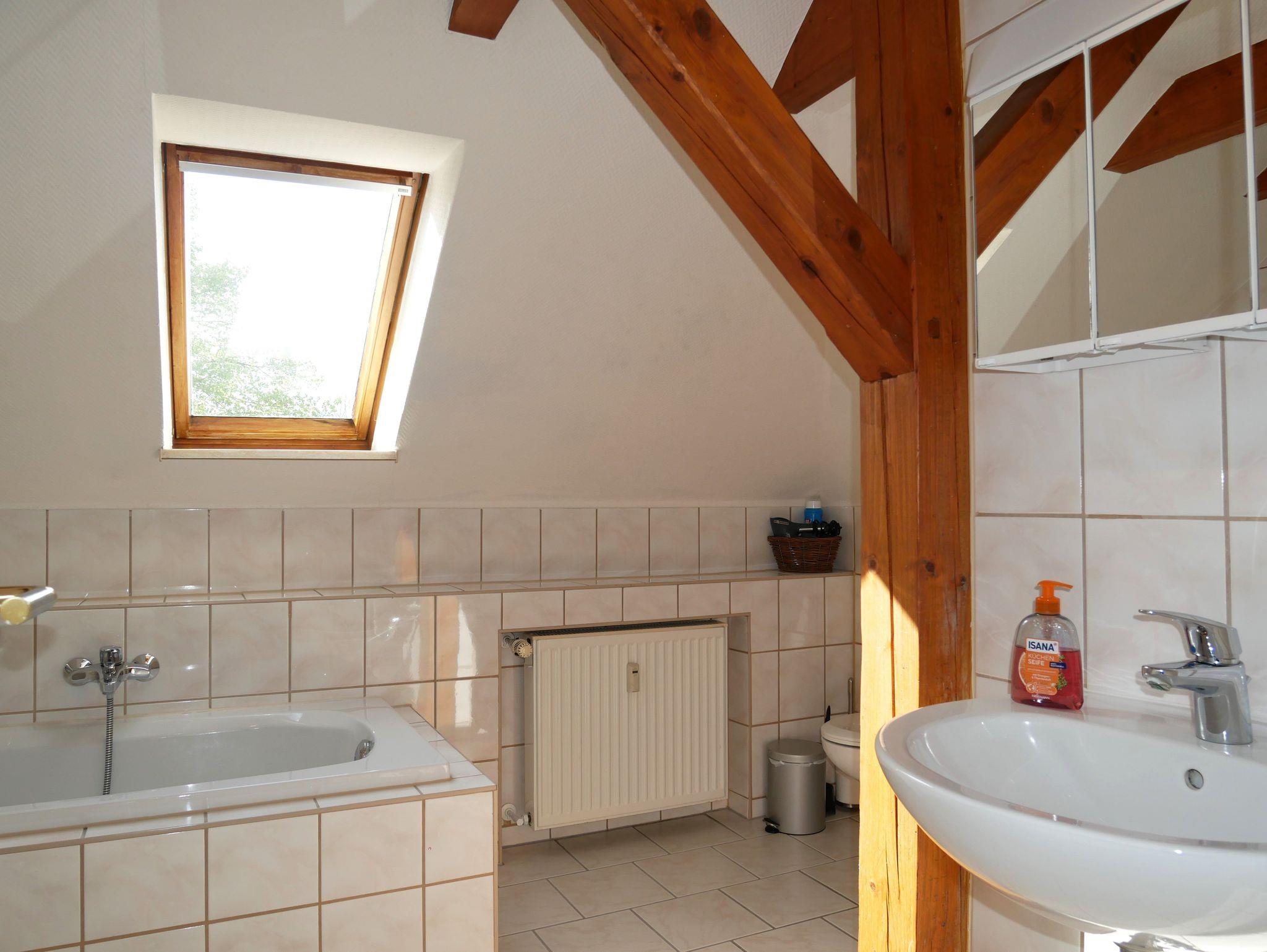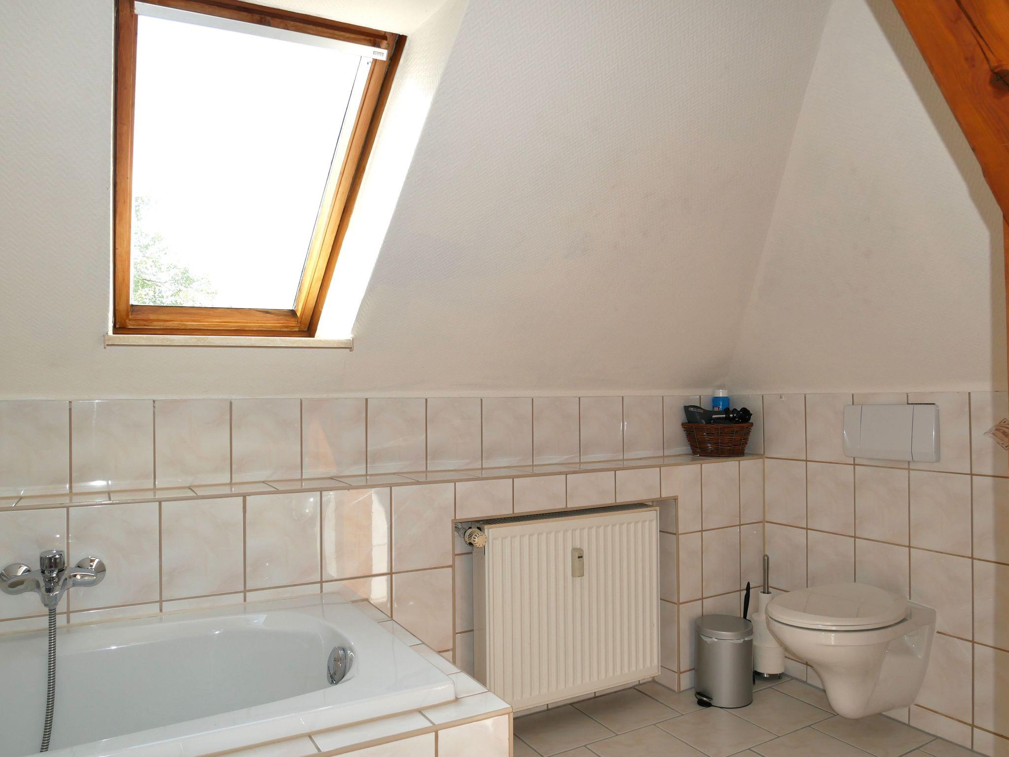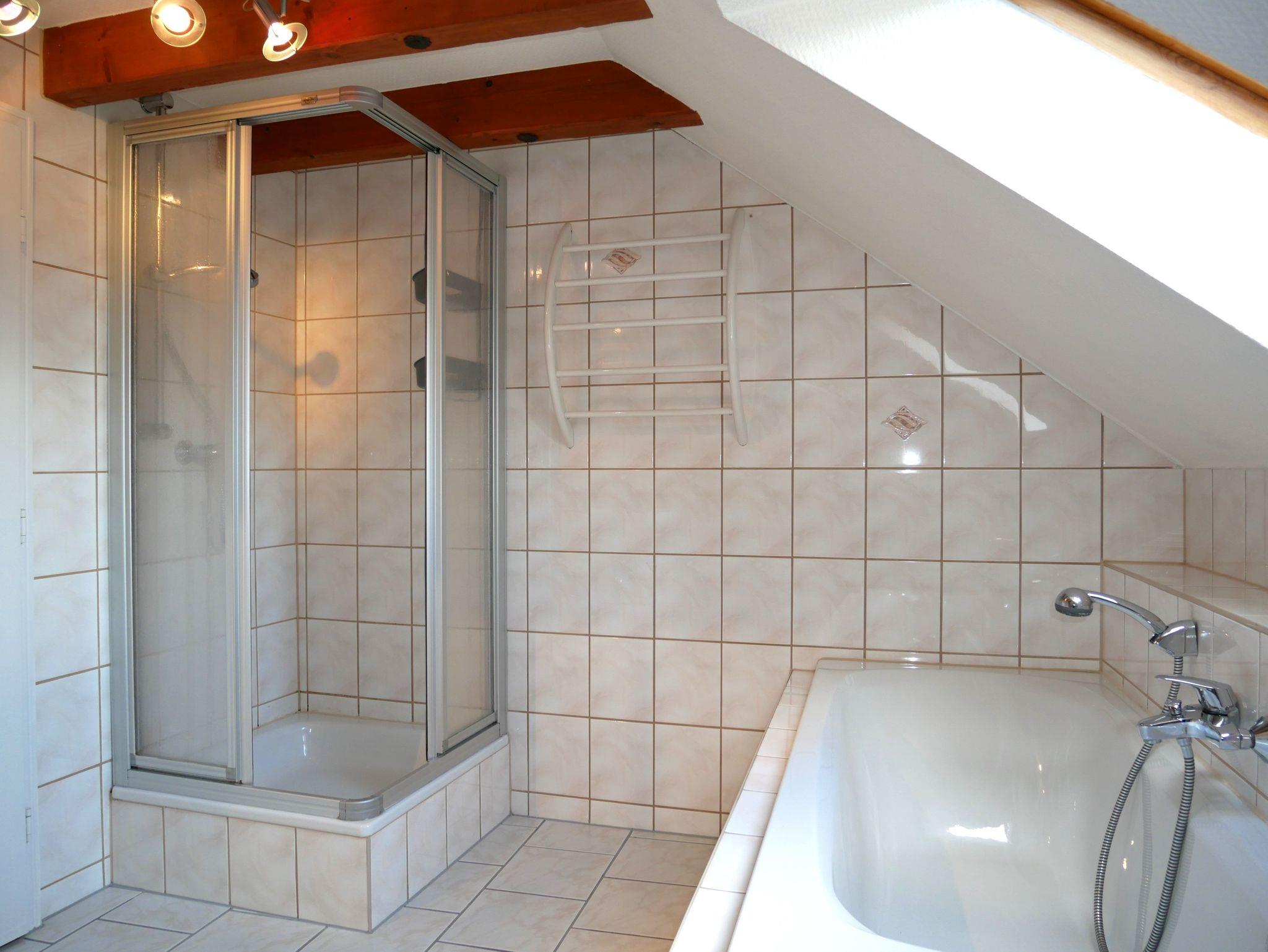 Das großzügige Tageslicht- Badezimmer verfügt über Badewanne und Dusche.