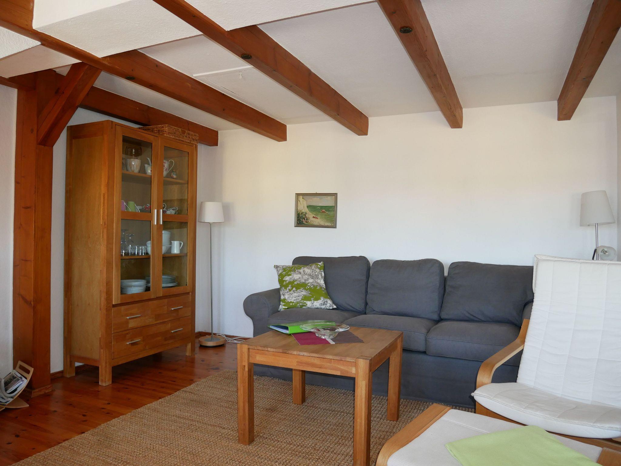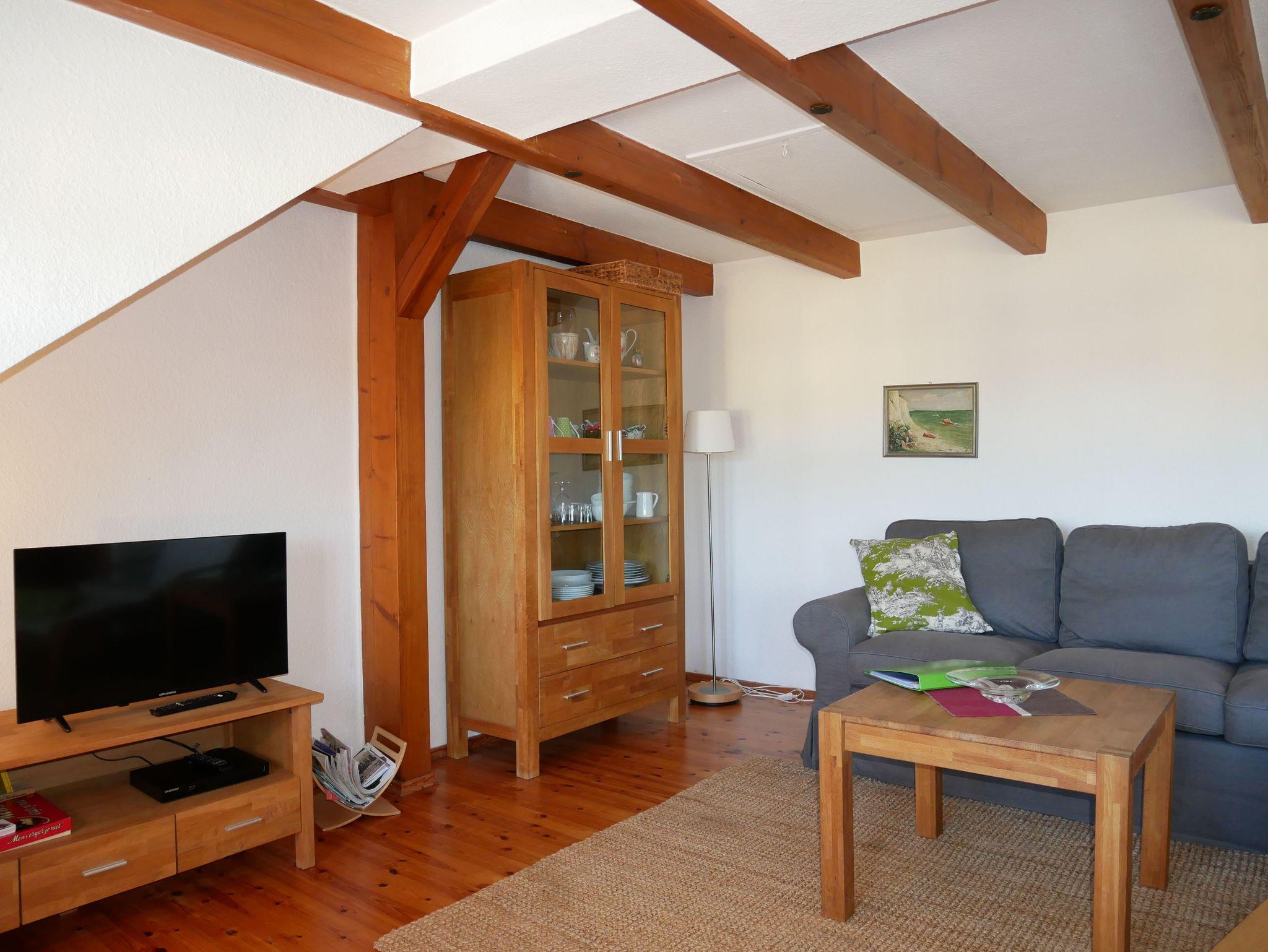 Im großzügigen Wohnbereich befindet sich der Esstisch, eine Couch (mit Schlaffunktion 1,90 x 2,0m) TV, CD- und DVD Player, sowie ein Radio und ein Fernsehsessel. Die offen liegenden Balken und Holzdielen sorgen für eine besondere Gemütlichkeit. Die voll ausgestattete Einbauküche mit Tresen verfügt über ein Cerankochfeld mit Backofen, Spülmaschine, Mikrowelle, Kühlschrank mit Gefriermöglichkeit, Wasserkocher, Toaster und Kaffeemaschine.