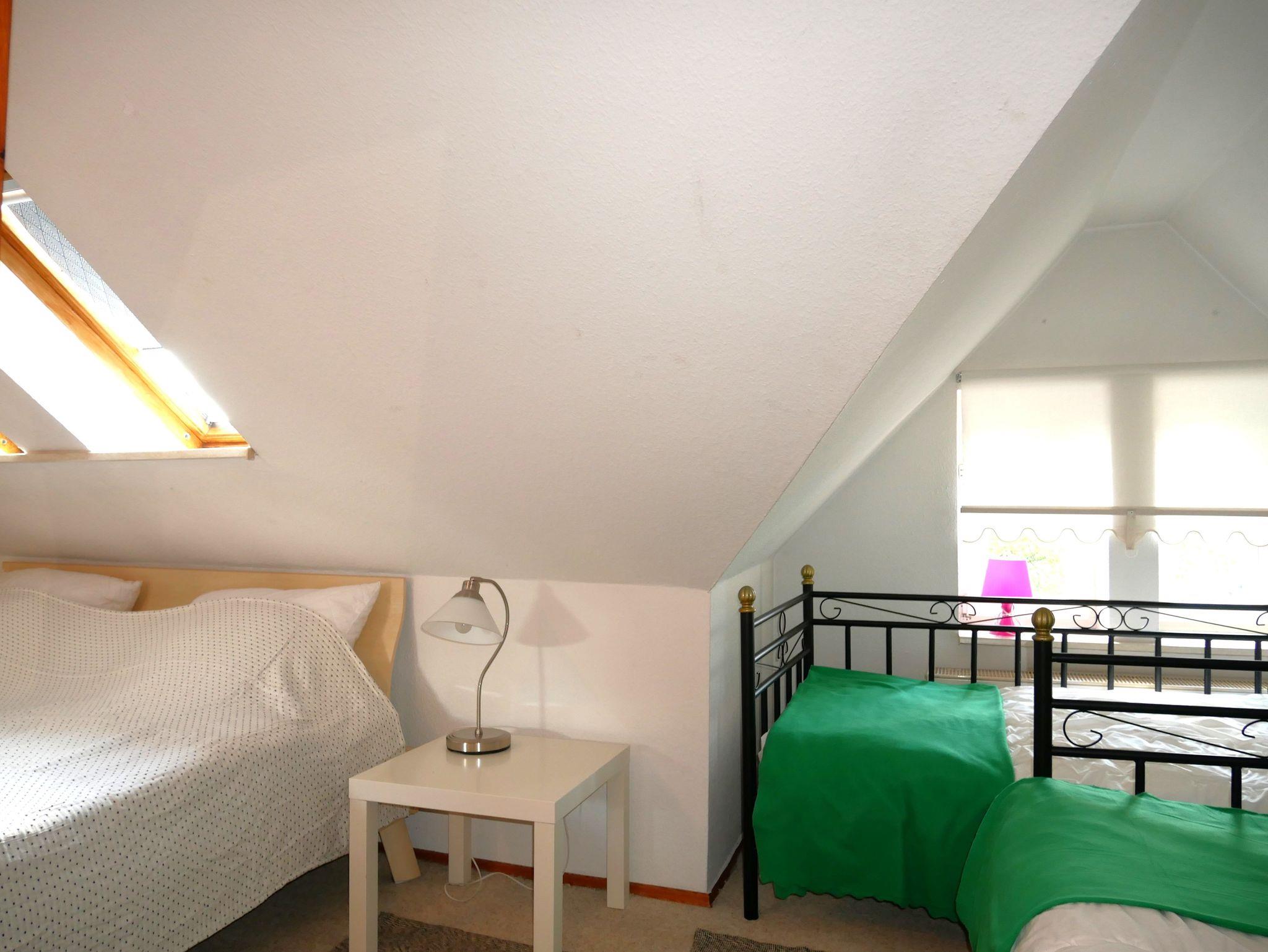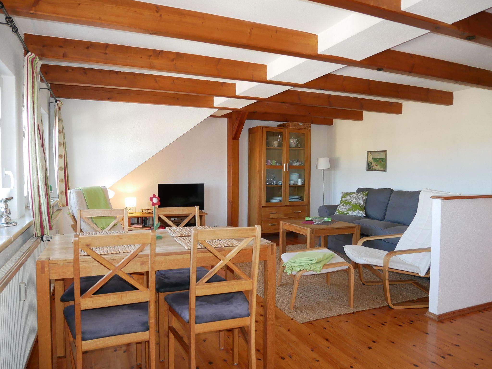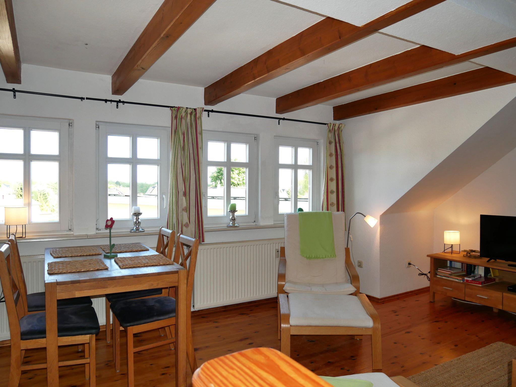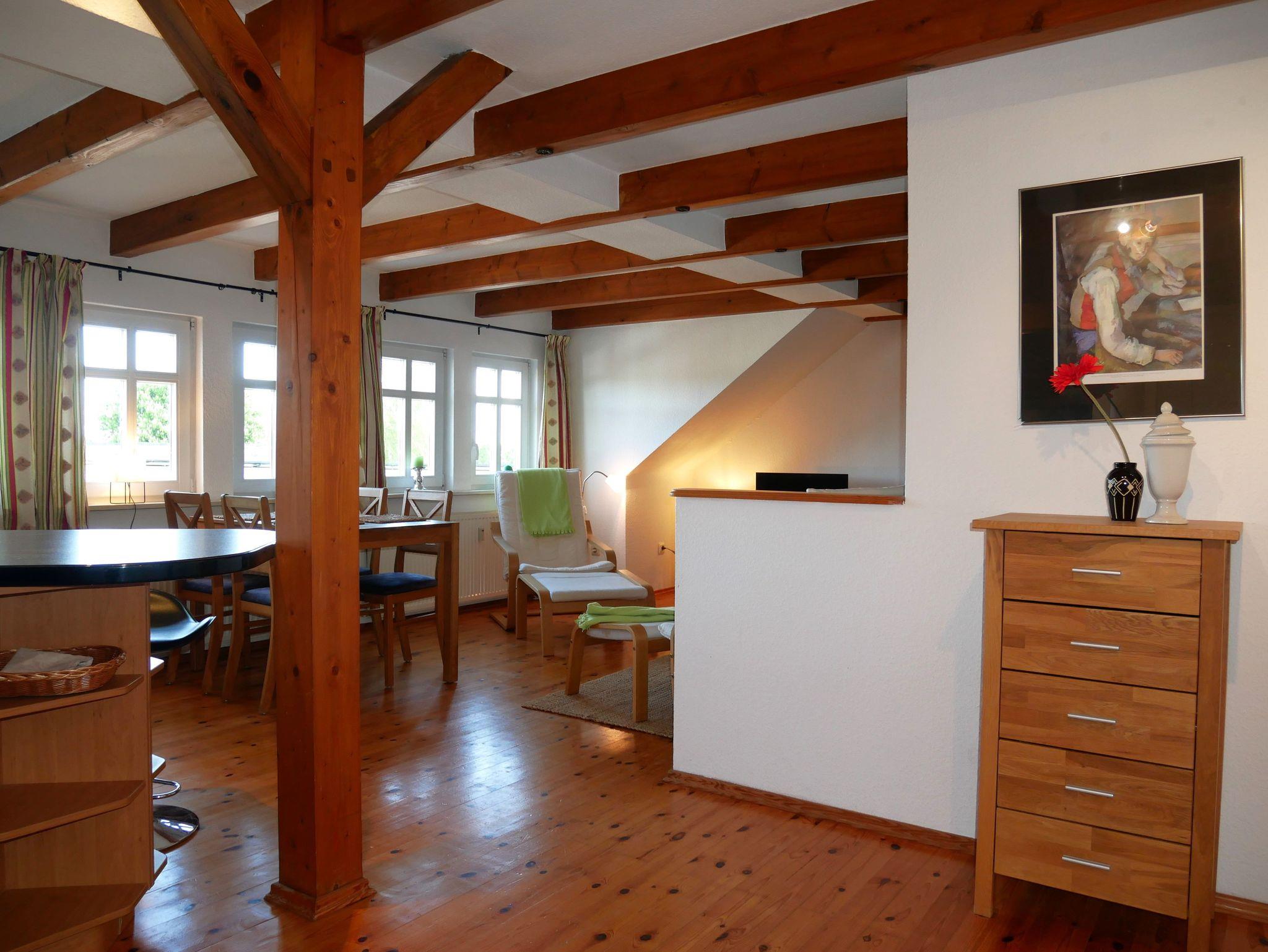 Die 65 qm große 2- Raum Ferienwohnung befindet sich im Dachgeschoß (2. OG) eines alten Bürgerhauses mit insgesamt 3 Ferienwohnungen. Die Wohnung ist für max. 6 Erwachsene geeignet.