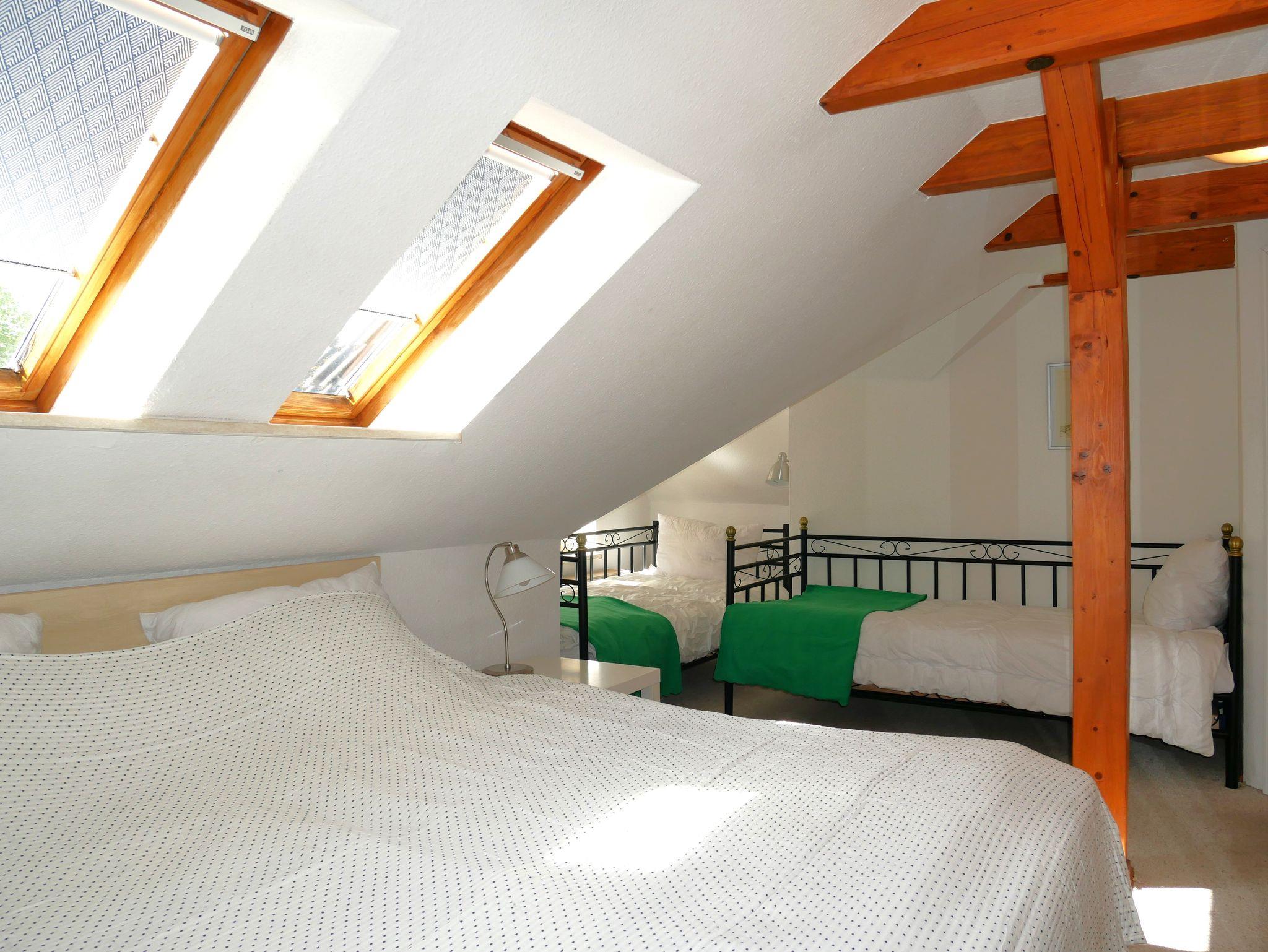 Im Schlafzimmer befindet sich ein Doppelbett (2 x2 m) und 2 Einzelbetten (0,90x2,0 m). Kinderreisebett und Hochstuhl können nach Bedarf zur Verfügung gestellt werden.
