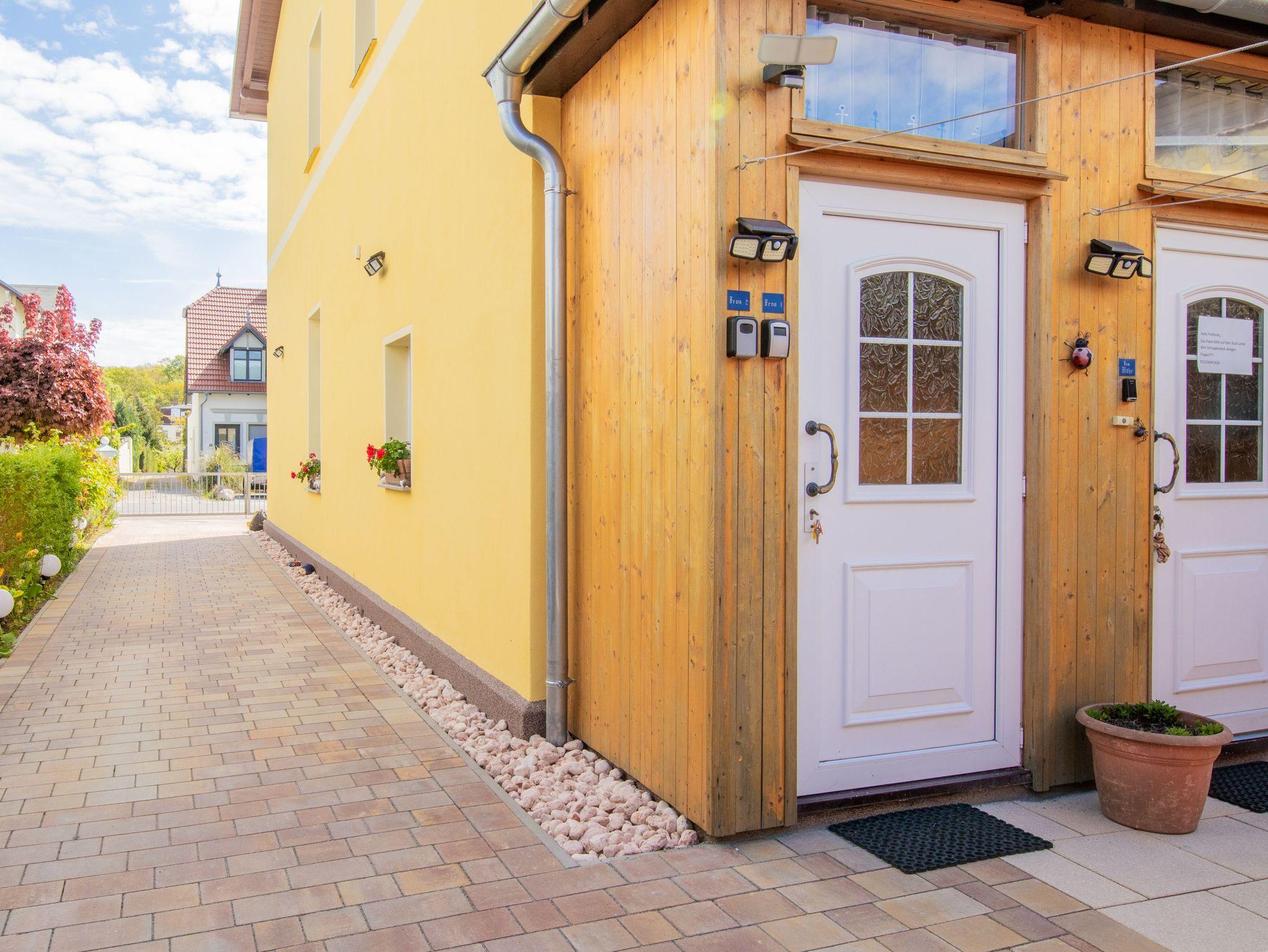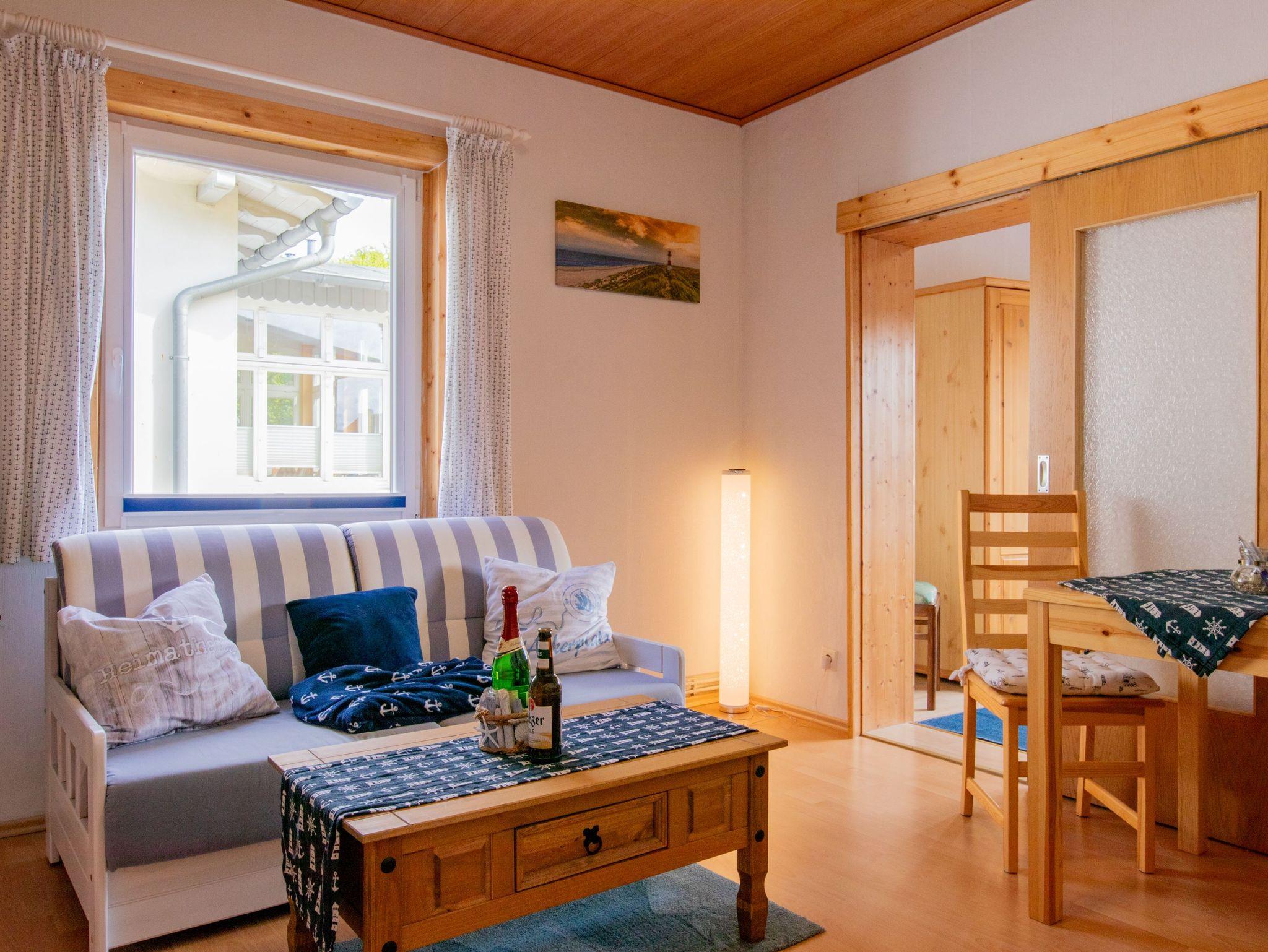 Die 40m² große Ferienwohnung 2 bietet Platz für bis zu 2 Personen und liegt direkt über der Wohnung deiner Vermieter. Über die gemeinsame Treppe erreichst du dein gemütliches 2-Zimmer-Apartment. Das Wohnzimmer begrüßt dich mit einem bequemen Sofa, einem Esstisch für zwei Personen und einer praktischen Pantryküche. Diese ist mit Kaffeemaschine, Kühlschrank, Toaster und Wasserkocher ausgestattet - ideal für kleinere Mahlzeiten zwischendurch. Direkt angrenzend befindet sich das Schlafzimmer mit einem Doppelbett (180x200cm, zwei einzelne Matratzen) sowie einem geräumigen Kleiderschrank, in dem du deine Urlaubsgarderobe gut unterbringen kannst. Eine Besonderheit dieser Wohnung ist das Badezimmer, das sich außerhalb des Apartments befindet - direkt gegenüber des Wohnzimmers auf der anderen Seite des Flurs. Es ist ausschließlich dir zugeordnet und mit Dusche, Waschbecken und Toilette ausgestattet. Für entspannte Stunden im Freien steht dir im Hof eine eigene Terrasse mit Sitzmöbeln zur Verfügung - perfekt für ein Frühstück an der frischen Luft oder einen ruhigen Abend im Grünen.