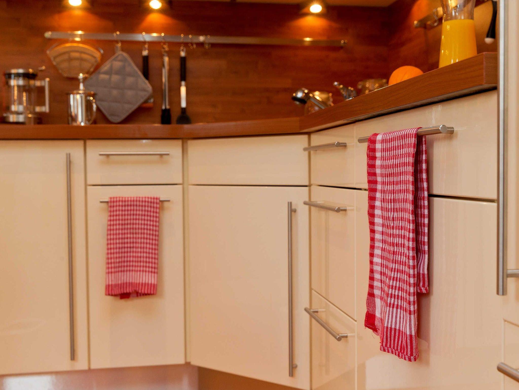 Die gut ausgestattete Einbauküche bietet alles, was Sie zum Kochen brauchen ? inklusive Geschirrspüler, Kühlschrank mit Gefrierfach und Heißluftherd.