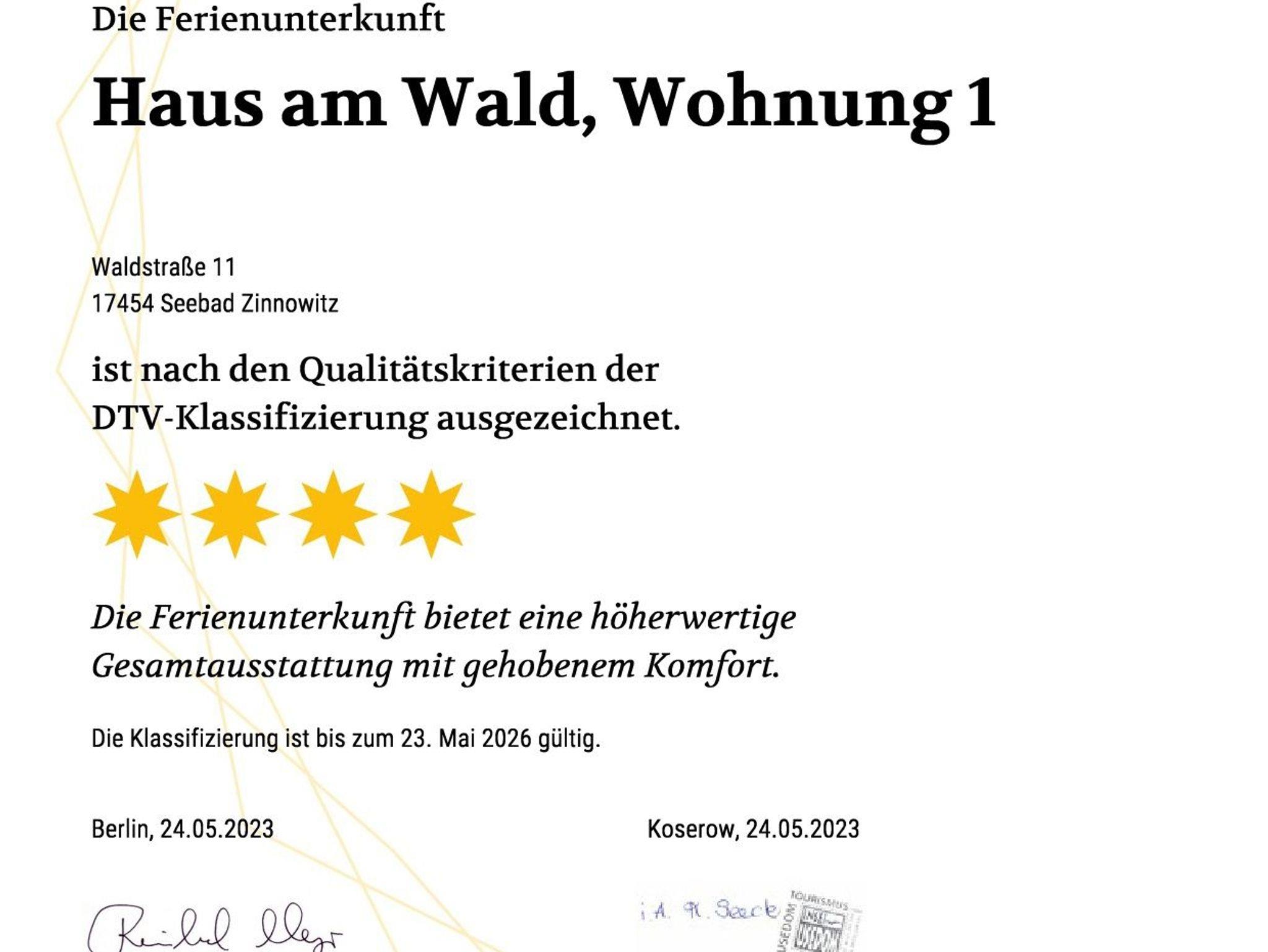 • Diese Wohnung wurde vom DTV (Deutscher Tourismusverband) mit 4-Sternen bei einer Belegung mit bis zu 2 Personen klassifiziert. Bei einer Belegung von mehr als 2 Personen ist der DTV-Sterne-Standard von 4-Sternen nicht mehr gewährleistet.