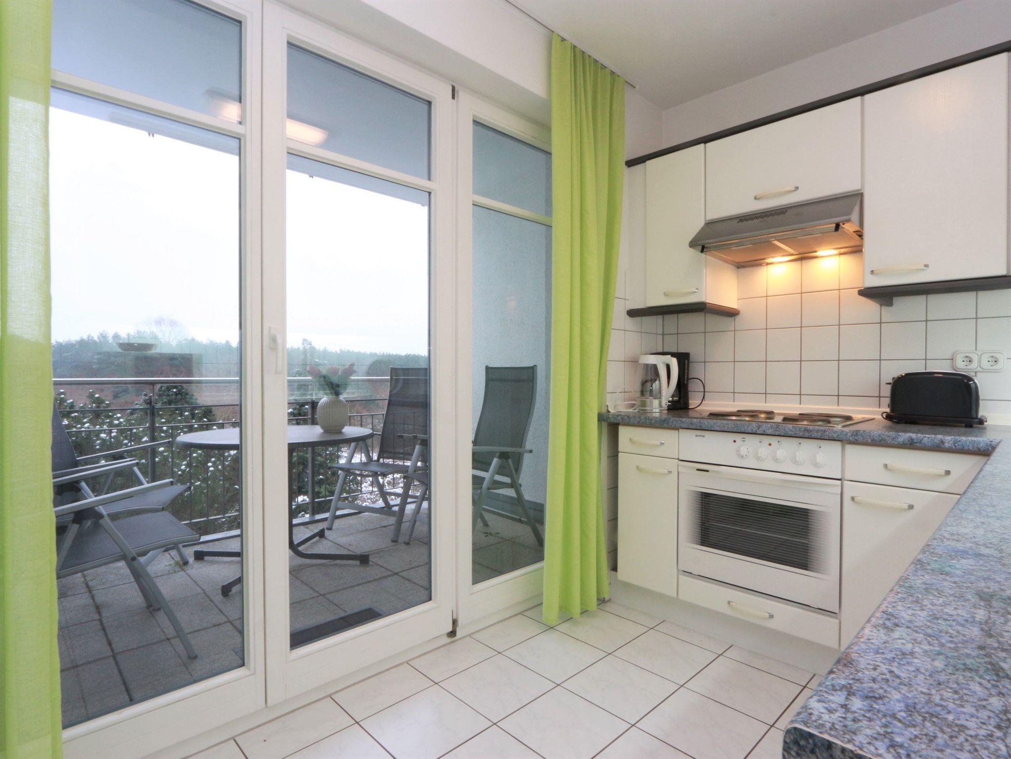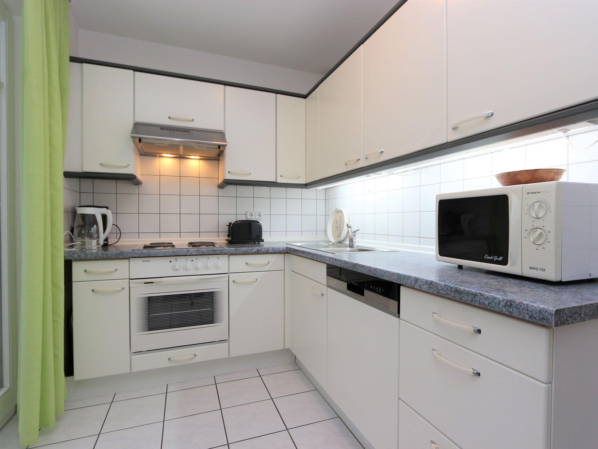 • Komplett eingerichtete Einbauküche mit Geschirrspüler, Herd, Mikrowelle, Kühlschrank mit Gefrierfach, Toaster, Kaffeemaschine, Wasserkocher usw..