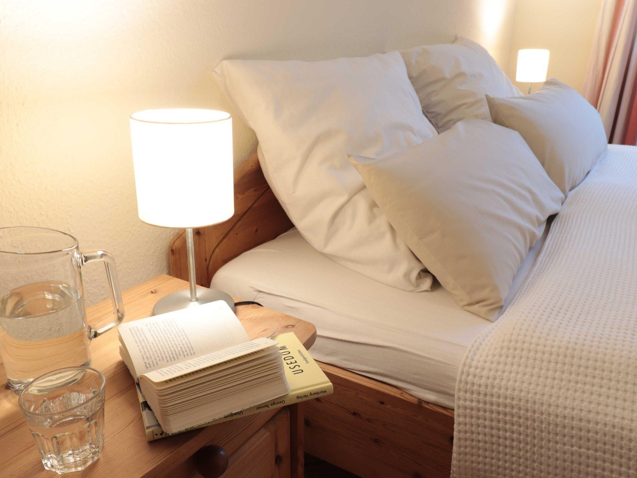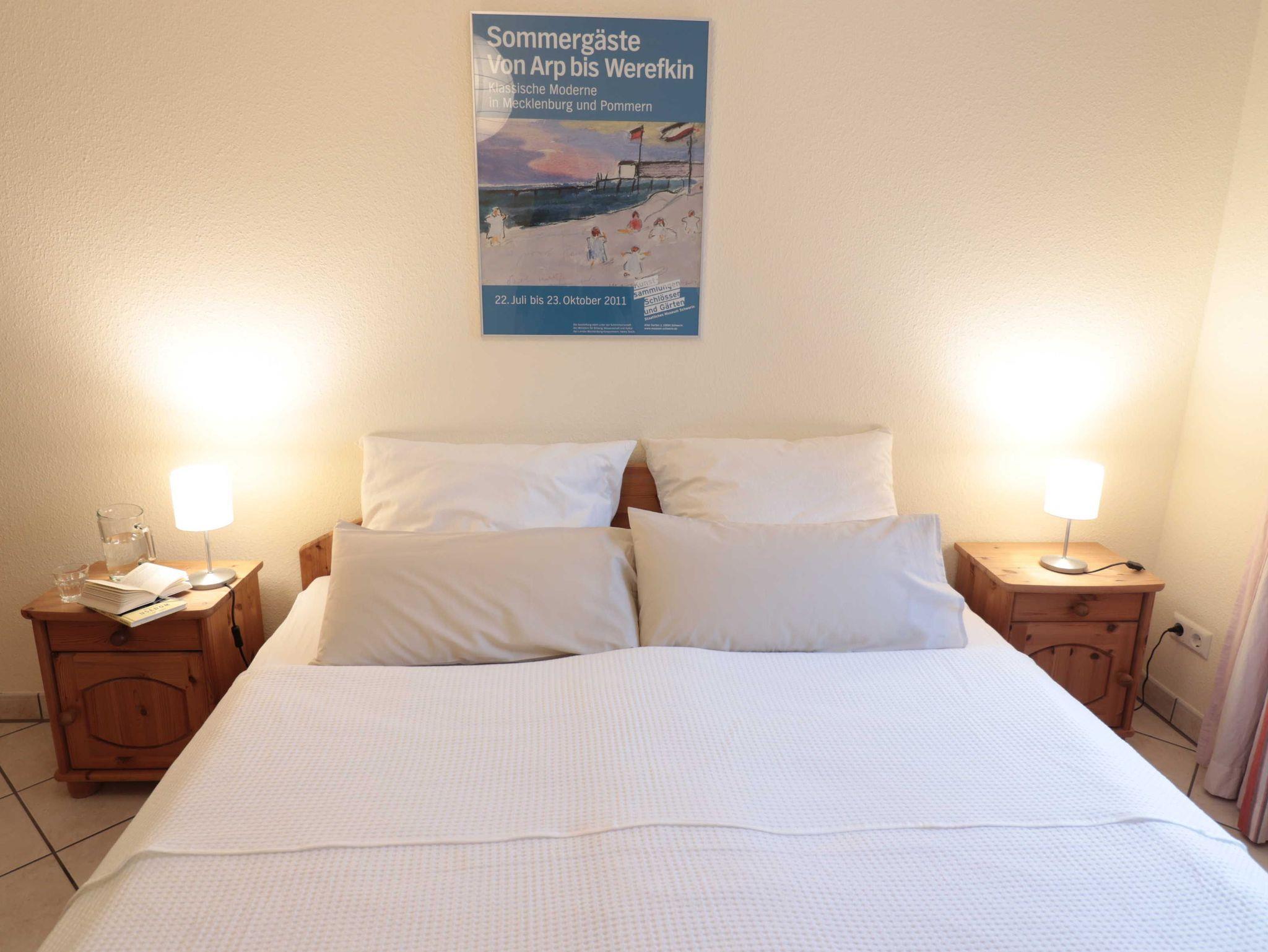 Im Elternschlafzimmer steht ein Ehebett (180 x 200 cm), ein Kleiderschrank, Nachttischchen und ein weiterer Fernseher.