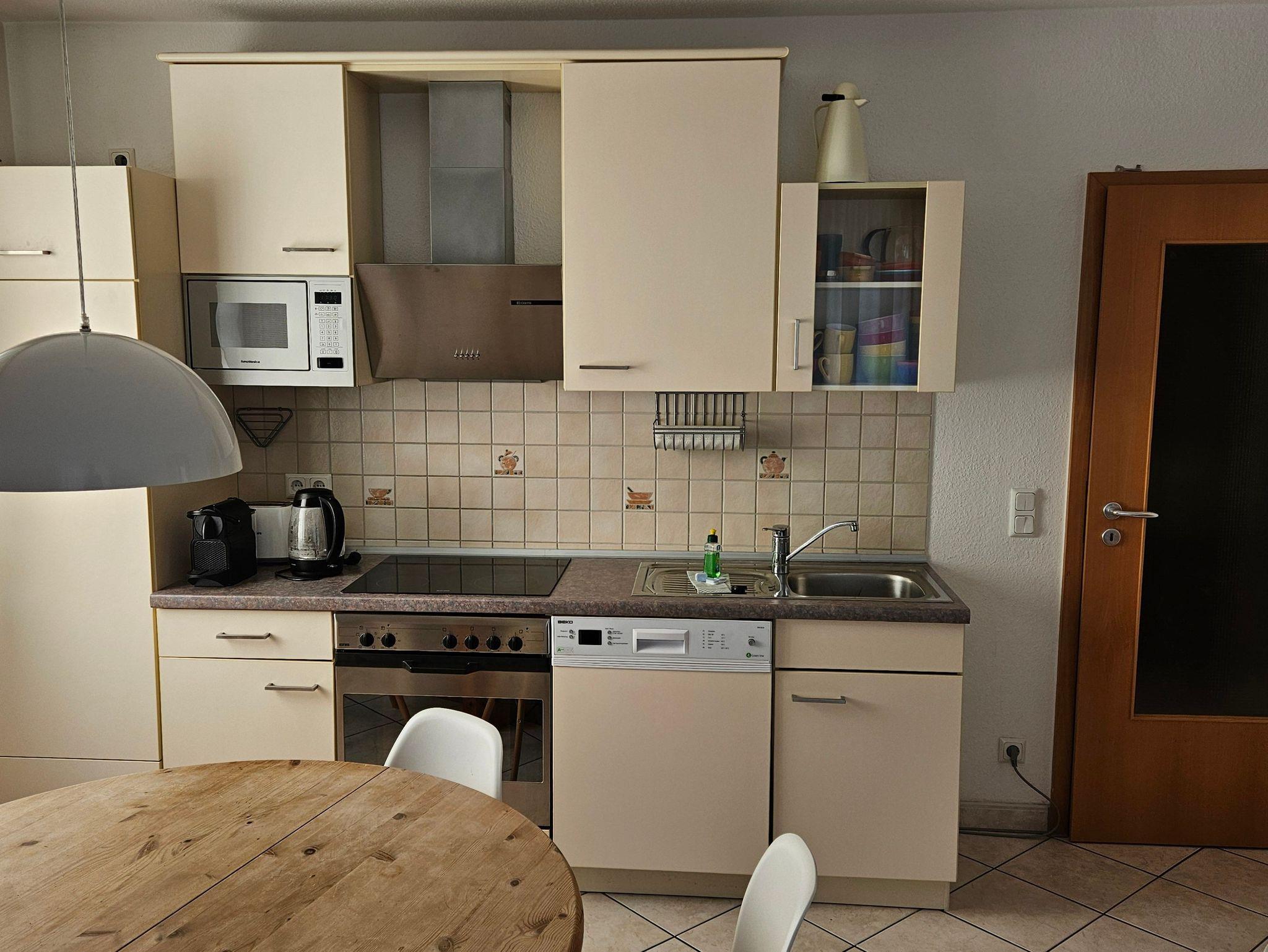 Die vollausgestattete Küchenzimmer im Wohnzimmer verfügt über einen Herd mit vier Kochfeldern und Backofen, Spülmaschine, Kühlschrank mit Gefriereinheit, Mikrowelle, Wasserkocher und einer Nespresso Kapselmaschine.
