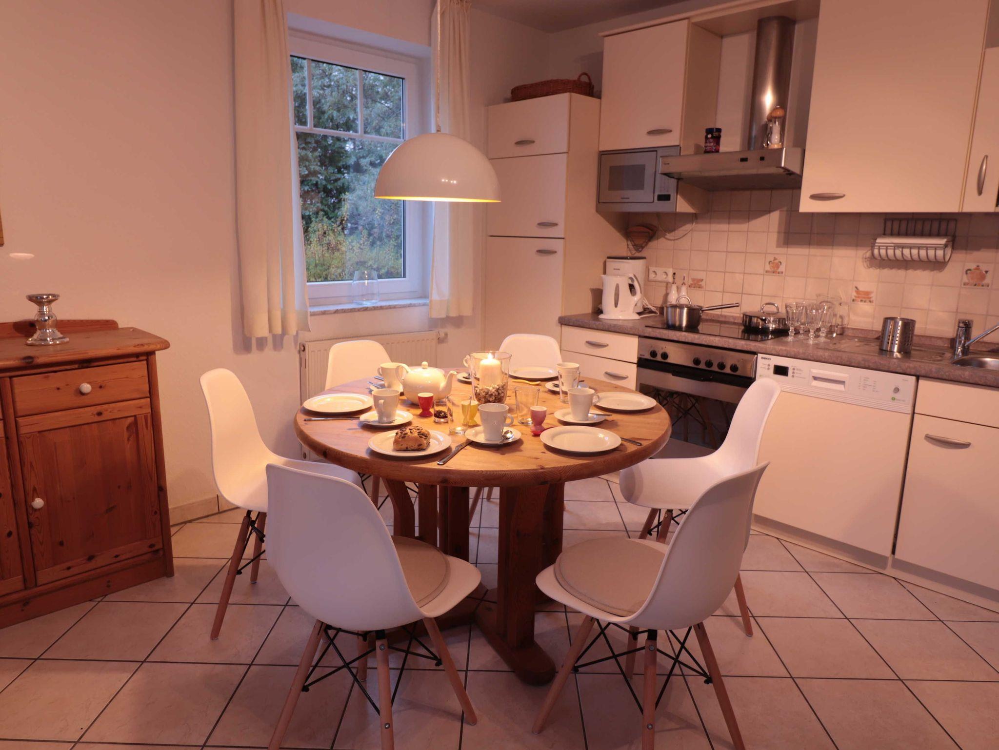 Im Wohnzimmer befindet sich eine Sitzgruppe, bestehend aus Sofa, das bei Bedarf zum Schlafsofa ausgeklappt werden kann, einem großzügigen, bequemen Sessel und einem kleinen Schaukelstuhl mit Kunststoffsitzschale. Der aus Massivholz gearbeitete Esstisch kann erweitert werden, so dass dort bis zu acht Personen Platz finden. Dazu gehören moderne, leichte Esszimmerstühle mit Holzbeinen und Kunststoffsitzschale. In einer Ecke des Wohnzimmersstehen ein Fernseher mit Kabelanschluss, CD/ DVD- Spieler sowie ein Internet/ DAB+ Radio. Die Wohnung ist mit einem eigenen WLAN-Netz versorgt, das Gästen der Wohnung kostenlos zur Verfügung steht. In dem großen Sideboard befinden sich eine Reihe ausgewählter Gesellschaftsspiel und weitere nützliche Utensilien. Alle Möbel sind aus Massivholz und vermitteln eine warme, behagliche Atmosphäre.