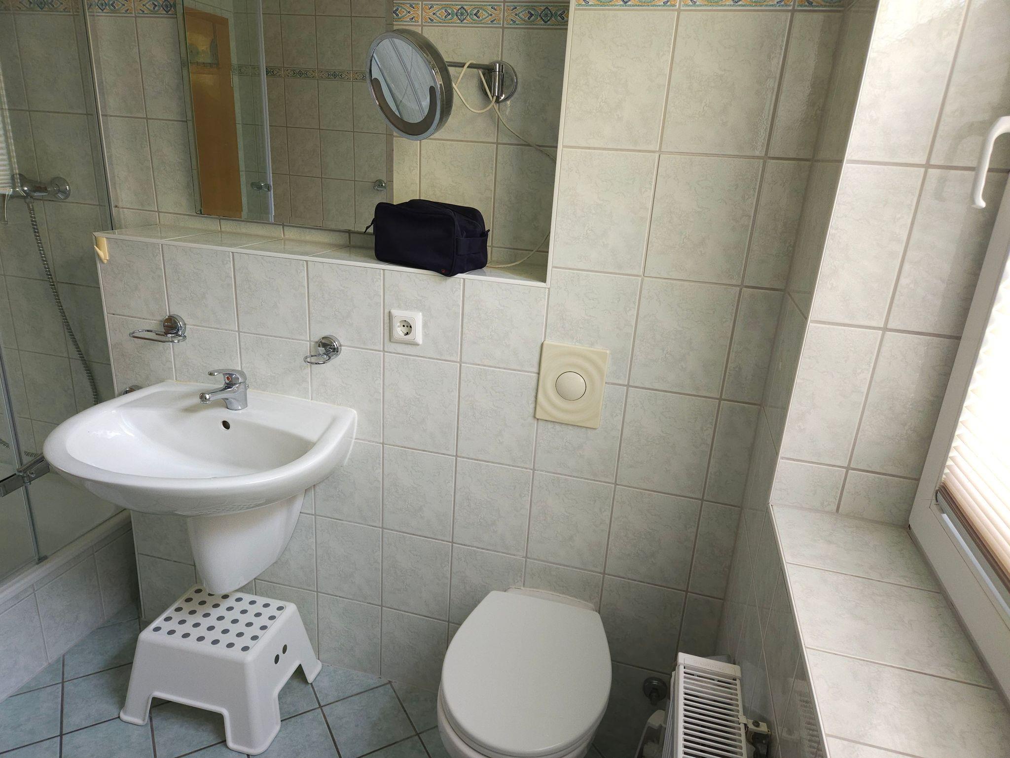 Das durch ein großes Fenster natürlich beleuchtete Bad verfügt über Waschbecke, WC und eine geräumige Dusche mit Schiebetüren. Außerdem findet sich dort eine Waschmaschine zur kostenlosen Nutzung.