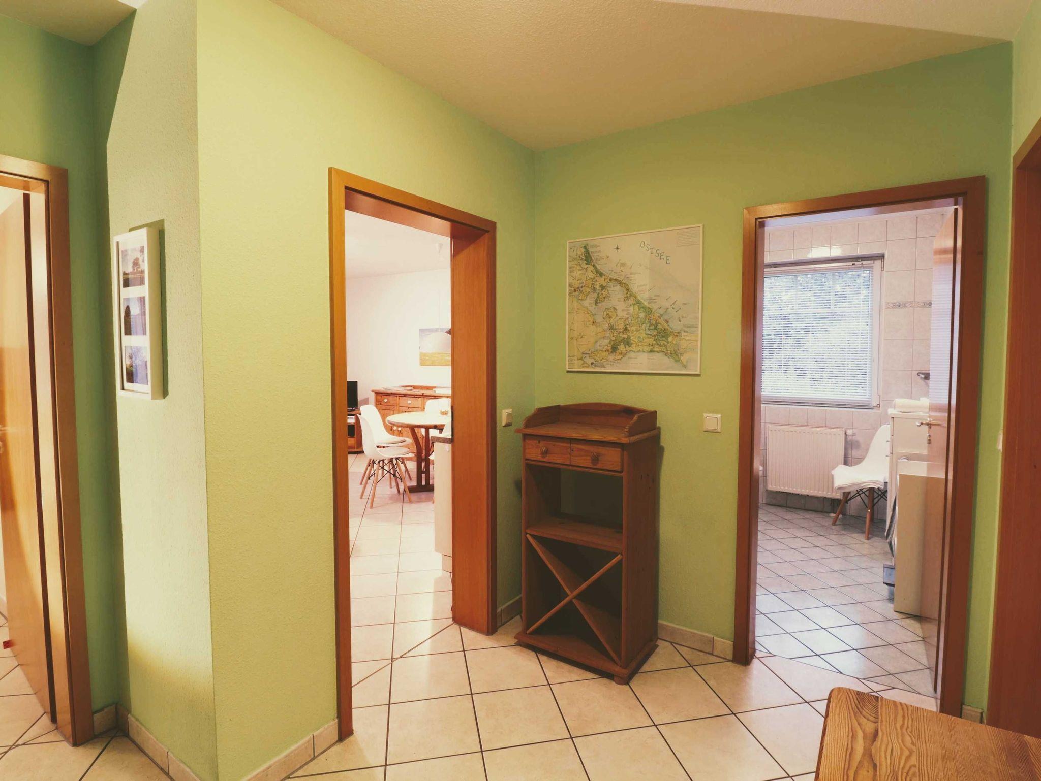 Im zentralen Flur befinden sich Ablagemöglichkeiten für Schlüssel und andere Kleinigkeiten sowie eine Garderobe und Kleiderhaken für Kinderjacken. In der Abseite hinter dem Vorhang werden Stühle und Liegen sowie Reinigungsmaterialien und übrige Haushaltsgegenstände verwahrt. Dort befindet sich auch ein Apothekenschrank, in dem Pflaster und Verbandsmaterialien sowie Desinfektionsmittel für den Sofortbedarf zu finden sind.
