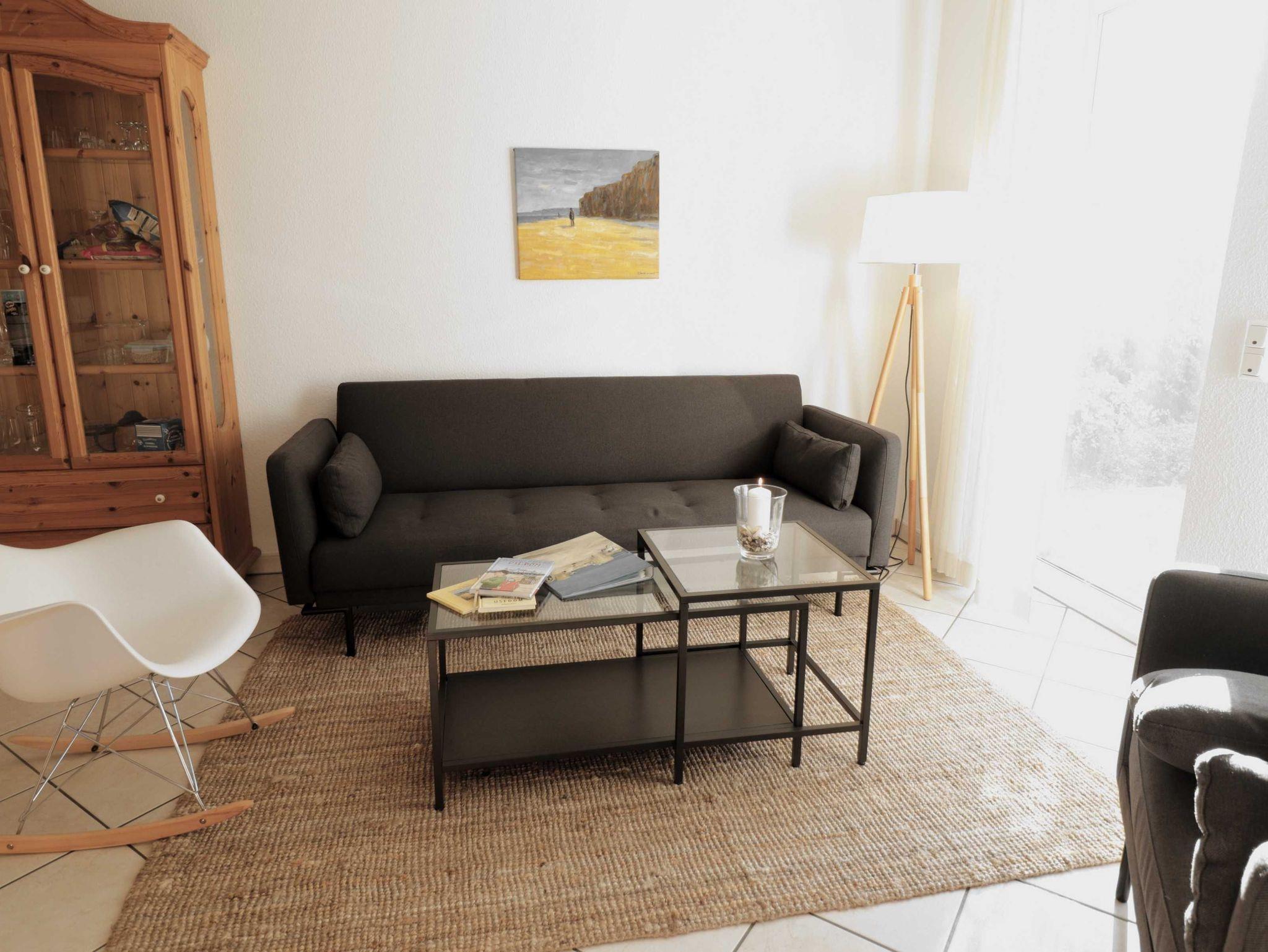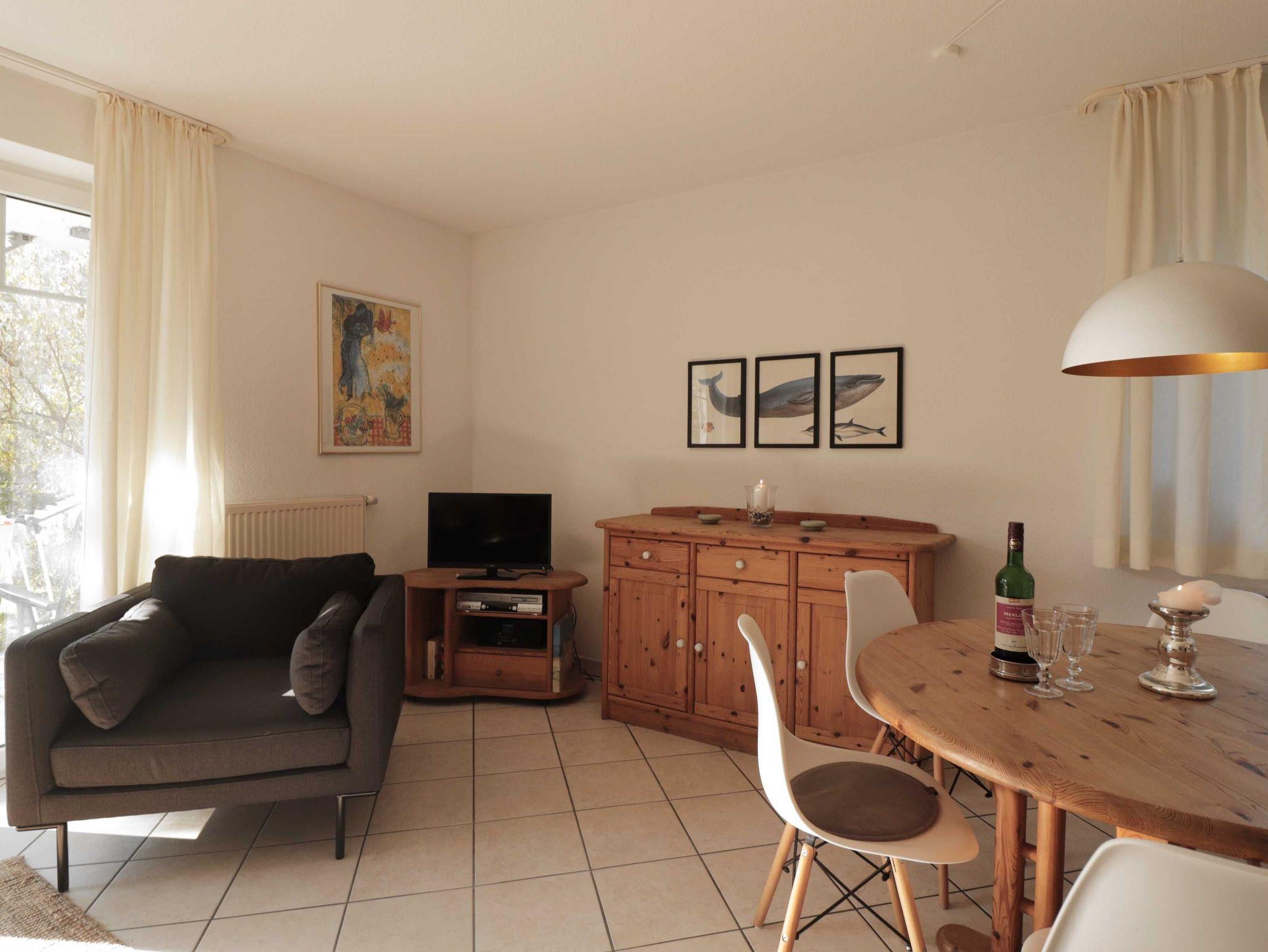 Im Wohnzimmer befindet sich eine Sitzgruppe, bestehend aus Sofa, das bei Bedarf zum Schlafsofa ausgeklappt werden kann und zwei bequemen, rollbaren Sesseln. Der aus Massivholz gearbeitete Esstisch kann erweitert werden, so dass dort bis zu acht Personen Platz finden. In einer Ecke des Wohnzimmersstehen ein Fernseher mit Kabelanschluss, CD/ DVD- Spieler sowie ein Internet/ DAB+ Radio. Die Wohnung ist mit einem eigenen WLAN-Netz versorgt, das Gästen der Wohnung kostenlos zur Verfügung steht. In dem großen Sideboard befinden sich eine Reihe ausgewählter Gesellschaftsspiel und weitere nützliche Utensilien. Alle Möbel sind aus Massivholz und vermitteln eine warme, behagliche Atmosphäre.
