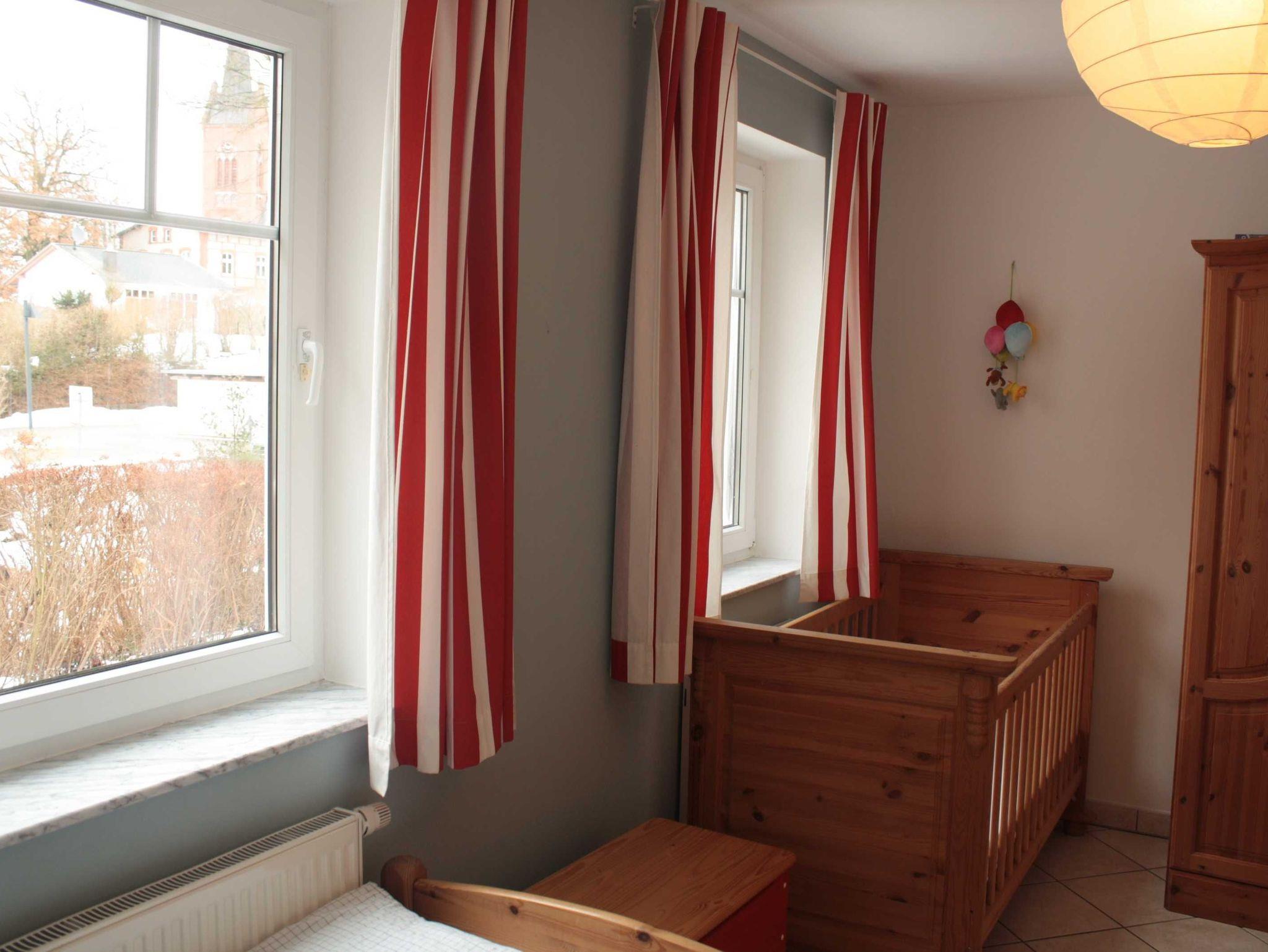 Im Kinderzimmer befinden sich zwei Einzelbetten (90 200 cm) und ein Kindergitterbett (70 x 140 cm). Dort steht auch ein großzügiger Kleiderschrank, eine Wickelkommode und eine Kindertruhe mit Spielzeug.