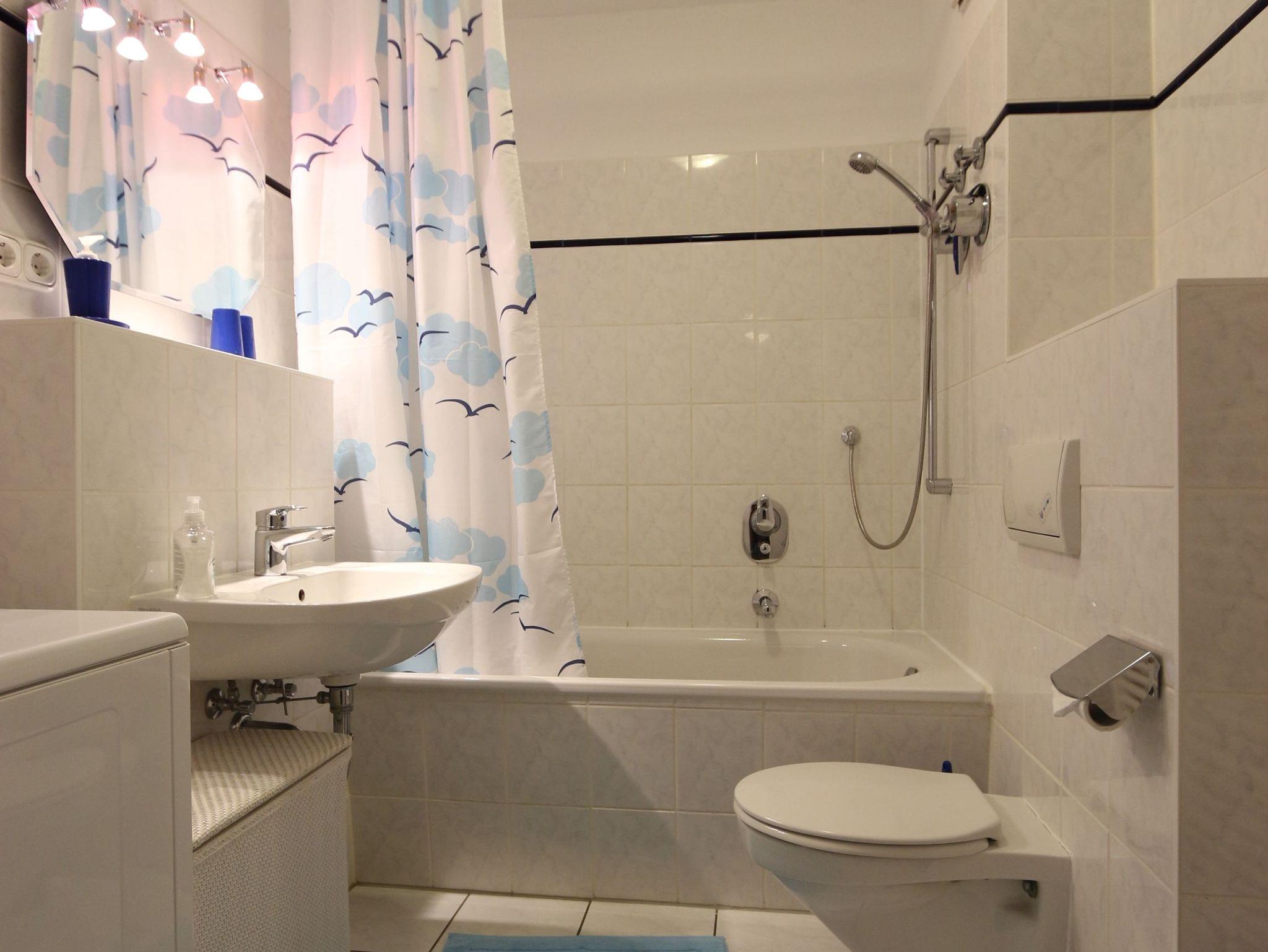 • Ein Badezimmer mit Badewanne, WC, Waschbecken und Handtuchtrockenheizkörper und Waschmaschine (Toplader),