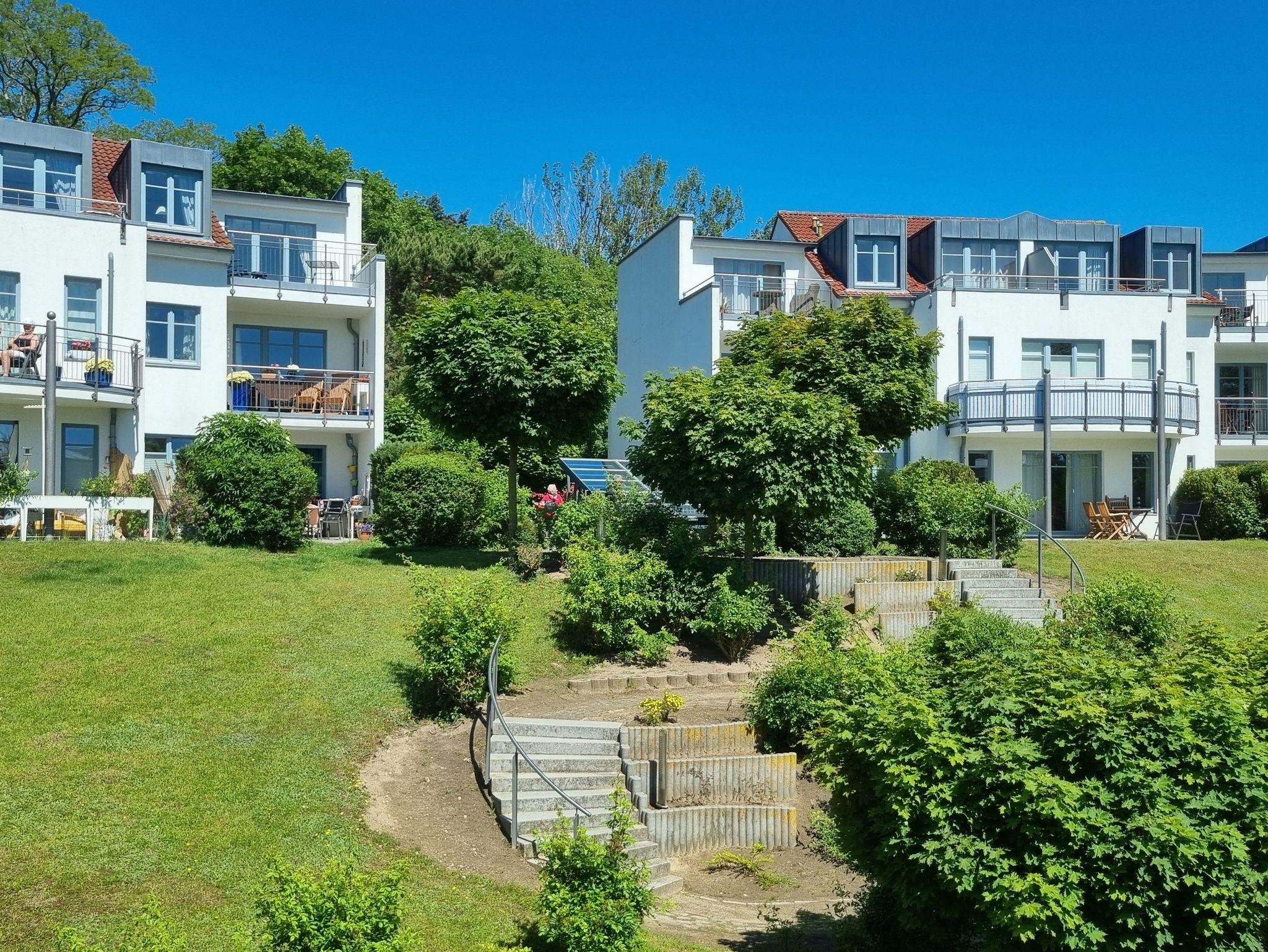 Die Ferienwohnung Nr. 2 mit Terrassen an der Küche und am Wohnzimmer befindet sich im Erdgeschoss in der Residenz Bellevue in 17454 Zinnowitz, Heimweg 7 und bietet einen Blick auf das Umfeld und die Landschaft.