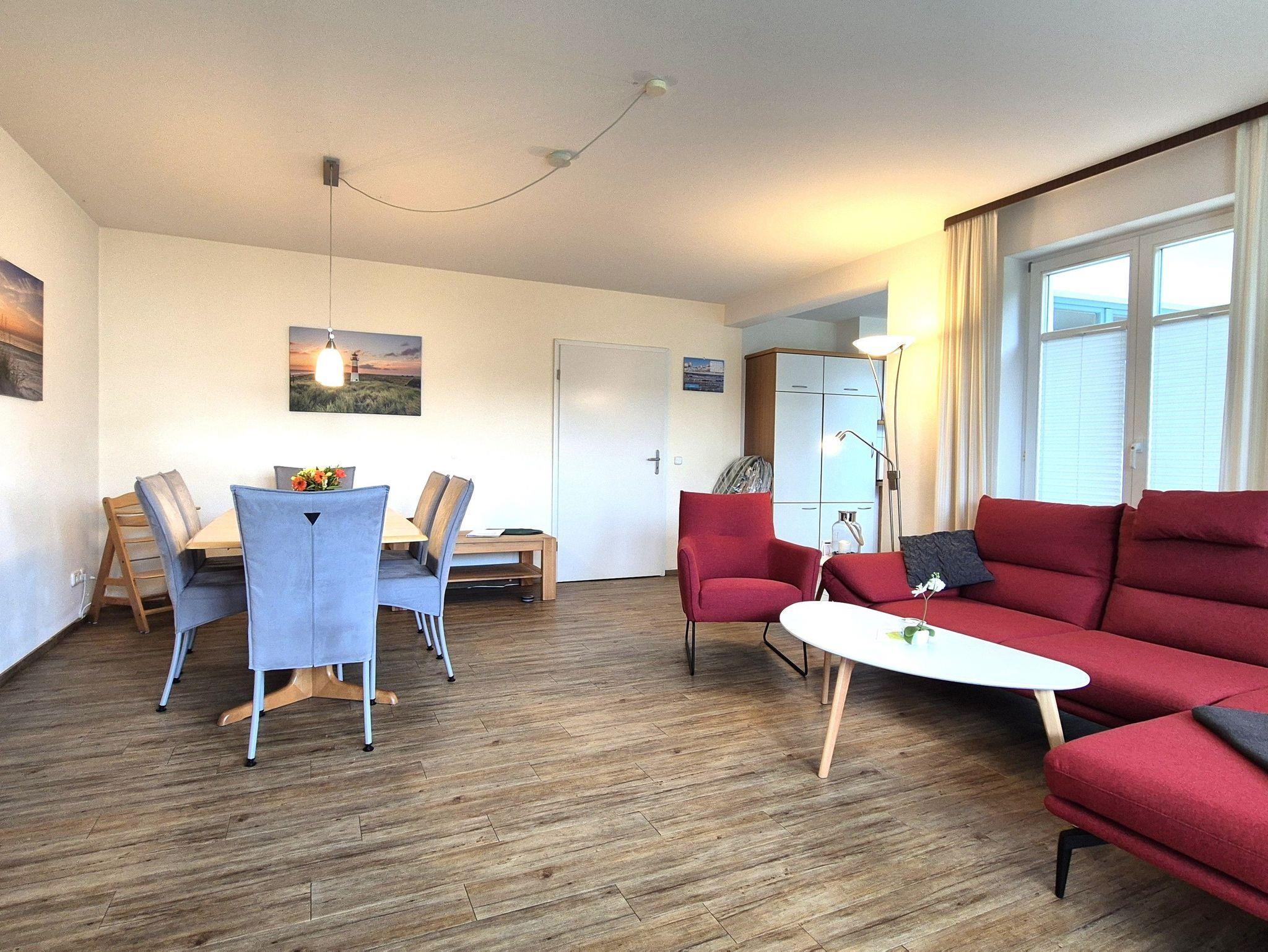 • 1 Wohnzimmer mit 1 Sofa, 1 Couchtisch, 1 Esstisch mit Platz für 4 Personen, einem Flachbild-Fernseher und 1 TV - Schrank.