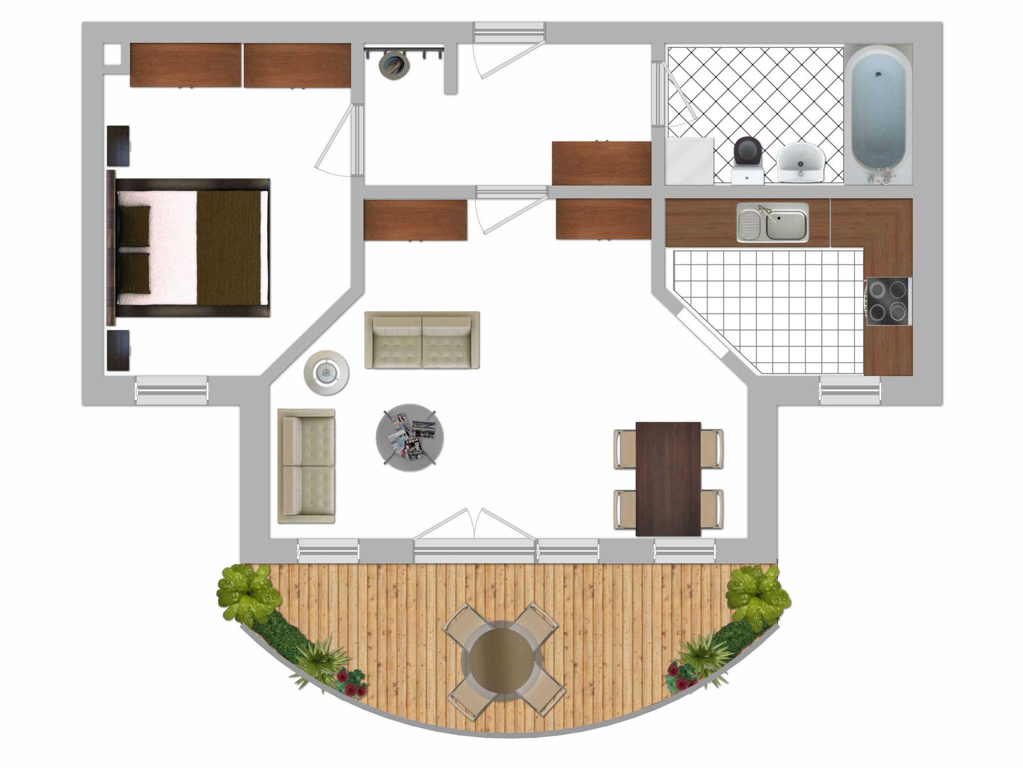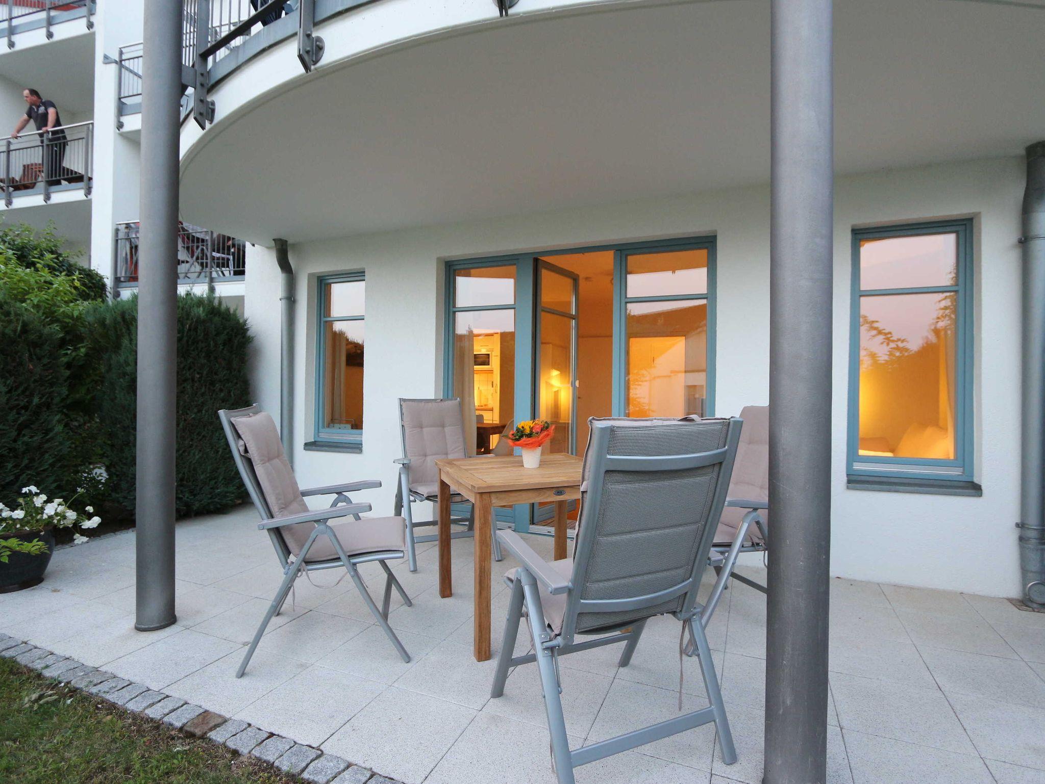 Ferienwohnung (Nr. 32) für bis zu 2 Personen zzgl. einem Kleinkind (ca. 52 m²) im EG mit Wohn- und Esszimmer, 1 Küche, 1 Schlafzimmer, 1 Bad und 1 Terrasse.