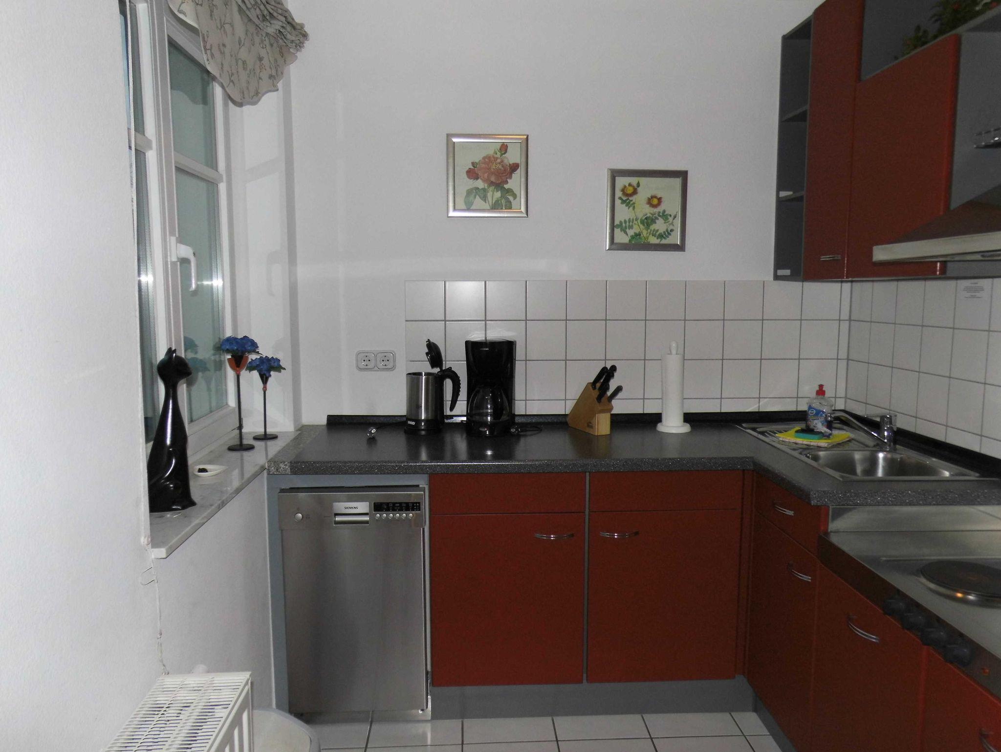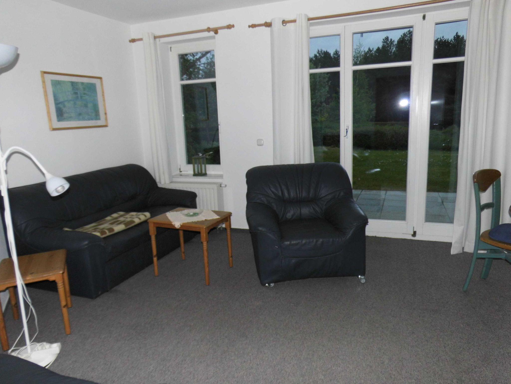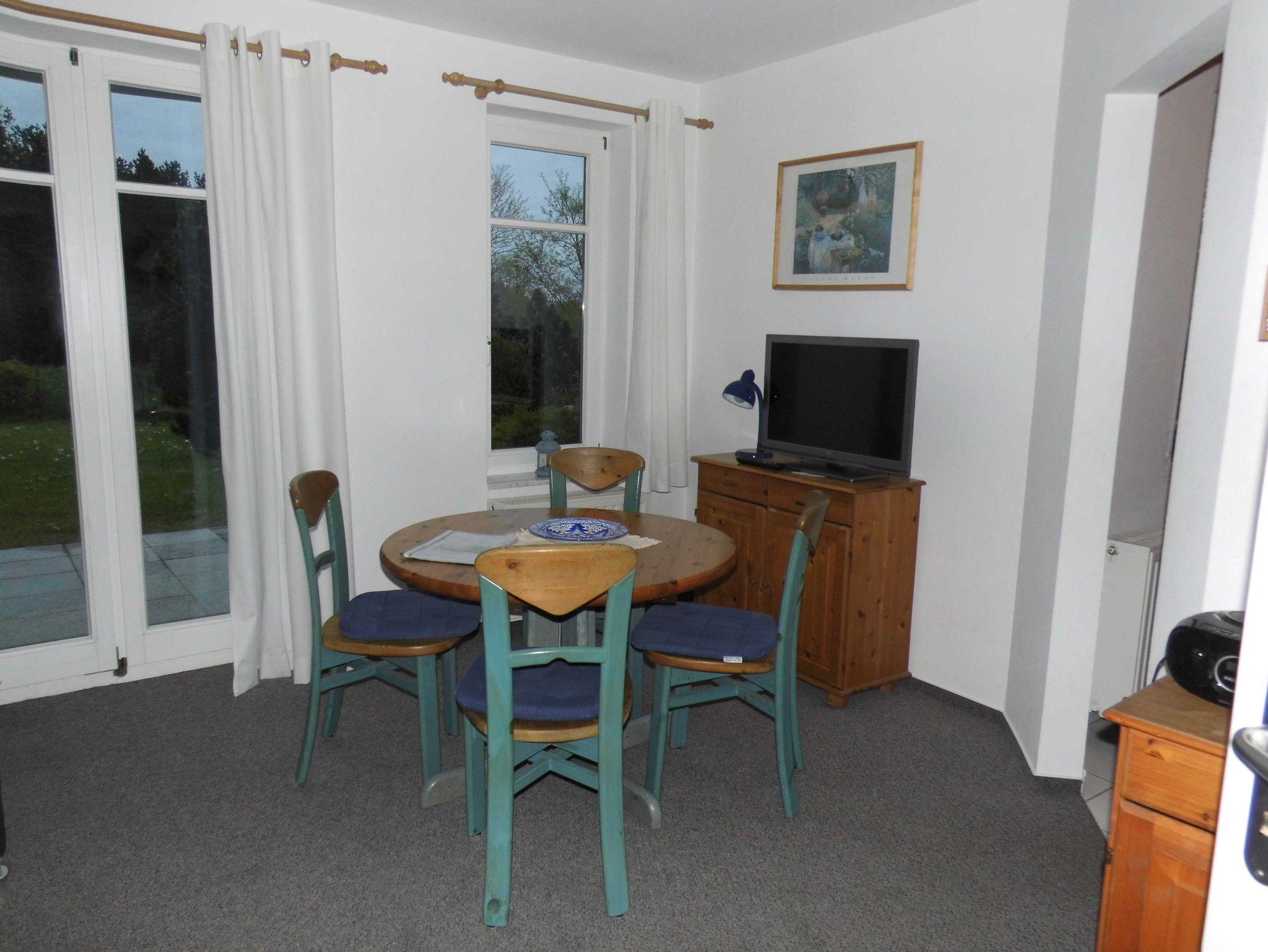 Die Parterre-Wohnung hat eine Terrasse die nach Süden ausgerichtet ist; mit 4 Terrassenstühlen, Tisch und Sonnenschirm. Die Wohnung ist hell und freundlich eingerichtet und verfügt über SAT-TV, CD-Player, und Radio. Eine gut ausgestattete Küche mit vollständigem Geschirr, Küchengeräten,Geschirrspüler, Kaffeemaschine, Wasserkocher und Toaster sind vorhanden. Schlafzimmer mit Doppelbett für 2 Personen; Wohnzimmer mit Schlafsofa für 2 Personen; Babyreisebett kann gemietet werden.