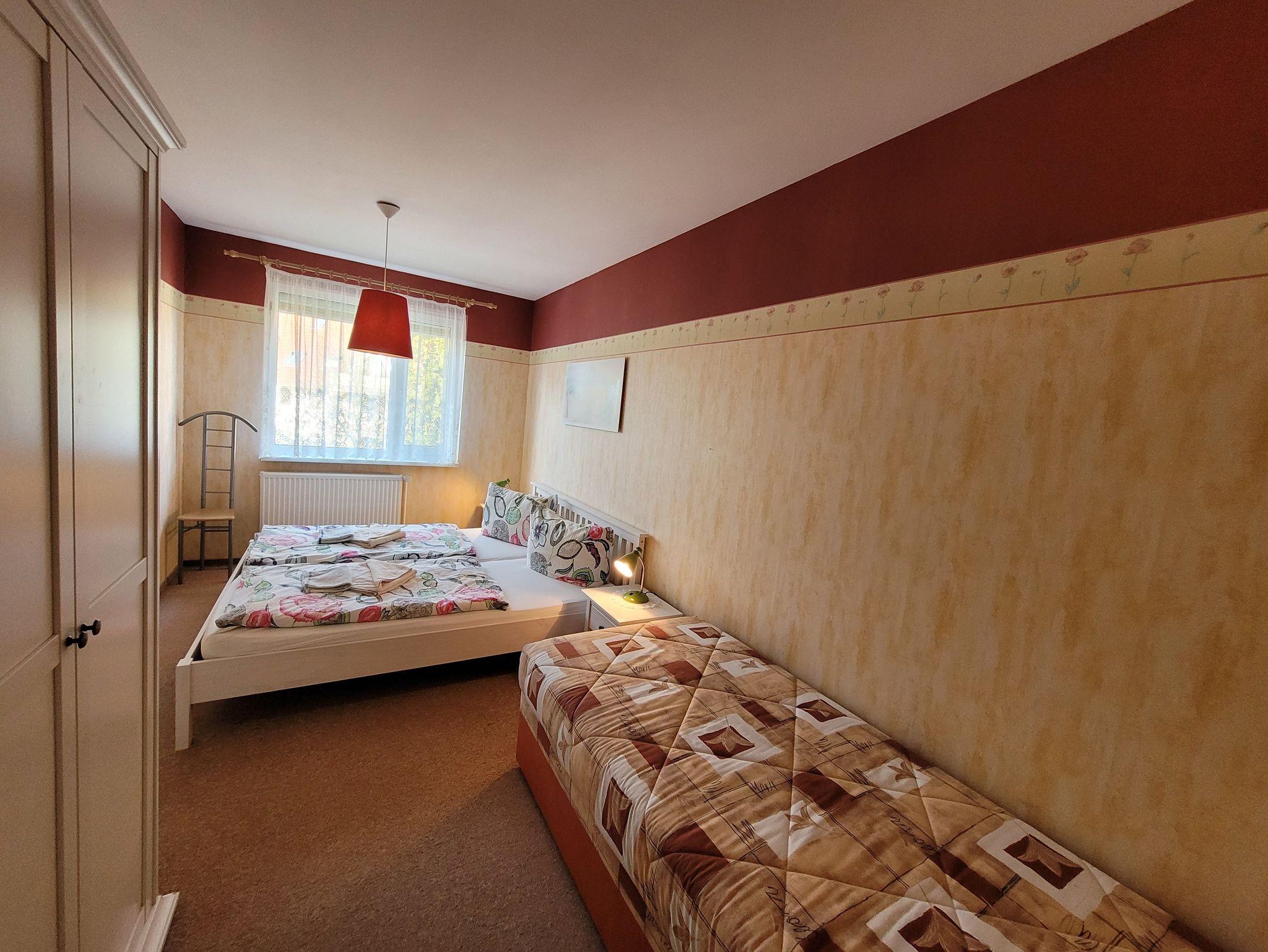 Unser Ferienhaus liegt ca.15 Geh-Minuten vom Strand entfernt in einer ruhigen Wohnlage. Die komplett eingerichtete Ferienwohnung mit Wohnzimmer, ein Schlafzimmer mit einem Ehebett und einer Liege, Küchenzeile, Dusche, WC, Flur und großem Balkon/Terrasse würde für Sie bereitstehen. Zur Ausstattung gehören weiter Radio, Fernseher, einmalig Bettwäsche und Handtücher. In der Küchenzeile sind Mikrowelle, Kaffeemaschine und Toaster, Eier-und Wasserkocher sowie ein 2-Platten-Kocher, Kühlschrank und Geschirr vorhanden. Eine Aufbettung ist im Wohnzimmer nach Absprache auf dem ausziehbarem Sofa möglich. Zu jeder Wohnung gehört ein kostenloser Parkplatz für Ihr Auto. In dieser Wohnung sind k e i n e Haustiere erlaubt!