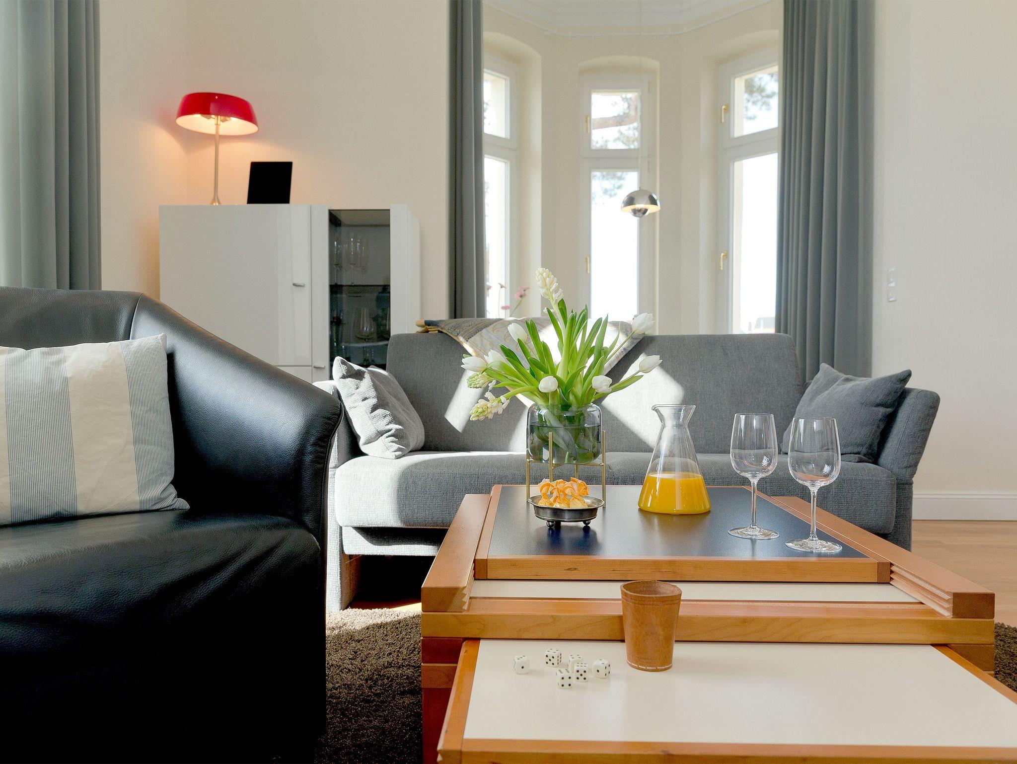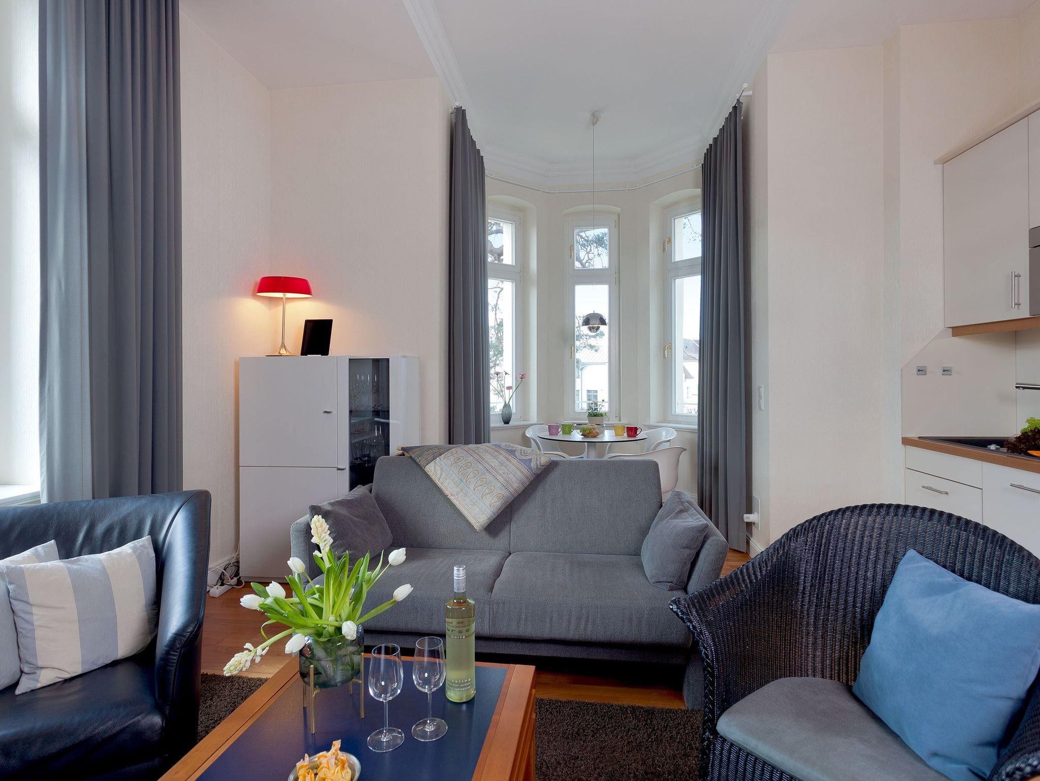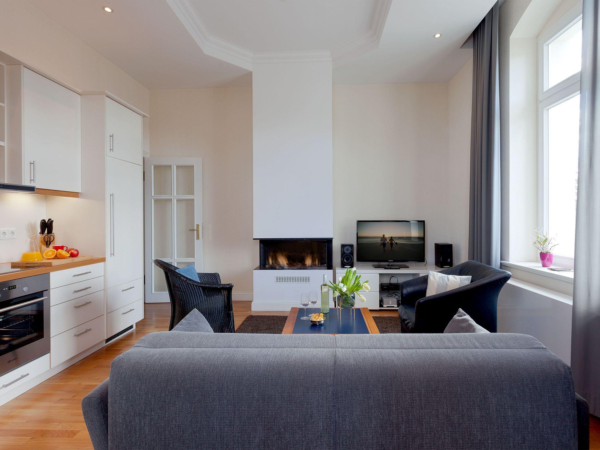Im Wohnbereich lässt sich eine Couch im Handumdrehen zum Schlafgemach für die 5. und 6. Person verwandeln. Bei der Einrichtung des Appartements sind Mobiliar, Materialien und farbliche Akzente exakt aufeinander abgestimmt worden. Große Fenster sorgen für besondere Lichtspiele, insbesondere in dem am Wohnbereich angrenzend traumhaften Erker, der mit einem gemütlichen Esstisch aufwartet. Das kulinarische Menü bereiten Sie in der, mit allen Extras ausgestatteten, offenen Küche (Backofen, Kühlschrank mit Gefrierfach, Geschirrspüler, Mikrowelle, Wasserkocher, Toaster, Kaffeemaschine) zu. Gaskamin, Flat-TV (im Wohnbereich und in einem der Schlafzimmer) und ein WLAN-Anschluss komplettieren den Urlaubsgenuss.