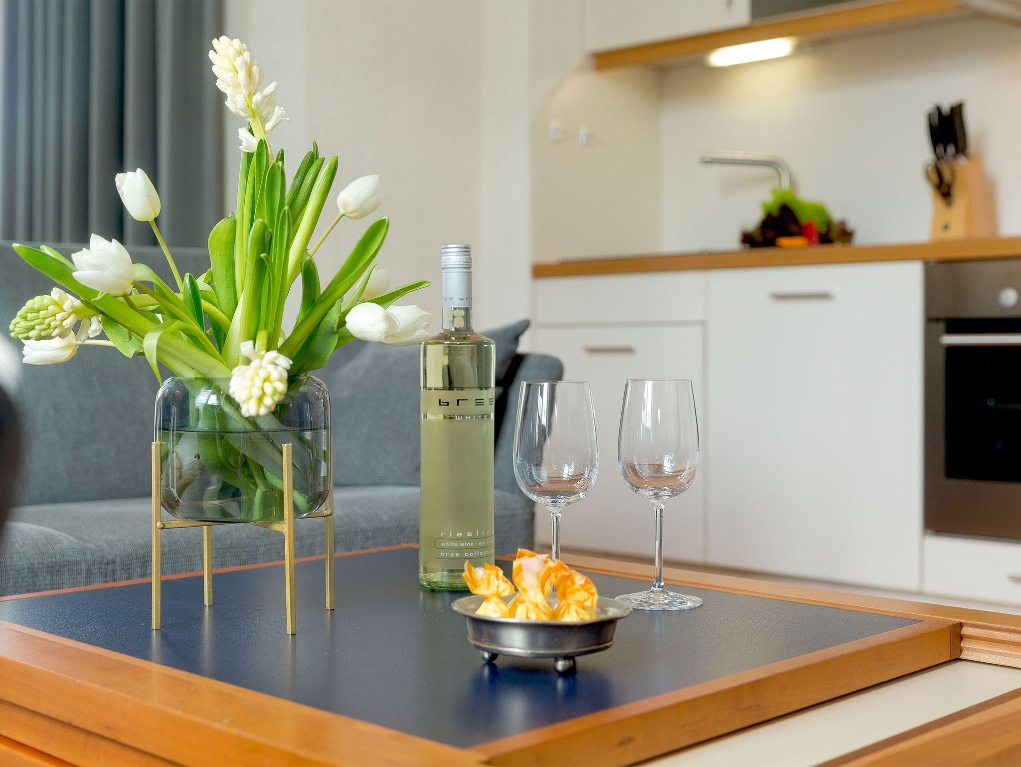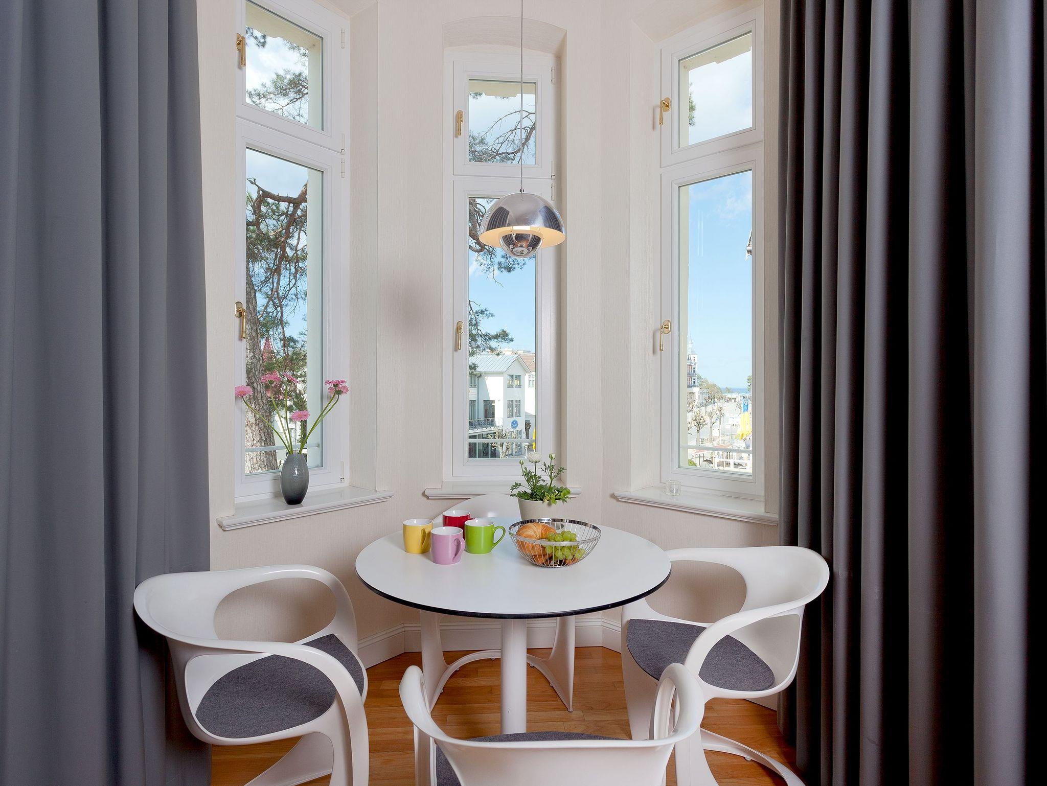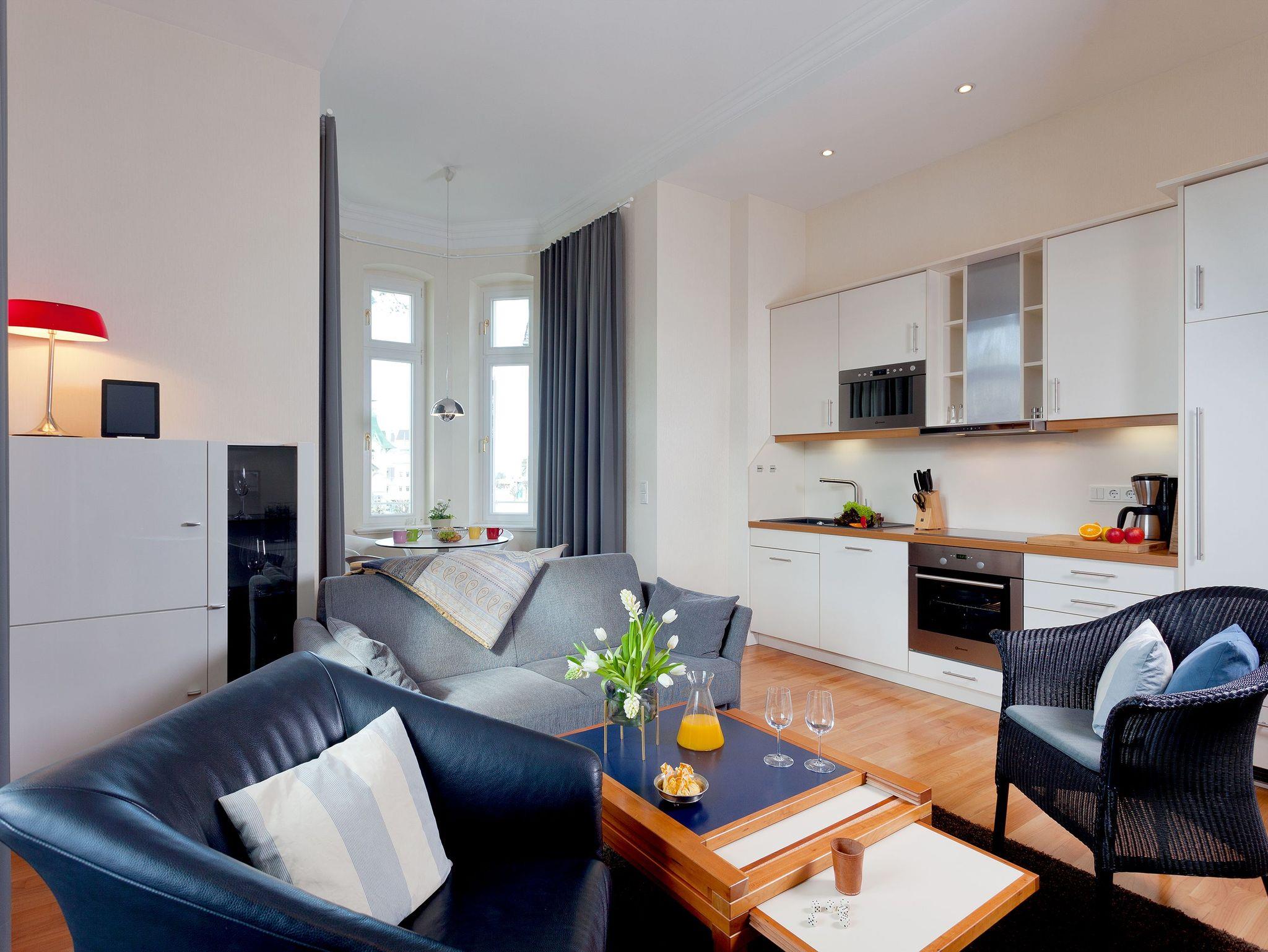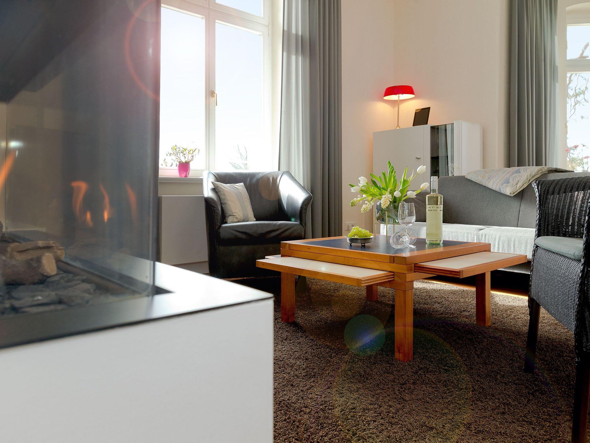 Im Wohnbereich lässt sich eine Couch im Handumdrehen zum Schlafgemach für die 5. und 6. Person verwandeln. Bei der Einrichtung des Appartements sind Mobiliar, Materialien und farbliche Akzente exakt aufeinander abgestimmt worden. Große Fenster sorgen für besondere Lichtspiele, insbesondere in dem am Wohnbereich angrenzend traumhaften Erker, der mit einem gemütlichen Esstisch aufwartet. Das kulinarische Menü bereiten Sie in der, mit allen Extras ausgestatteten, offenen Küche (Backofen, Kühlschrank mit Gefrierfach, Geschirrspüler, Mikrowelle, Wasserkocher, Toaster, Kaffeemaschine) zu. Gaskamin, Flat-TV (im Wohnbereich und in einem der Schlafzimmer) und ein WLAN-Anschluss komplettieren den Urlaubsgenuss.