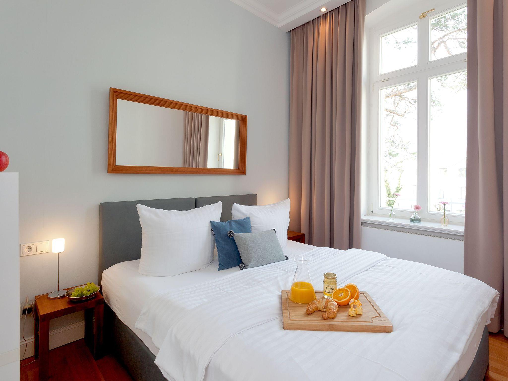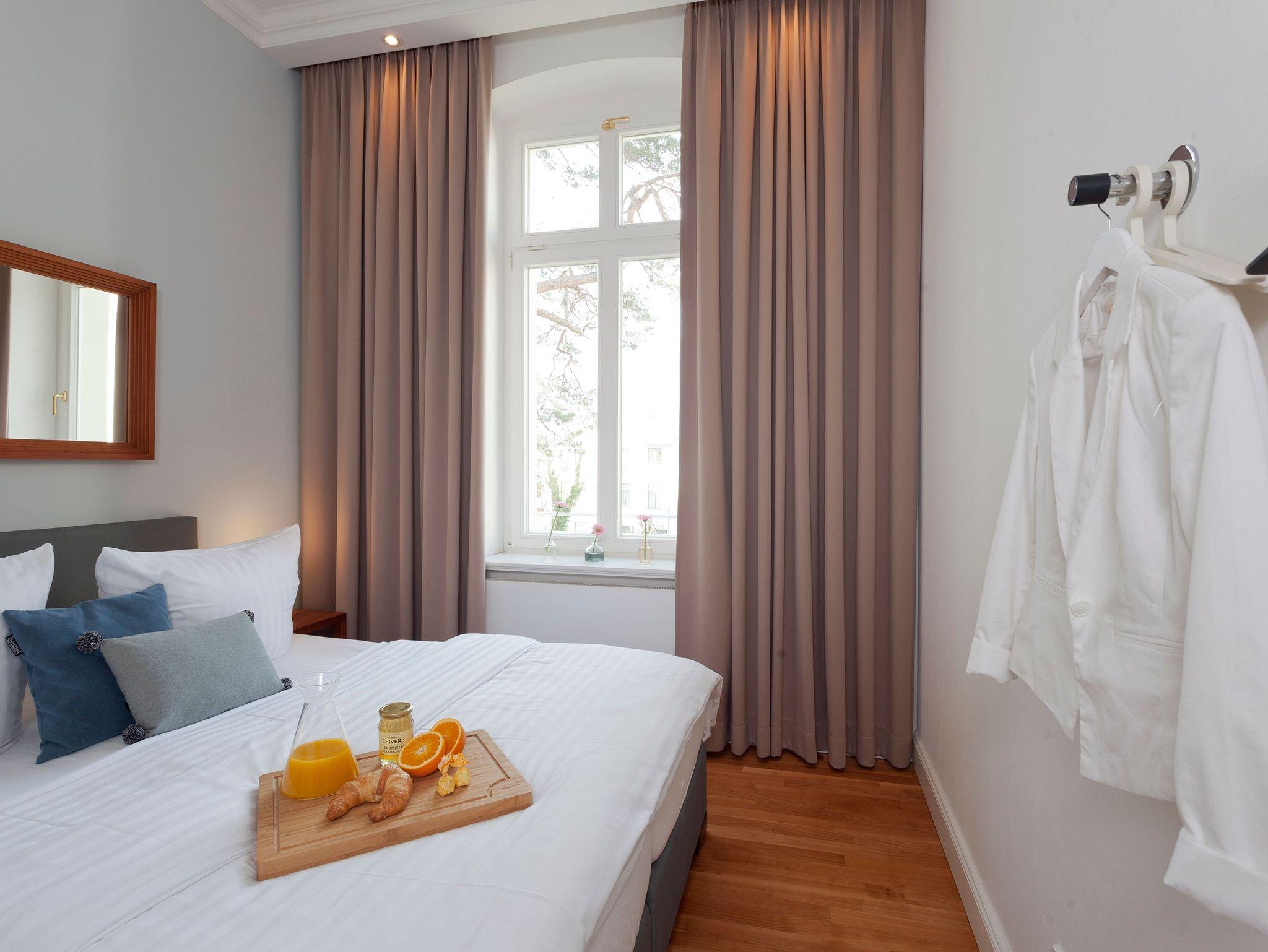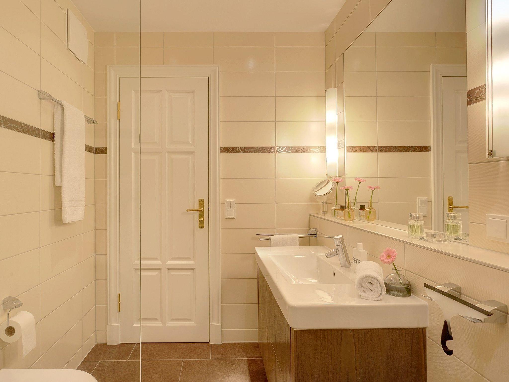 Das 3-Zimmer-Appartement liegt im 1. Obergeschoss der Villa Gruner und verfügt über einen kombinierten Wohn- Koch und Essbereich, zwei Schlafräume mit je einem Doppelbett (je 180 x 200cm / zwei getrennte Matratzen) und ein großzügiges Badezimmer mit ebenerdiger Echtglasdusche, WC und einem Haarfön.