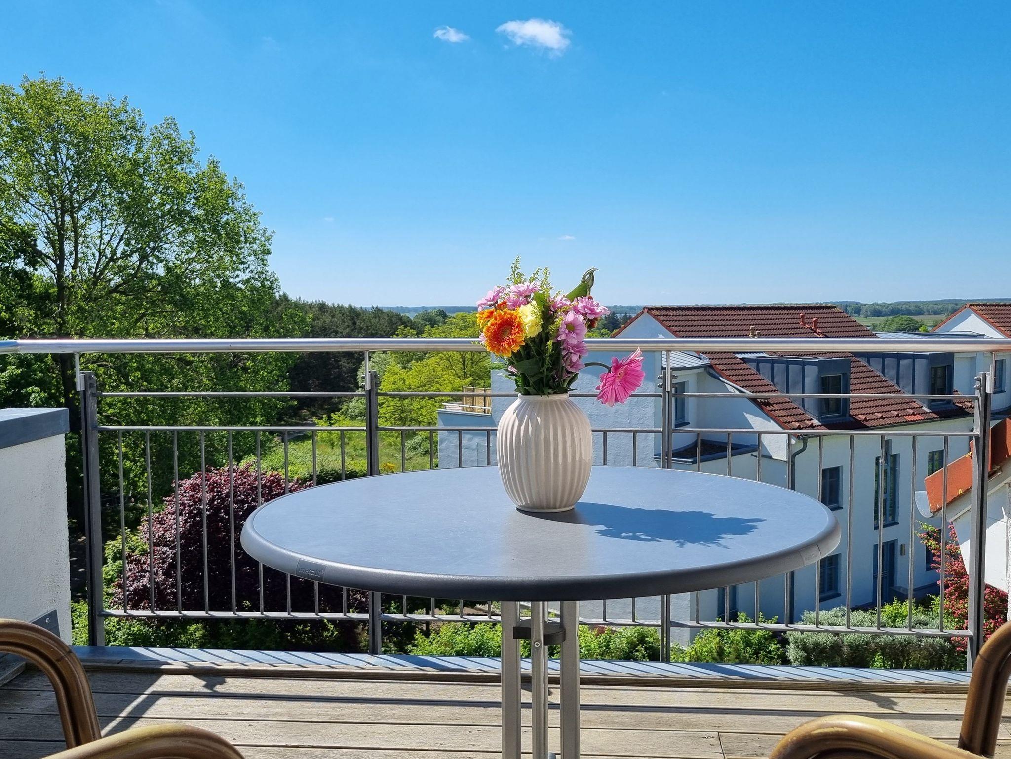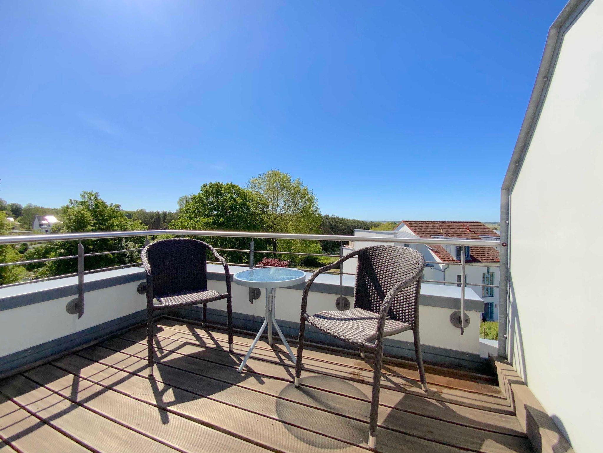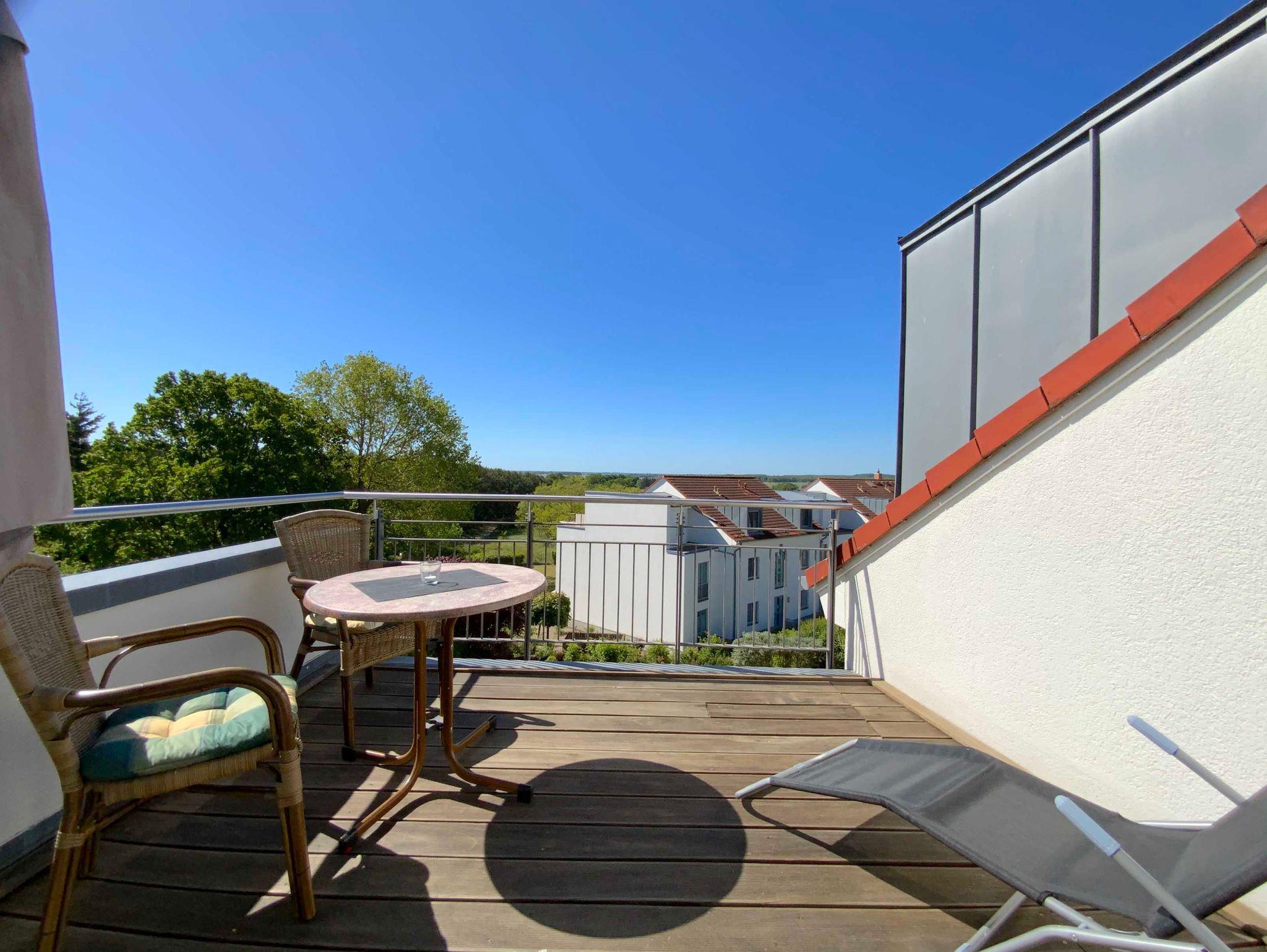 Ferienwohnungsvermittlung Herrmann bietet Ihnen hier eine großzügige 2-Zimmer-Ferienwohnung (ca. 62 m²) mit exklusiver Ausstattung. Die Penthousewohnung mit 2 Dachterrassen (Wohnung 38) befindet sich im 2. Obergeschoss der Residenz Bellevue in 17454 Zinnowitz, Heimweg 11 und bietet einen herrlichen Blick auf das Umfeld und die Landschaft mit Wald und Achterwasser.