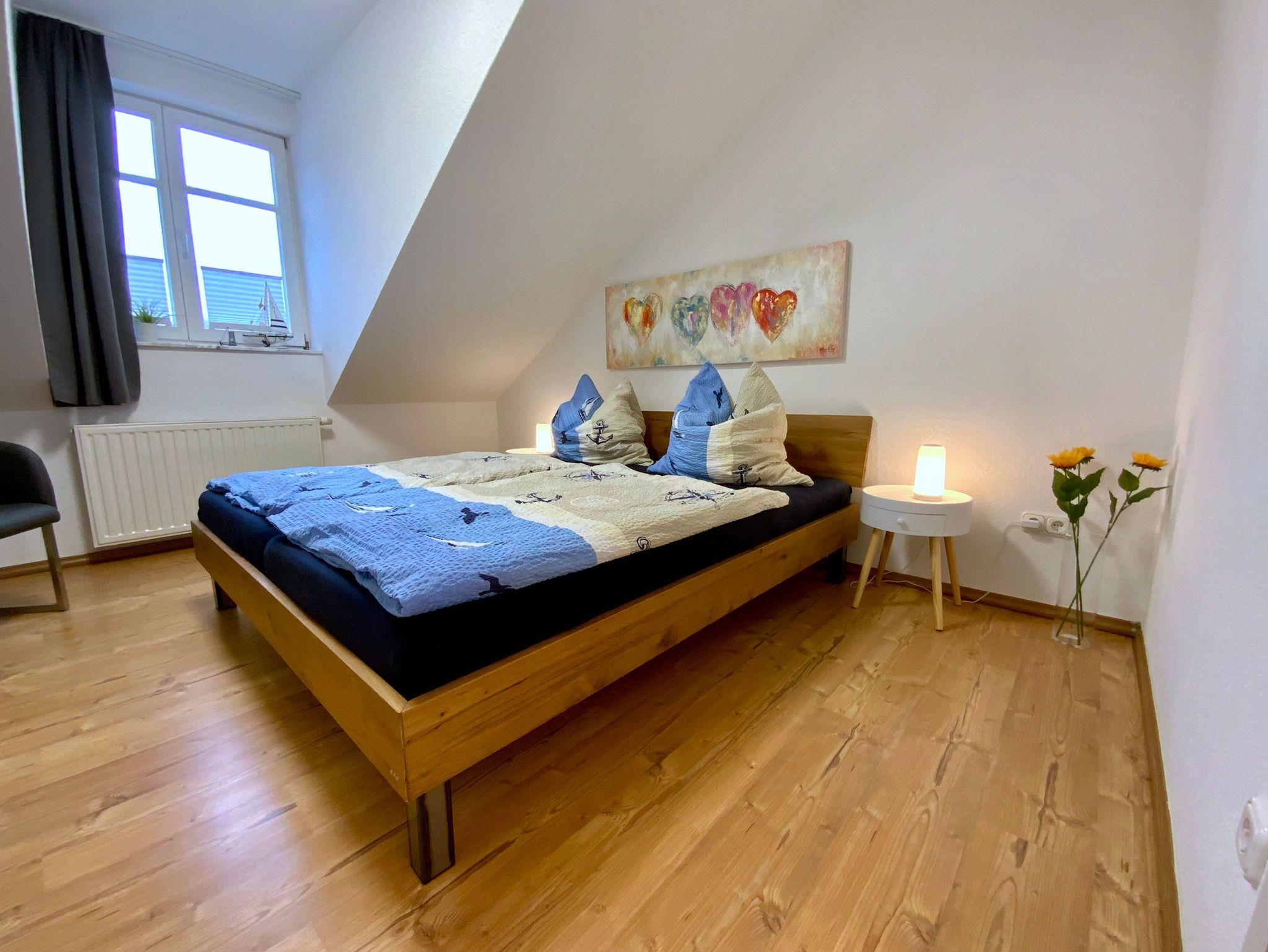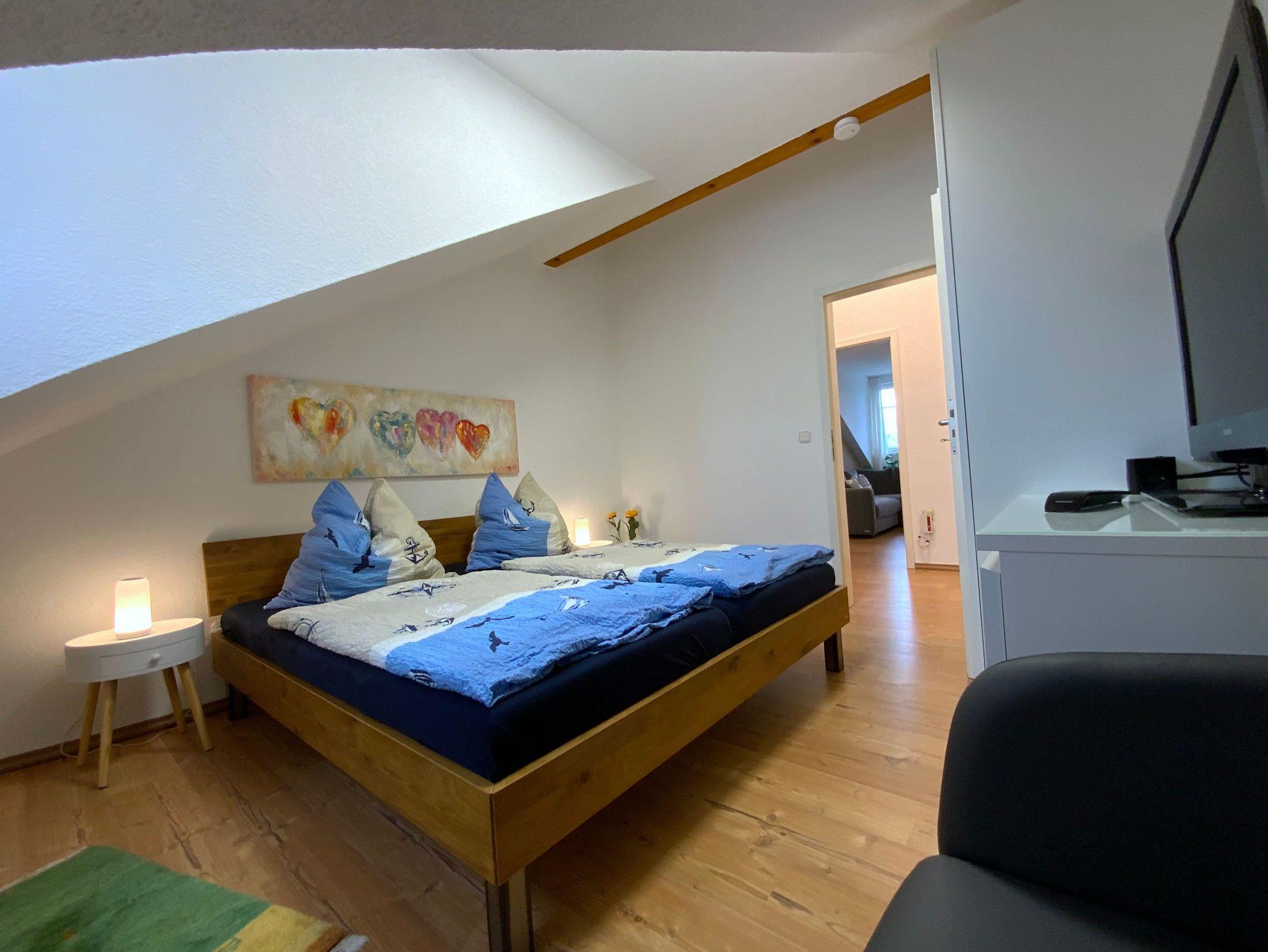 • modernes Schlafzimmer mit Massivholz-Doppelbett (Liegefläche 180 x 200 cm) in Komforthöhe. Geräumiger Kleiderschrank, Nachttischen und dimmbaren Lampen, Kommode, Sessel, Safe und Flachbildfernseher;