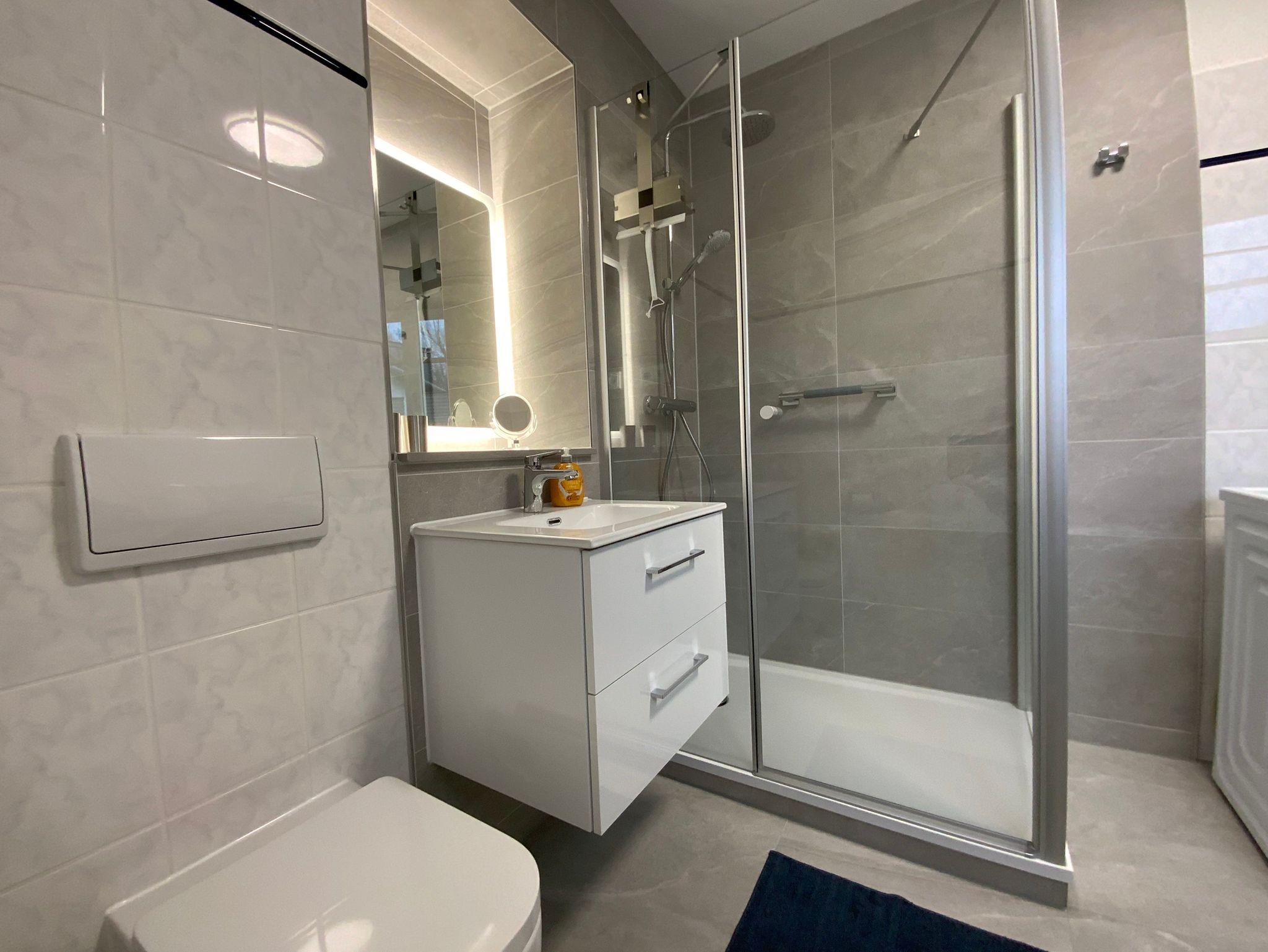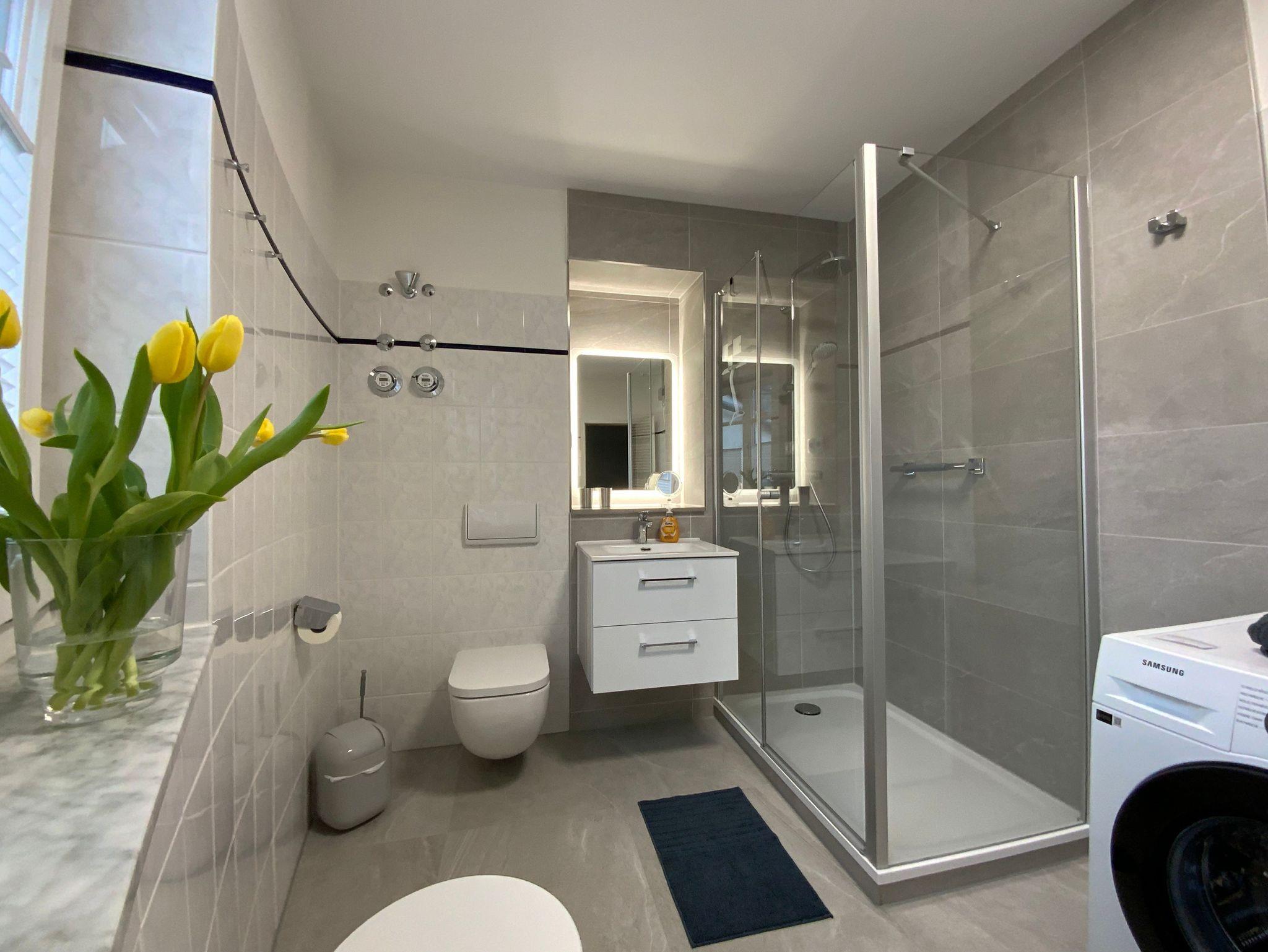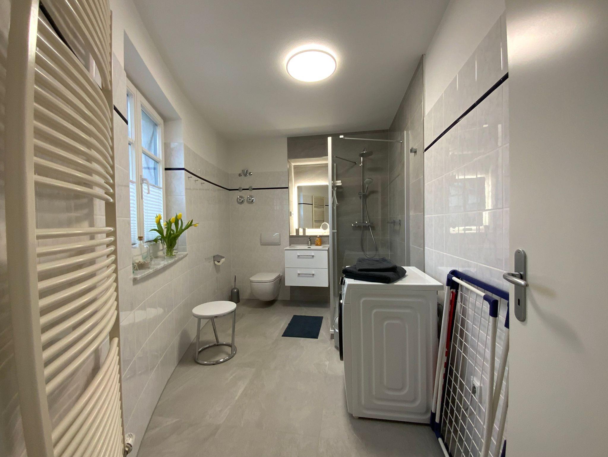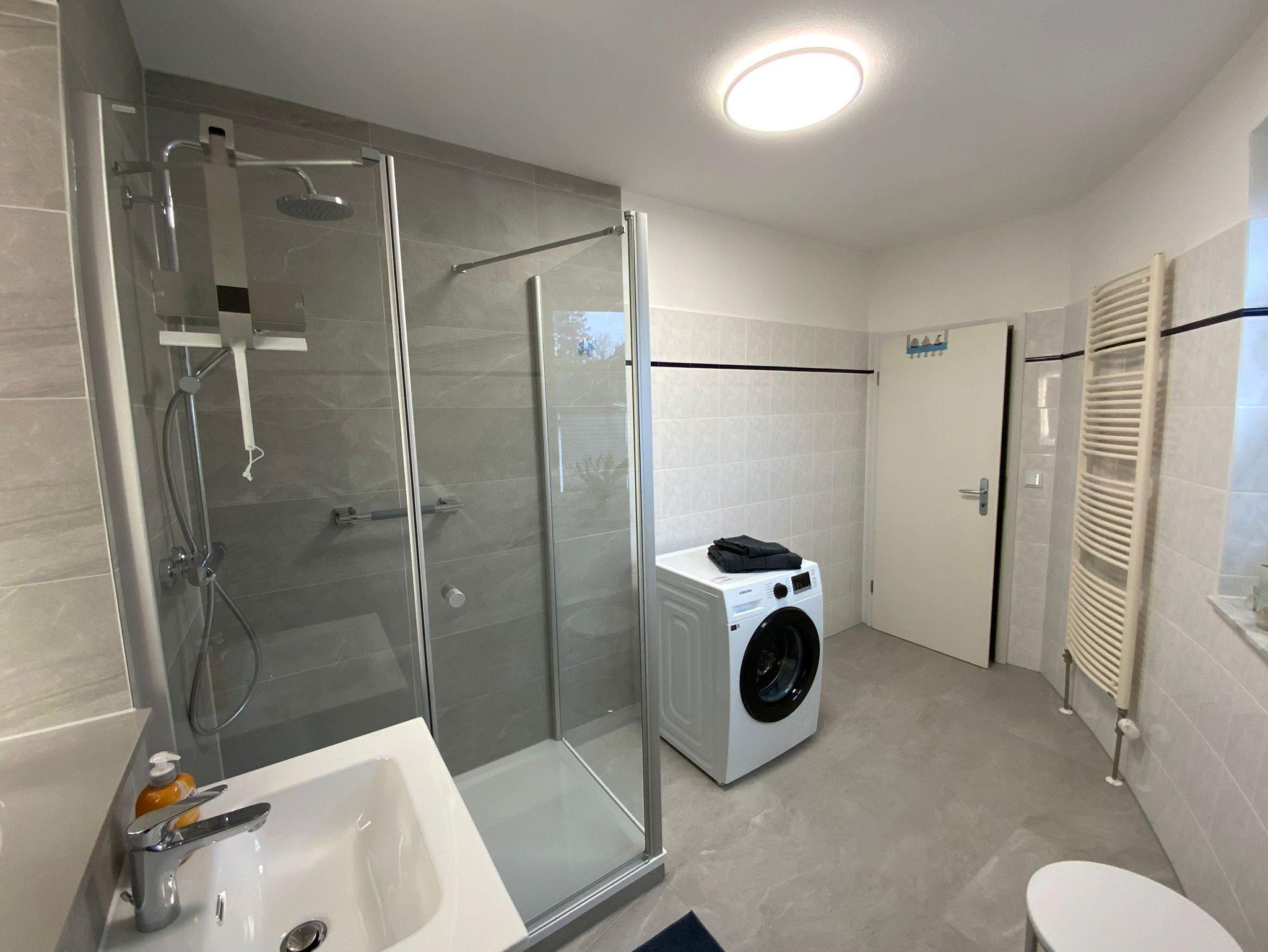 • Renoviertes Badezimmer (Februar 2025) mit neuer großer begehbarer Dusche, WC, Waschbecken, Waschmaschine und Handtuchheizkörper;