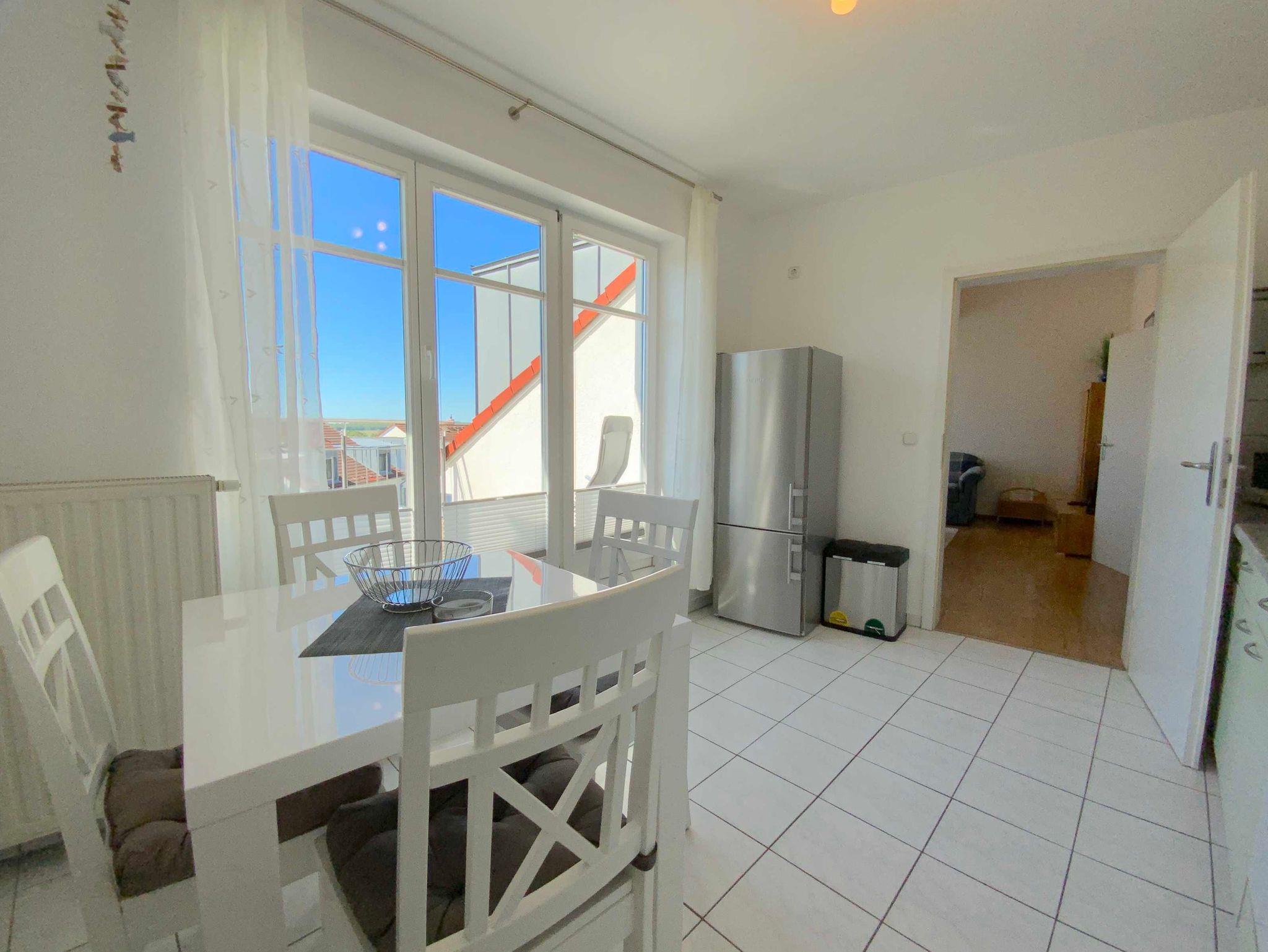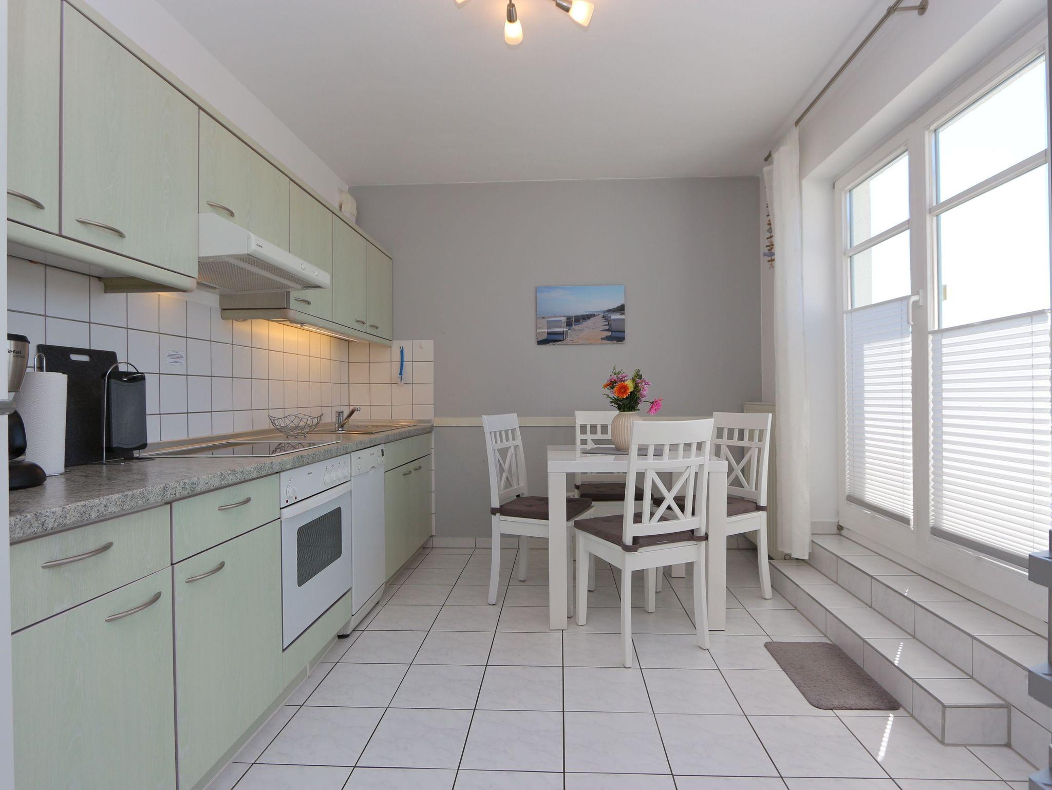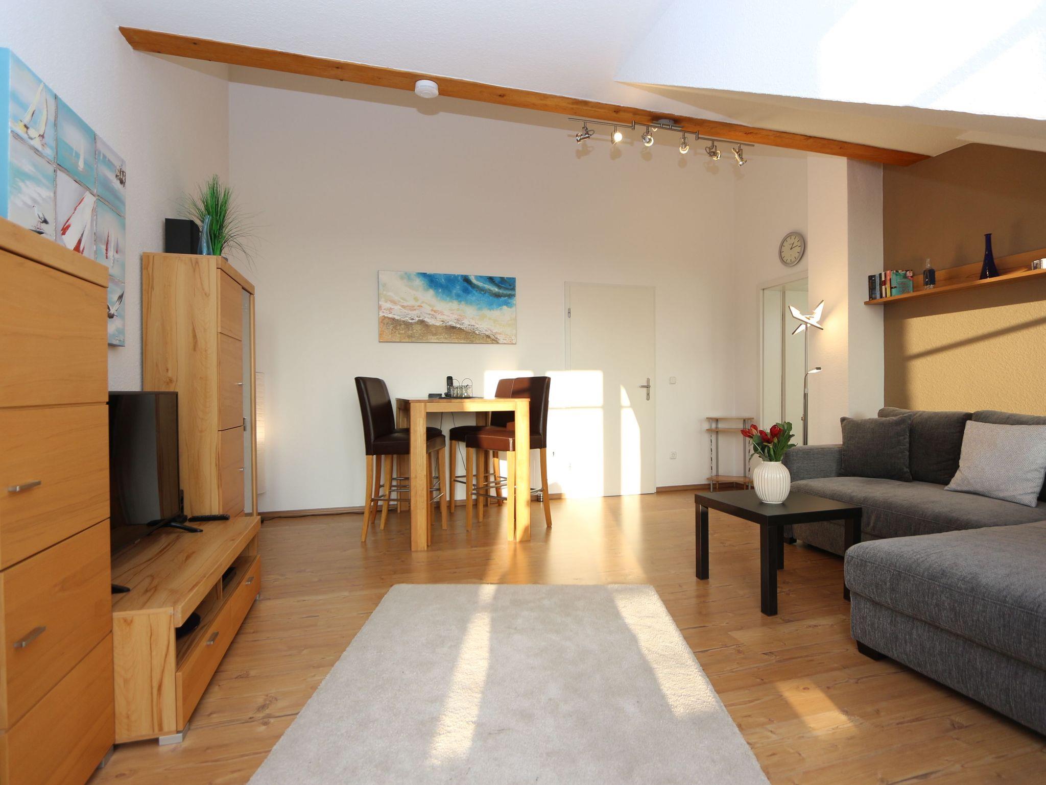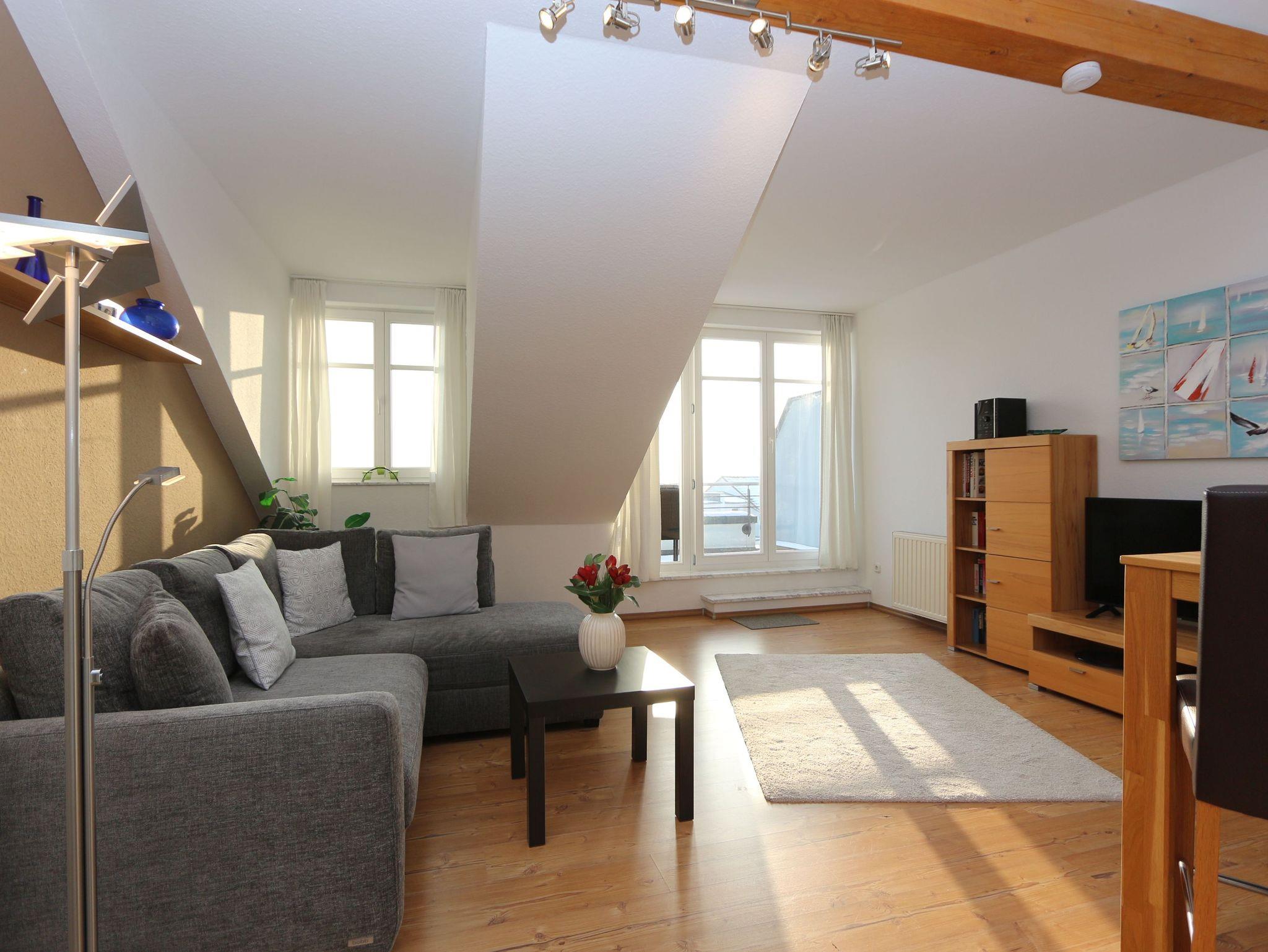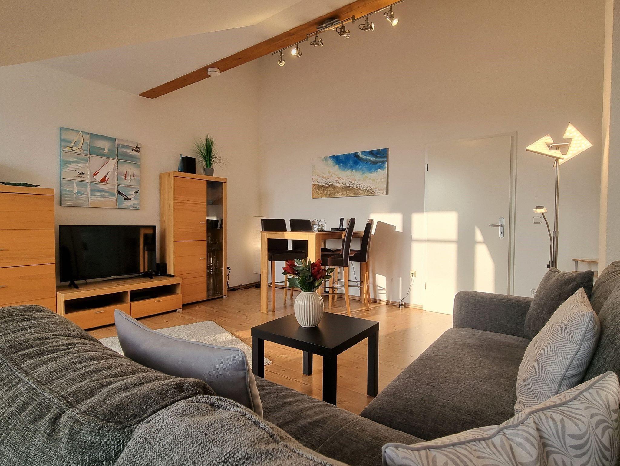 Die ca. 62 m² große 2-Zimmer-Dachgeschosswohnung (2. OG) maximal für bis zu 3 Personen besitzt zur Südseite hin ein geräumiges Wohn-/Esszimmer und eine großzügige Wohnküche mit Geschirrspüler, Kühl-/Gefrierkombination und allem technischem Komfort einer modernen Küche. Die bodentiefen Fenster und Balkontüren zu den 2 Balkonen gewähren von diesen Räumen wunderbare Panoramablicke über die Insel.
