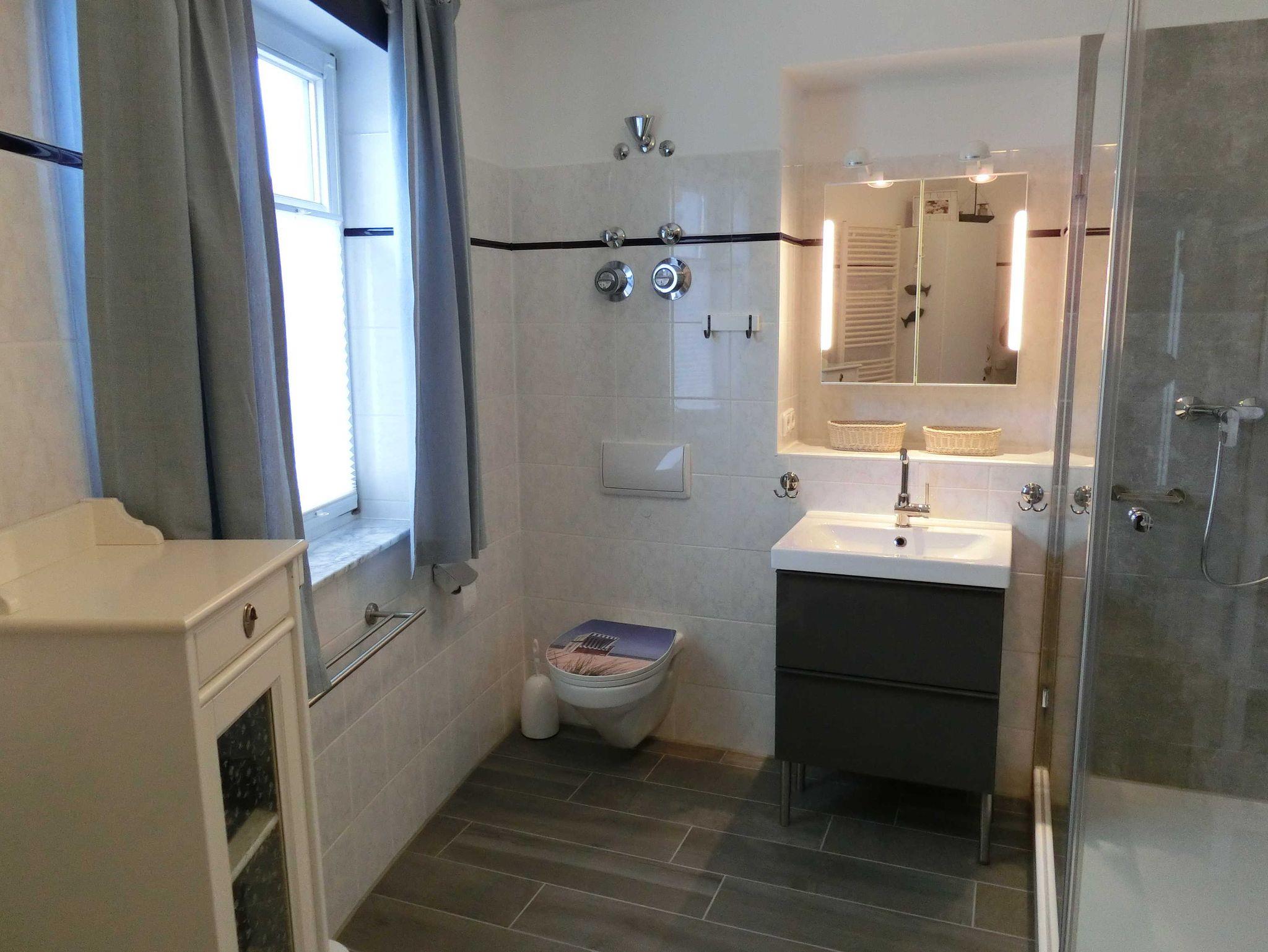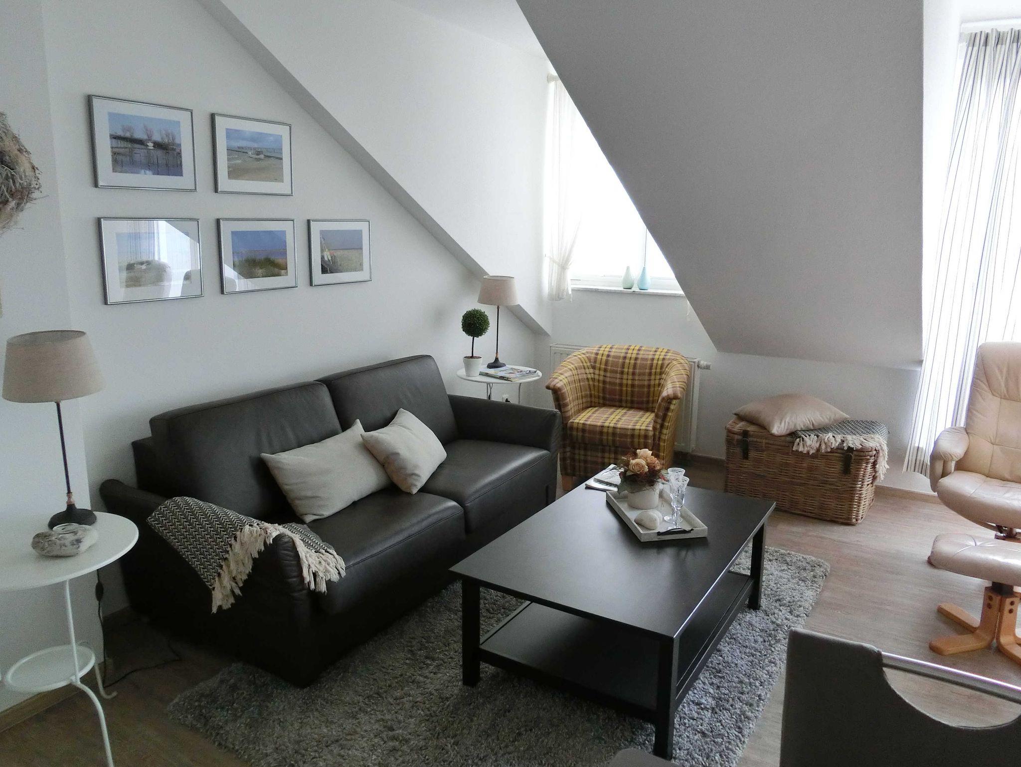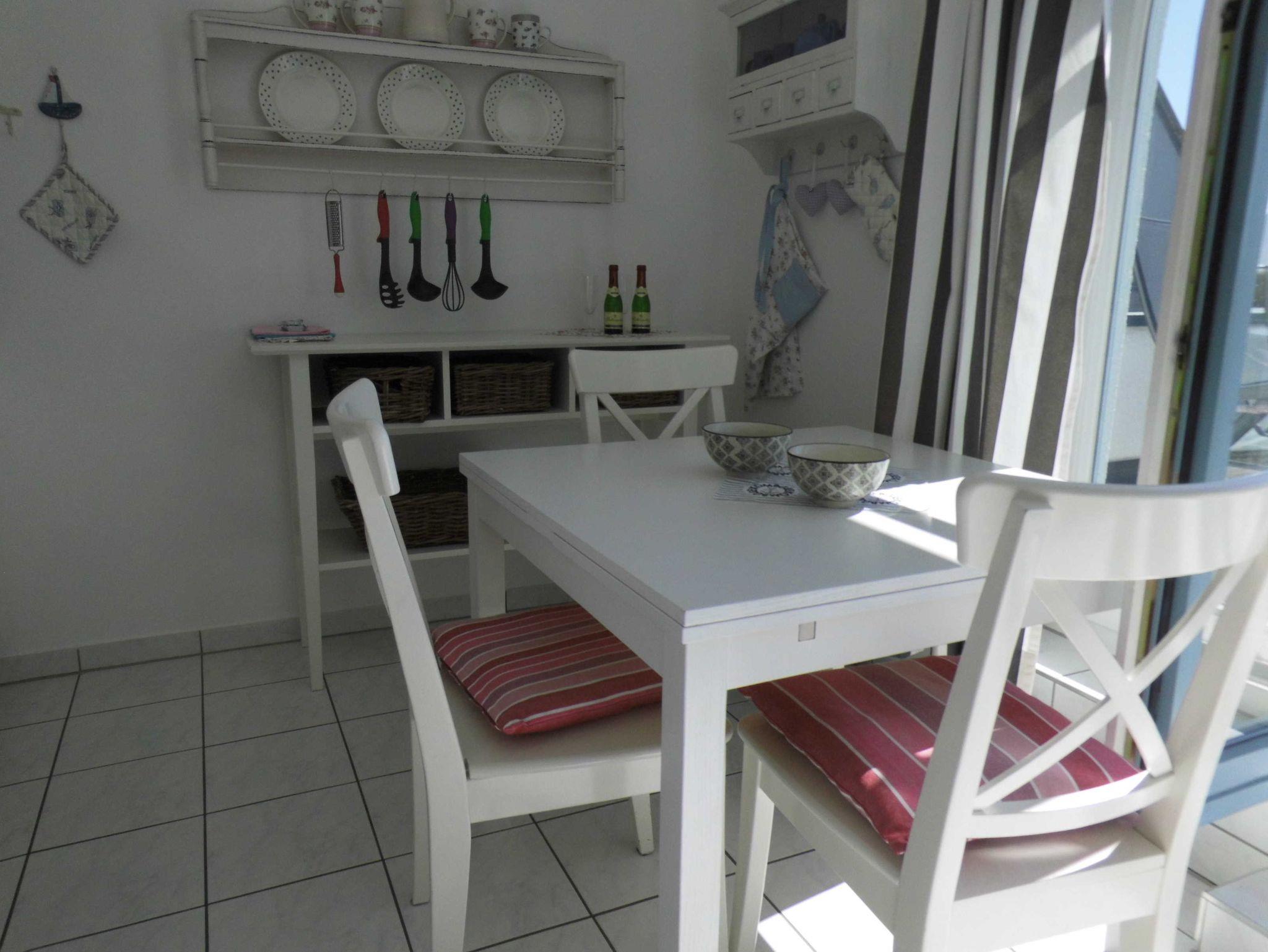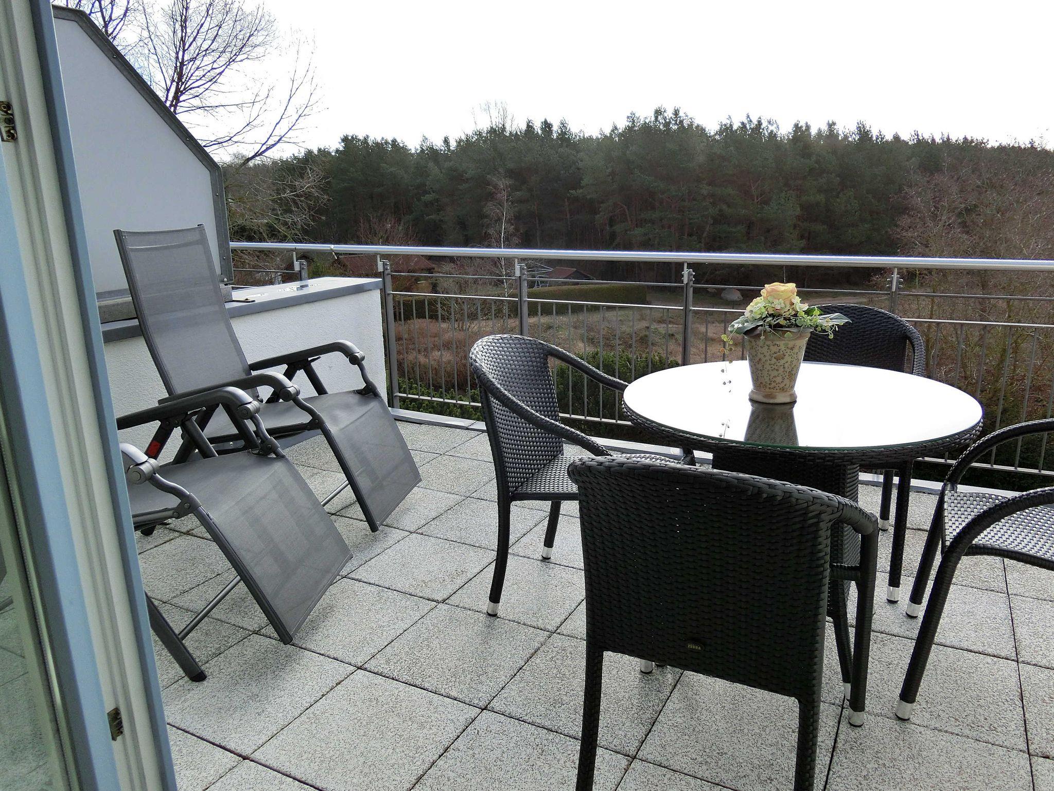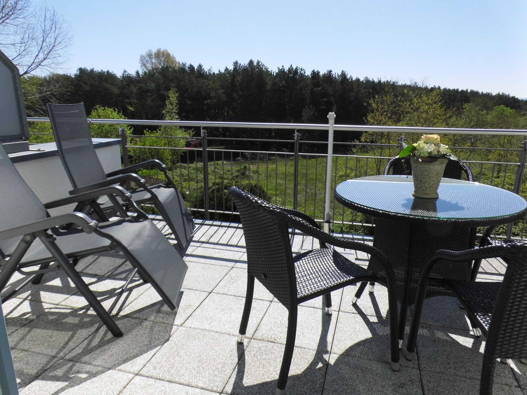 Die Dachgeschoß-Wohnung hat zwei Balkone die nach Süden ausgerichtet sind; mit 4 Terrassenstühlen, Tisch und Sonnenschirm. 2 Sonnenliegen.