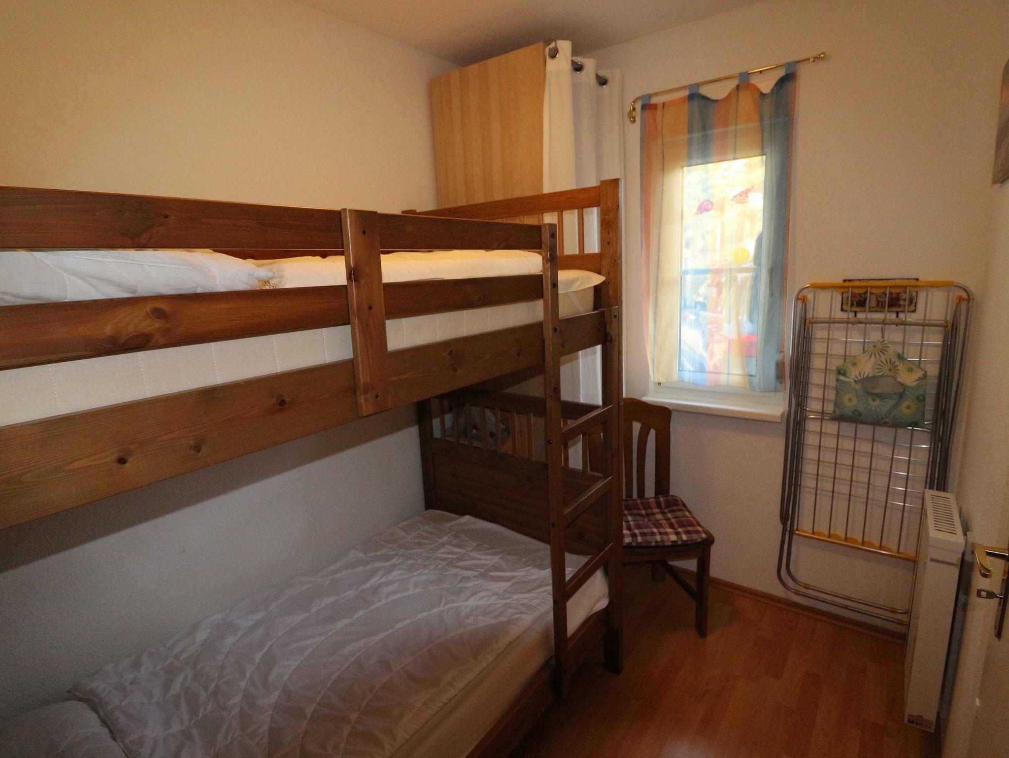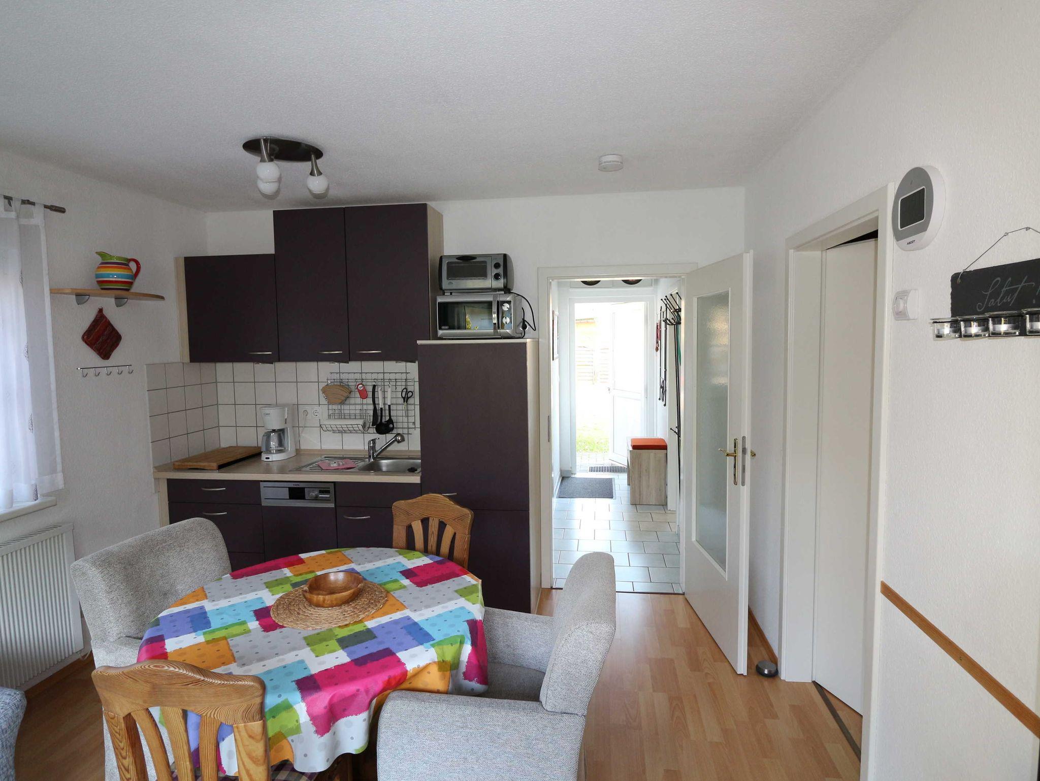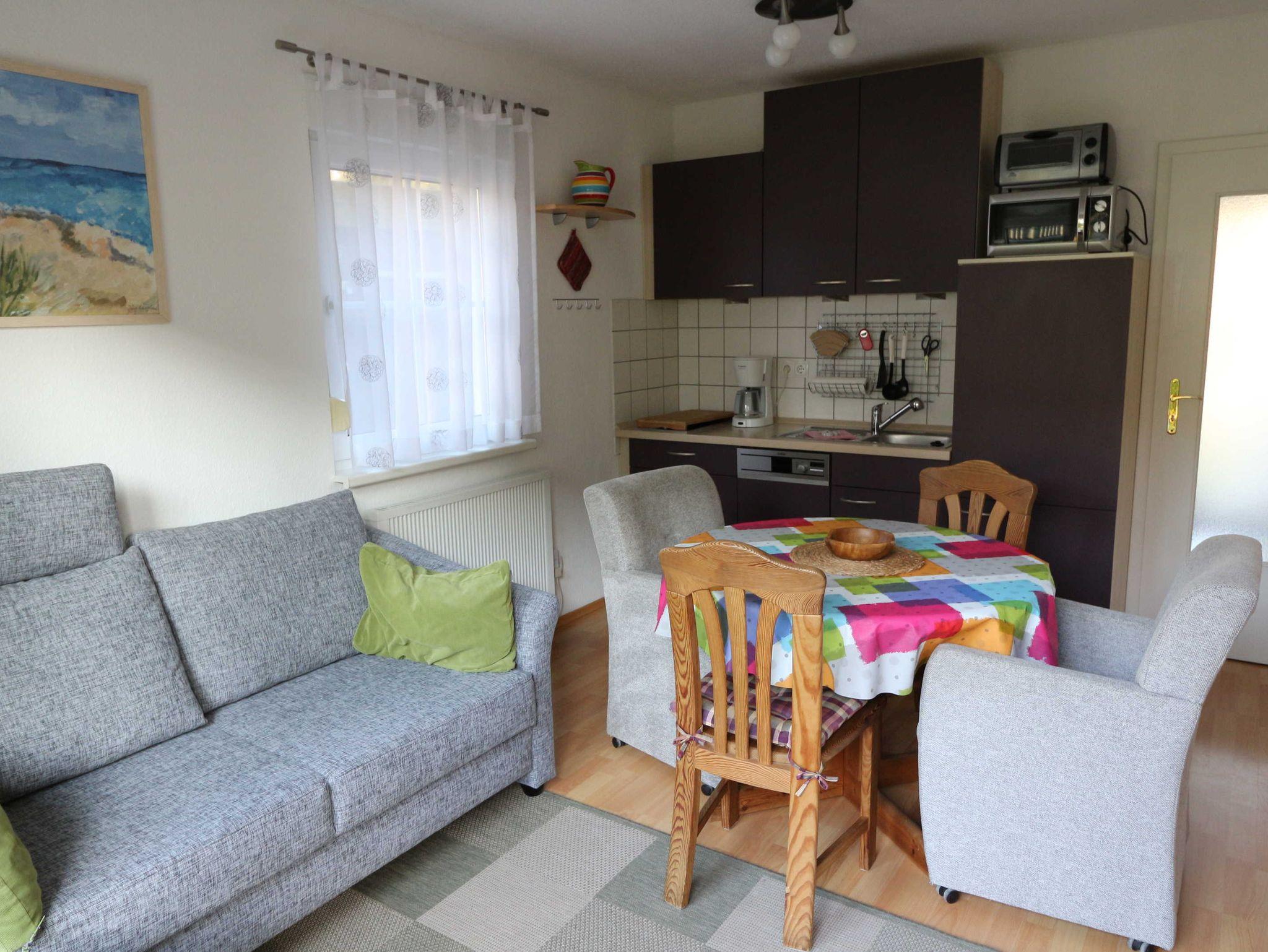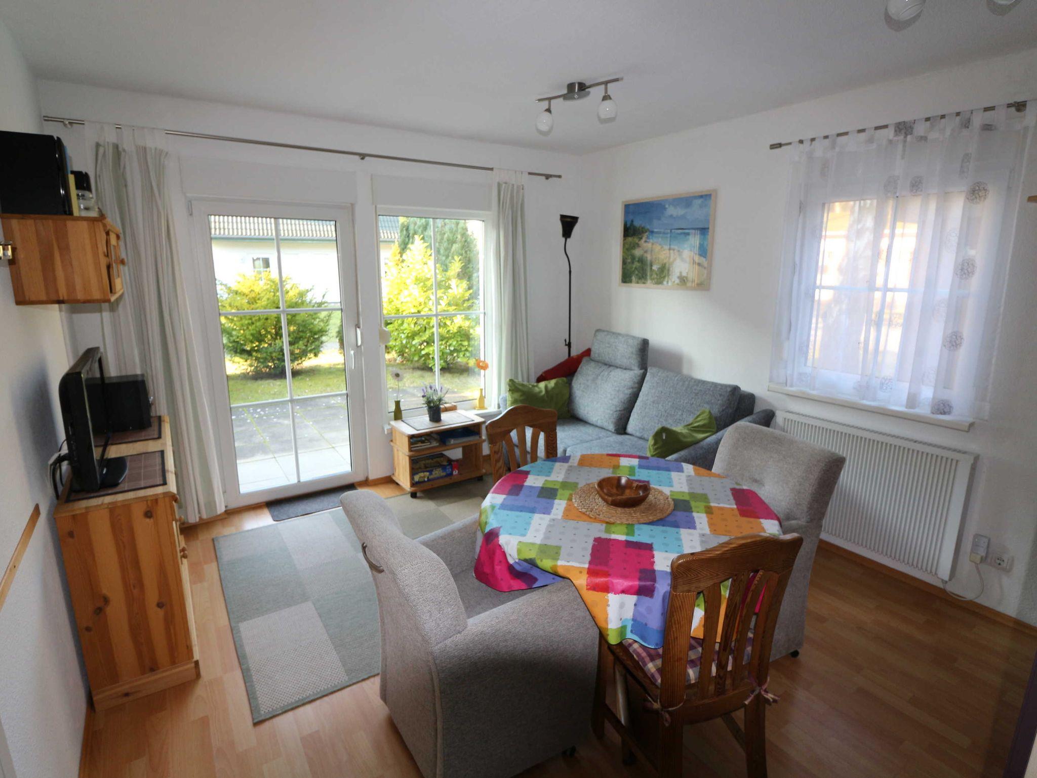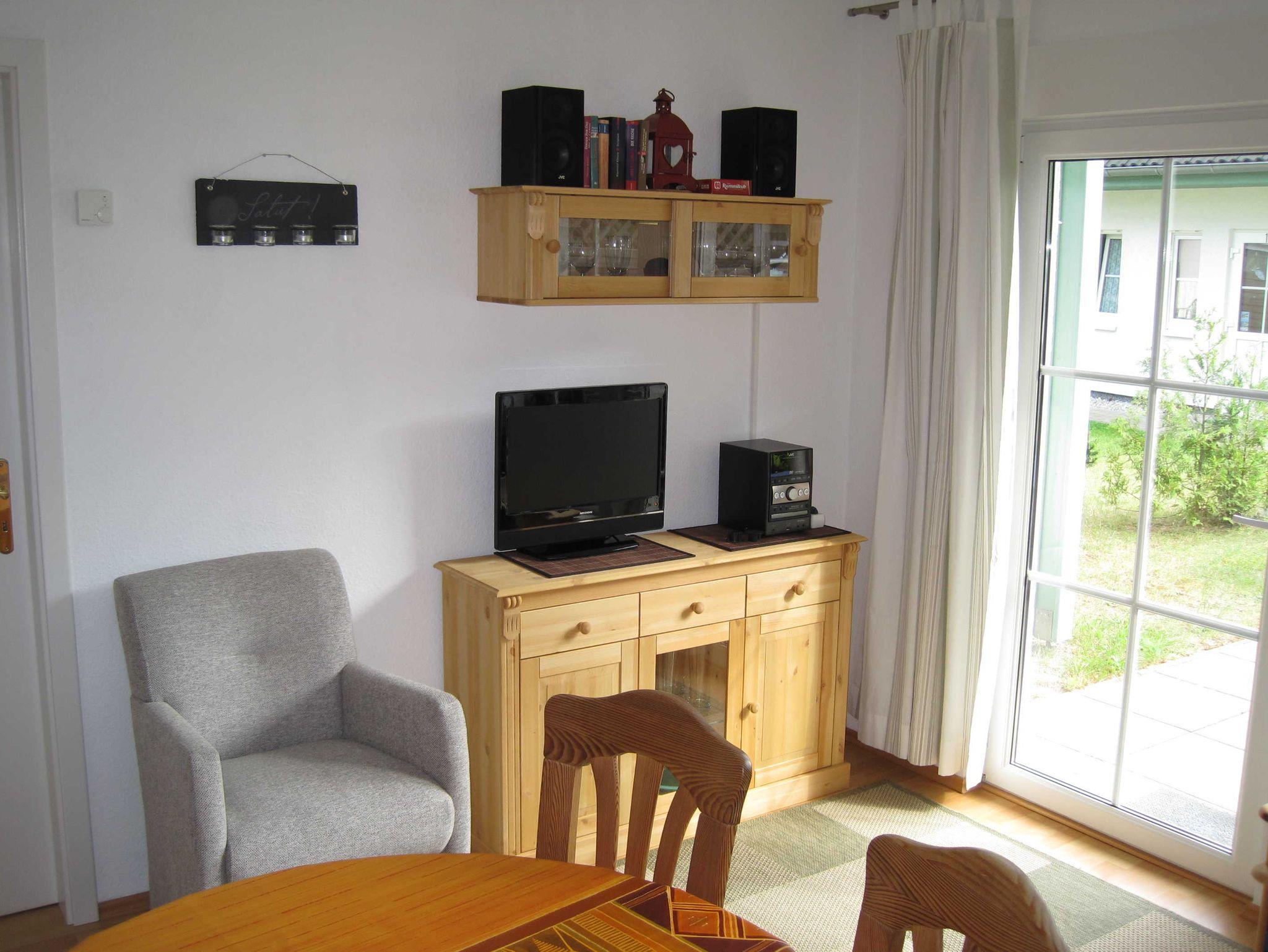 Helle 3-Zimmer Erdgeschosswohnung mit großer Terrasse, in einer liebevoll angelegten Ferienanlage. Die Ferienwohnung ist im Wohnbereich ausgestattet mit einer Schlafcouch, Flachbild-TV, Stereoanlage mit Radio, CD und DVD-Player und einer kleinen Küche mit Essbereich sowie kostenfreies WLAN.
