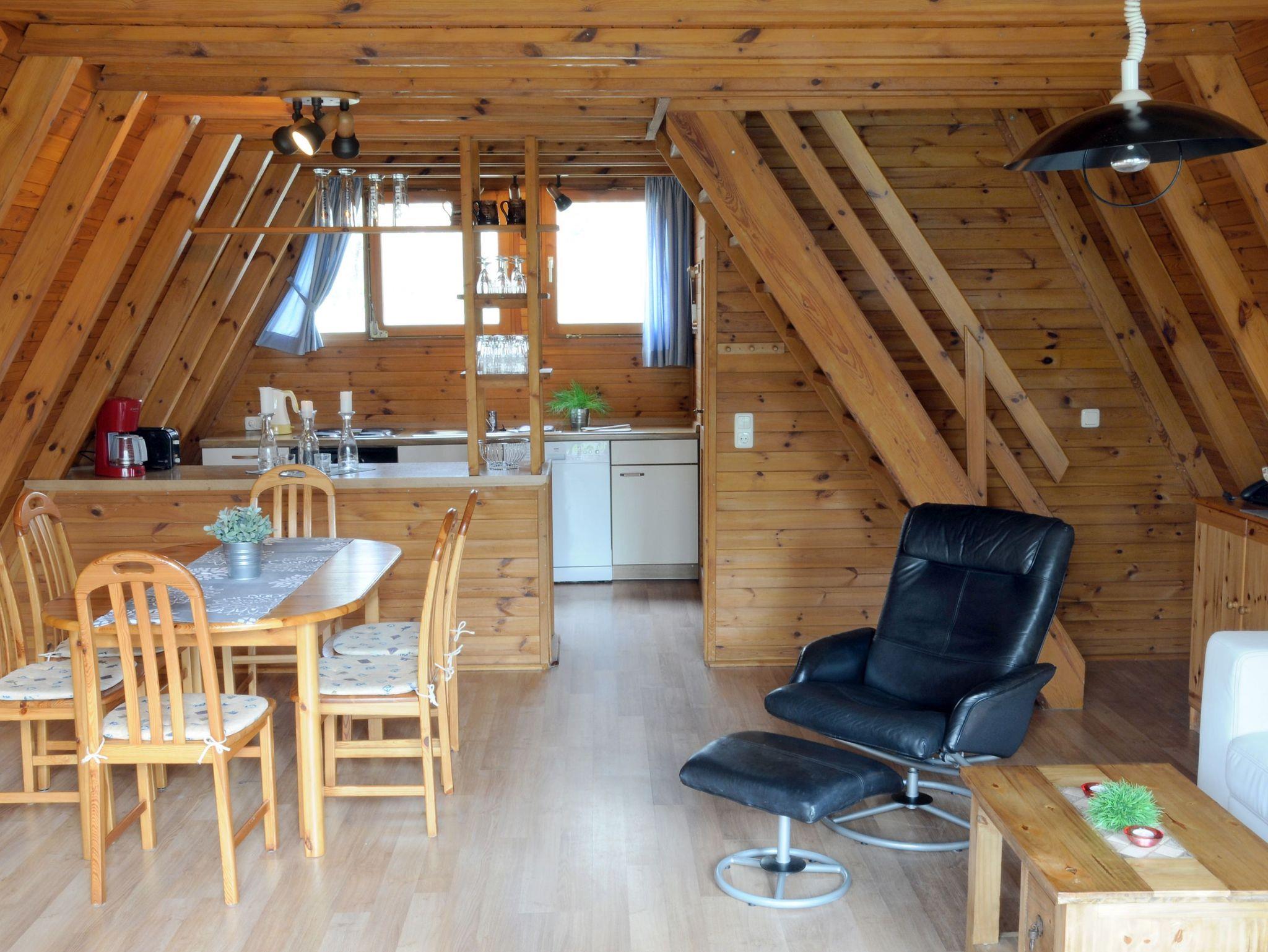 Rustikale Finnhütte mit großzügigem Wohn-/Esszimmer mit offener Küche und Terrassenzugang.