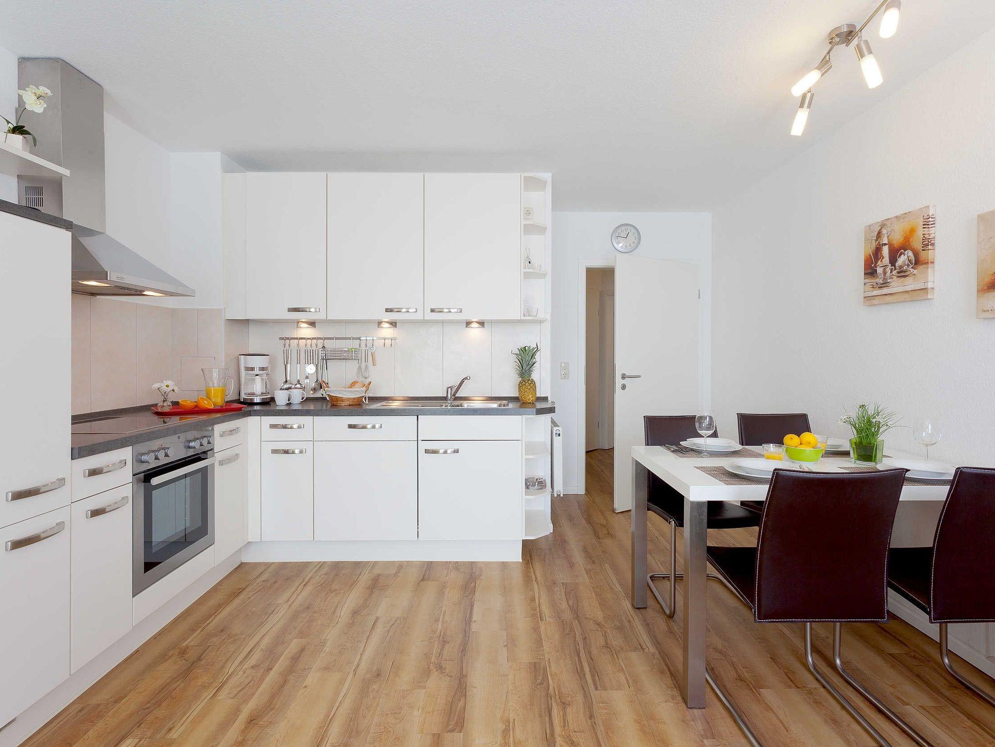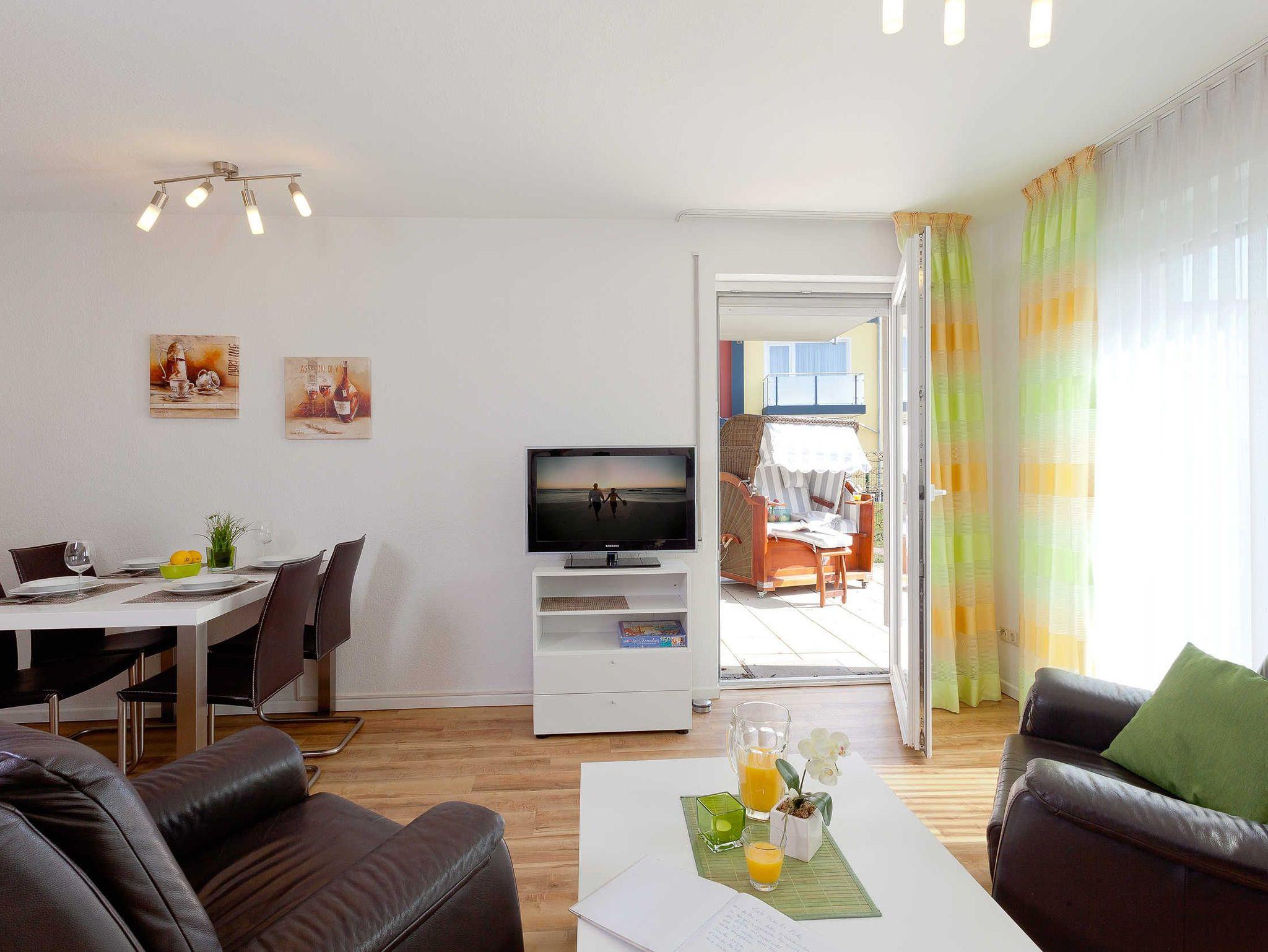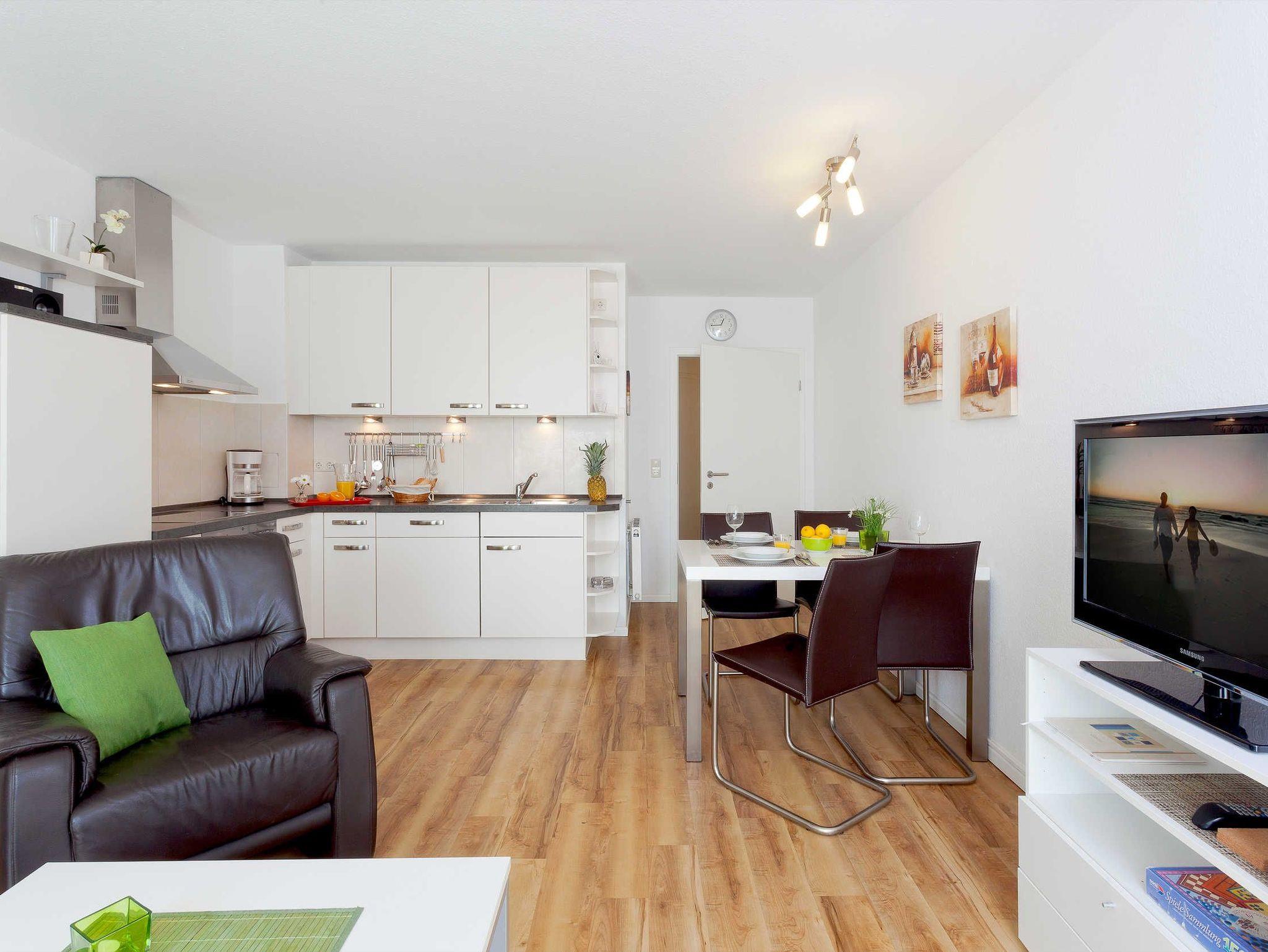 Es gibt ein großes Wohnzimmer mit integrierter modernen Küchenzeile mit Geschirrspüler, Toaster, Kaffeemaschine Kühlschrank und einer Essecke. Das Bad ist mit einer ebenerdigen Dusche ausgestattet und einer Waschmaschine. Im Sommer steht Ihnen eine möblierte Terrasse zur Verfügung sowie ein PKW Stellplatz. Auf Nachfrage können Sie ein Babybett oder Kinderhochstuhl dazu buchen. Die Wohnung liegt in zentraler Lage in der Ortsmitte. Bis zum Strand sind es 10 Minuten Fußweg. Die Wohnung verfügt über einen Wlan-Zugang.