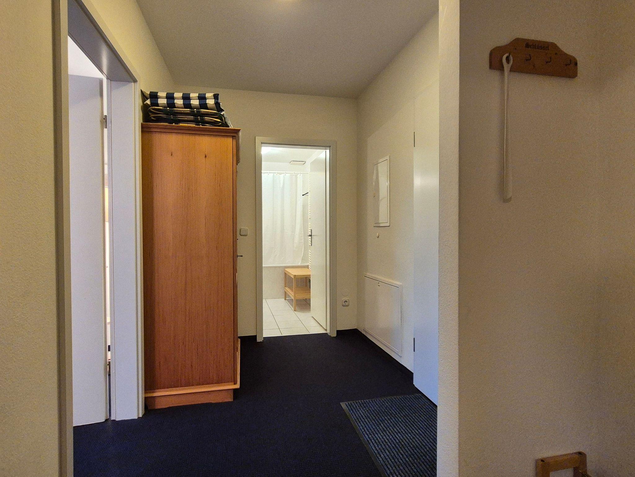• Die Fußböden im Wohnzimmer, Flur und Schlafzimmer haben einen Teppich, Bad und Küchenbereich haben einen Fliesenfußboden.