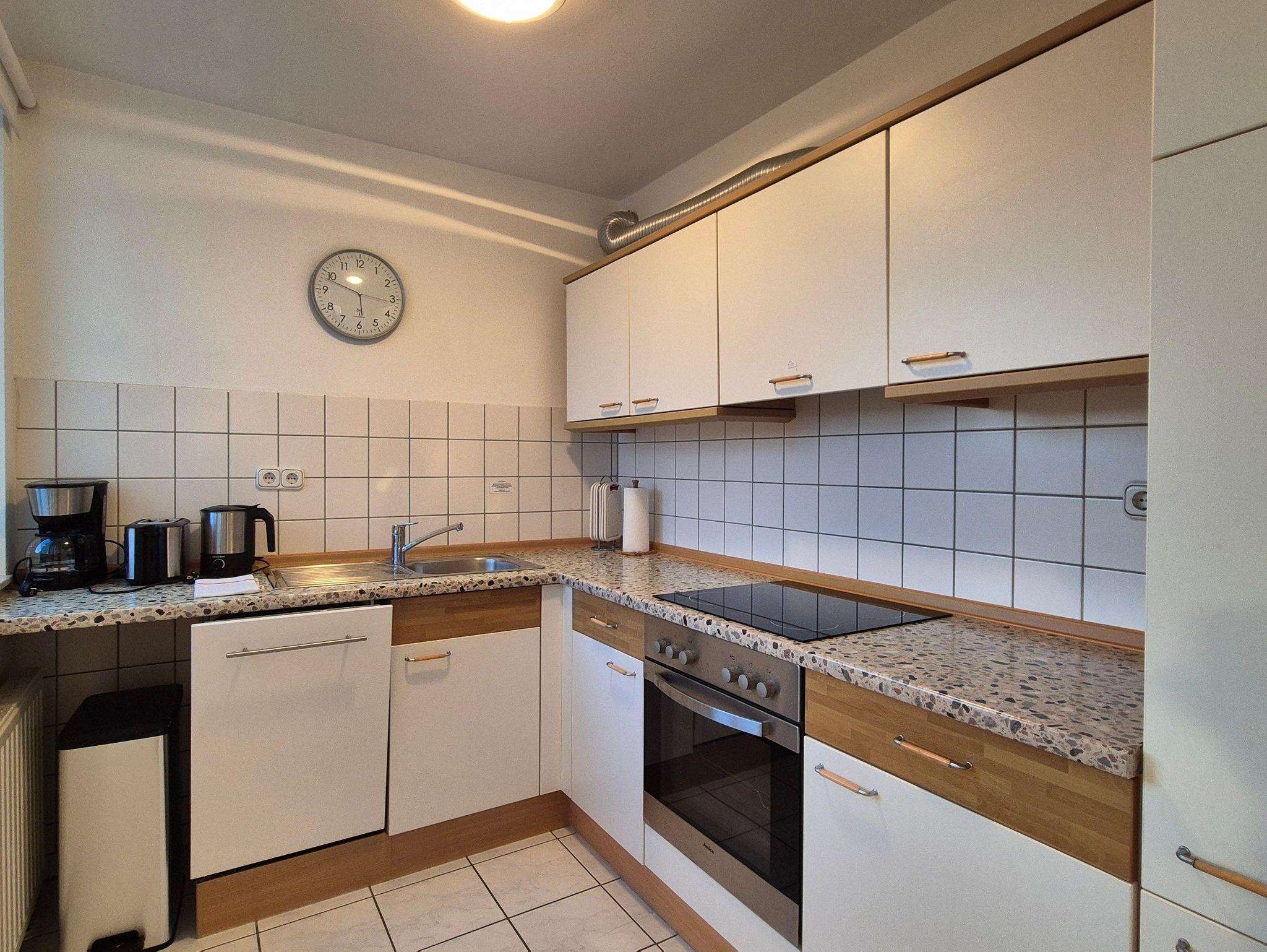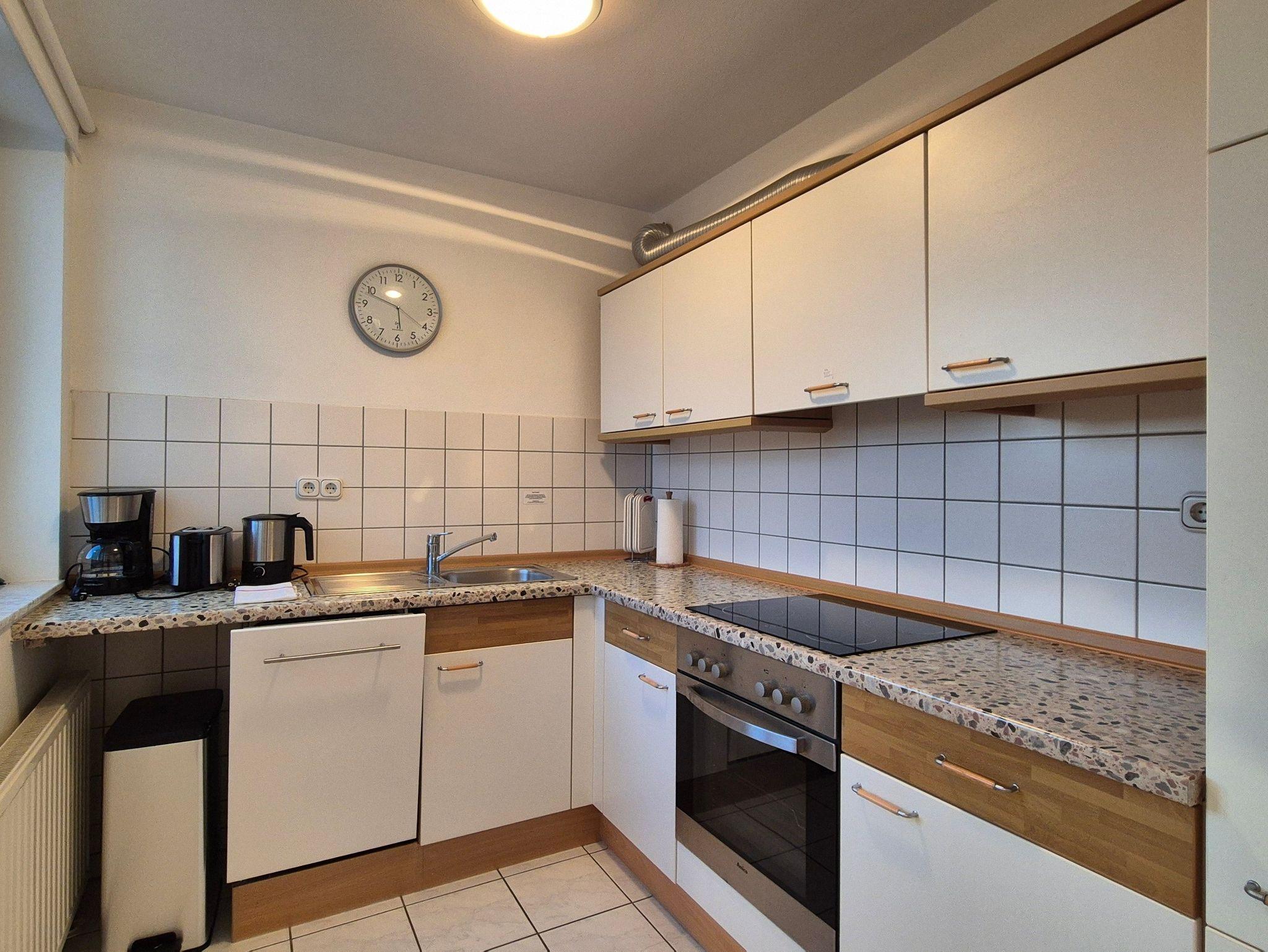 • Die zum Wohnzimmer offene Einbauküche ist mit allem Notwendigem (Herd, Backofen, Spülmaschine, Wasserkocher, Kaffeemaschine, Toaster und einem Kühlschrank mit Gefrierfach) ausgestattet.