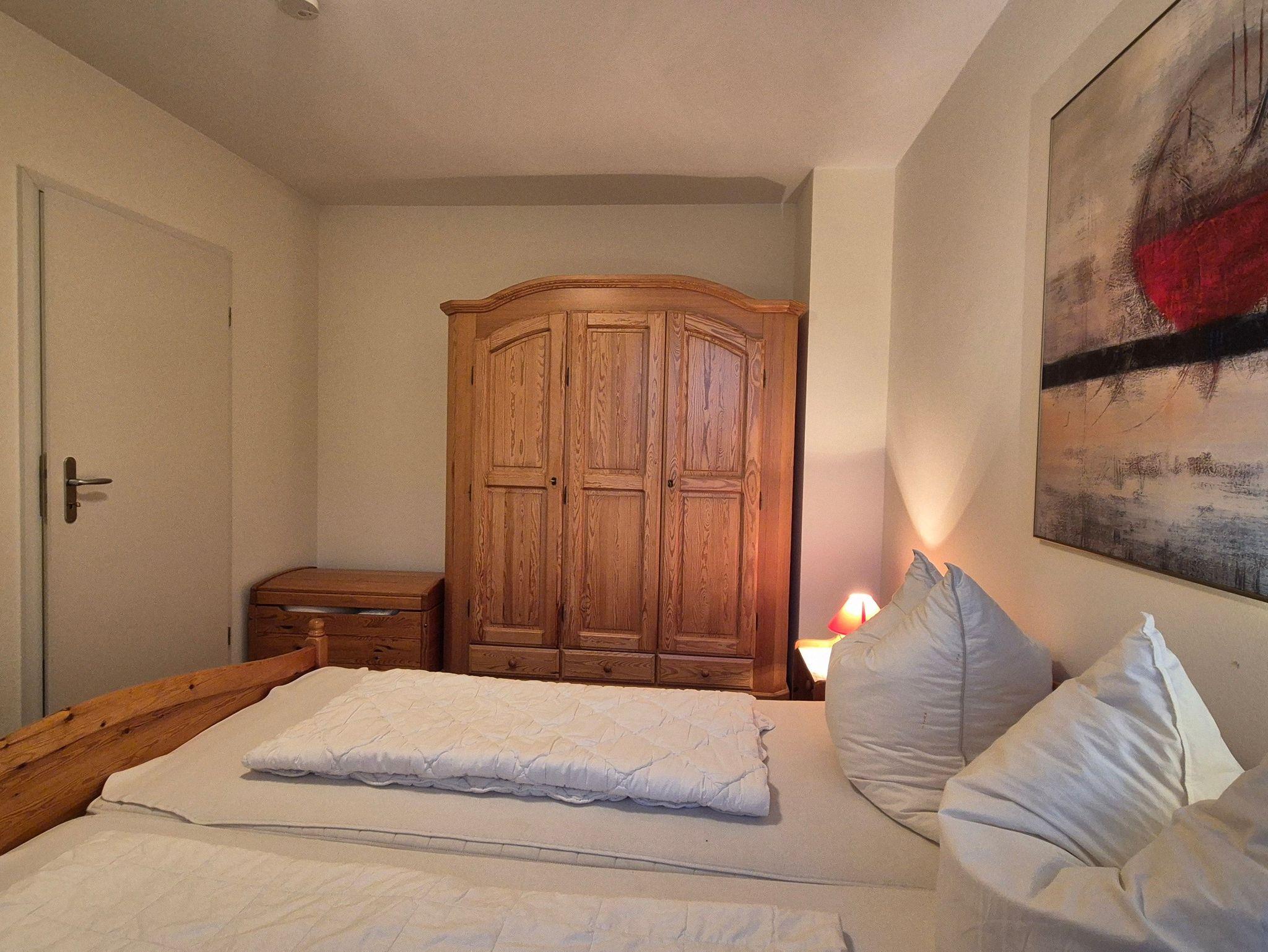 • Das Schlafzimmer verfügt über ein Doppelbett (ca. 180 x 200 cm), 2 Nachttischen, einem Kleiderschrank und einer Garderobe.