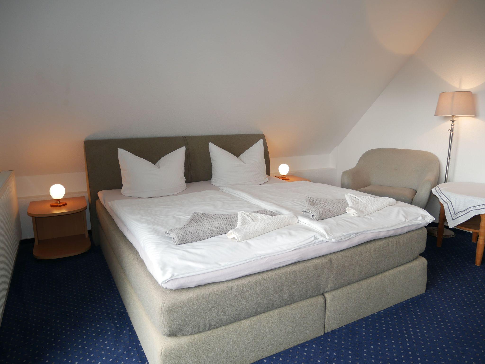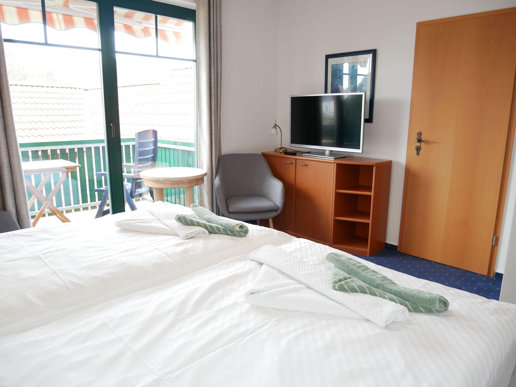 Das 18qm große Doppelzimmer befindet sich im Obergeschoss des Gästehauses und verfügt über einen kombinierten Wohn- und Schlafraum, einen möblierten Balkon, sowie ein eigenes Bad mit einer Dusche.