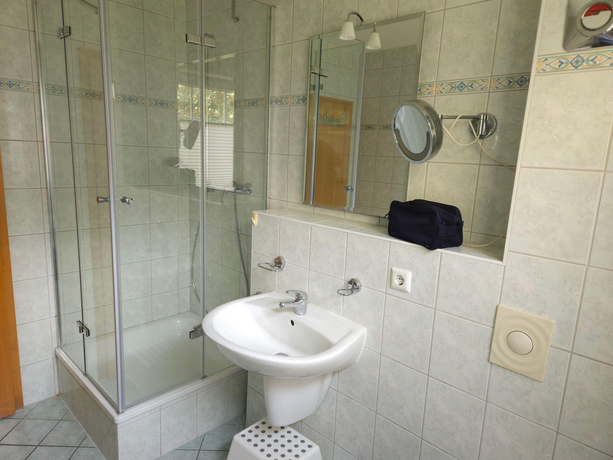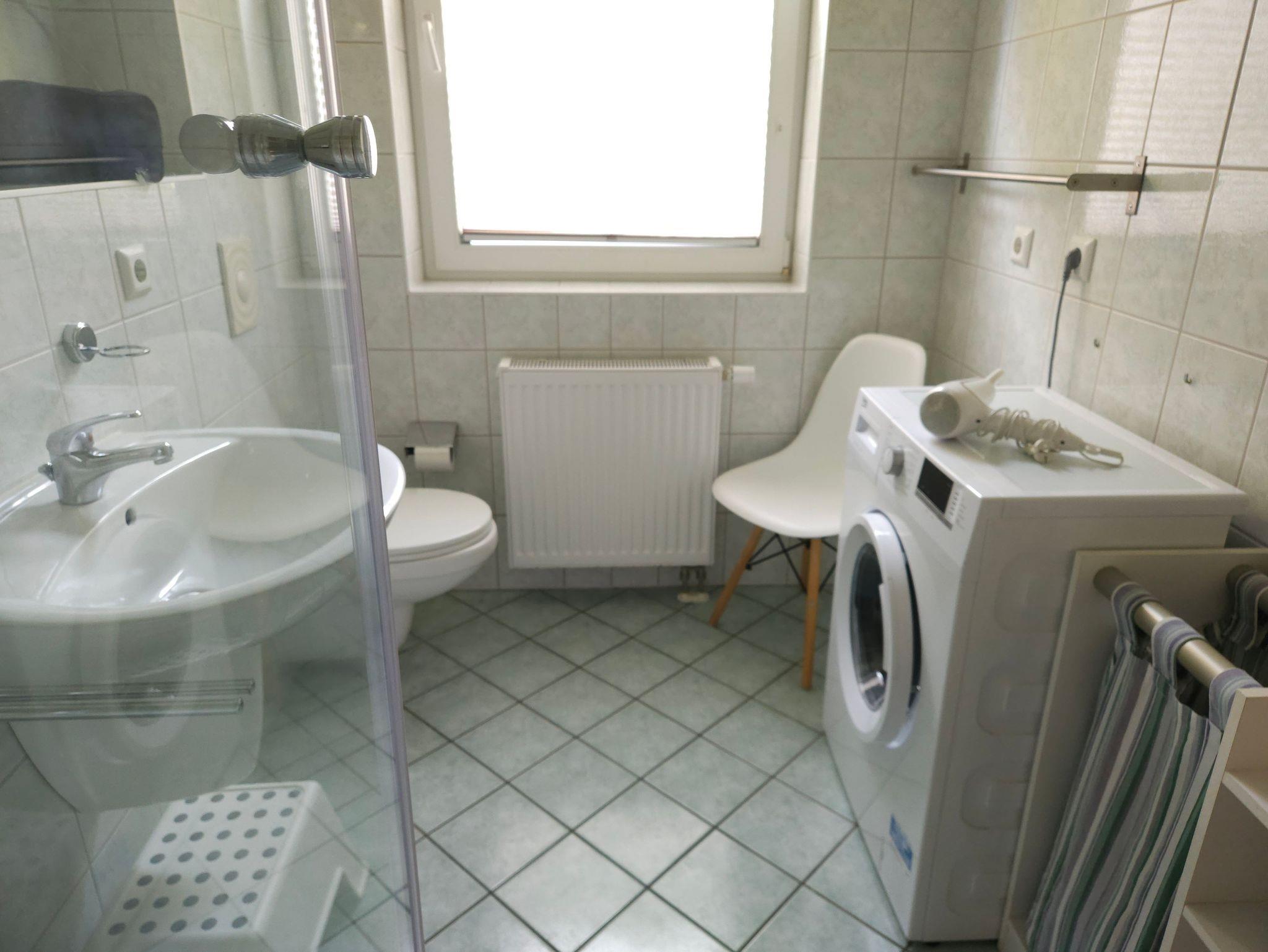 In dem tageslichtgefluteten Duschbad befindet sich ein Waschbecken, WC, eine geräumige Dusche sowie eine Waschmaschine.