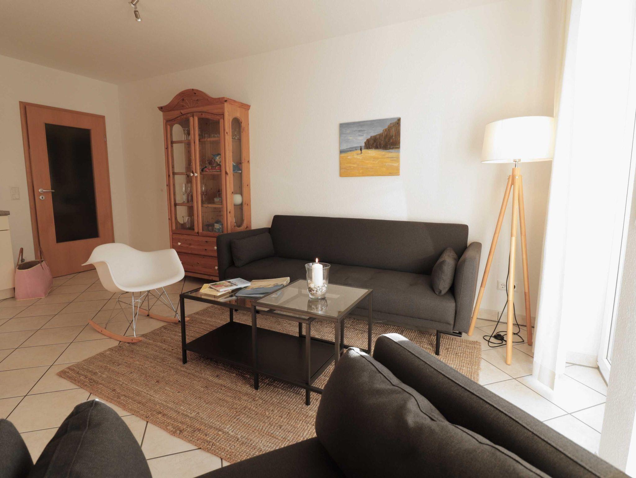 Im Wohnzimmer befindet sich eine Sitzgruppe, bestehend aus Sofa, das bei Bedarf zum Schlafsofa ausgeklappt werden kann und zwei bequemen Sesseln. Der aus Massivholz gearbeitete Esstisch kann mühelos erweitert werden, so dass bis zu acht Personen daran Platz finden. In einer Ecke des Wohnzimmers stehen ein Fernseher mit Kabelanschluss, CD/DVD/VHS-Spieler sowie ein Internet/ DAB+ Radio. In dem großen Sideboard finden Sie eine Reihe ausgewählter Gesellschaftsspiele. Sämtliche sich in der Wohnung befindlichen Möbel sind aus massiver, geölter Kiefer gearbeitet und vermitteln eine warme, behagliche Atmosphäre.