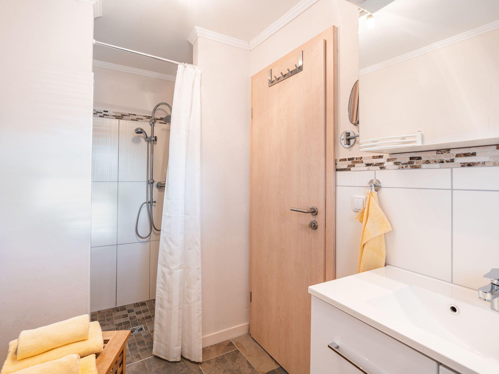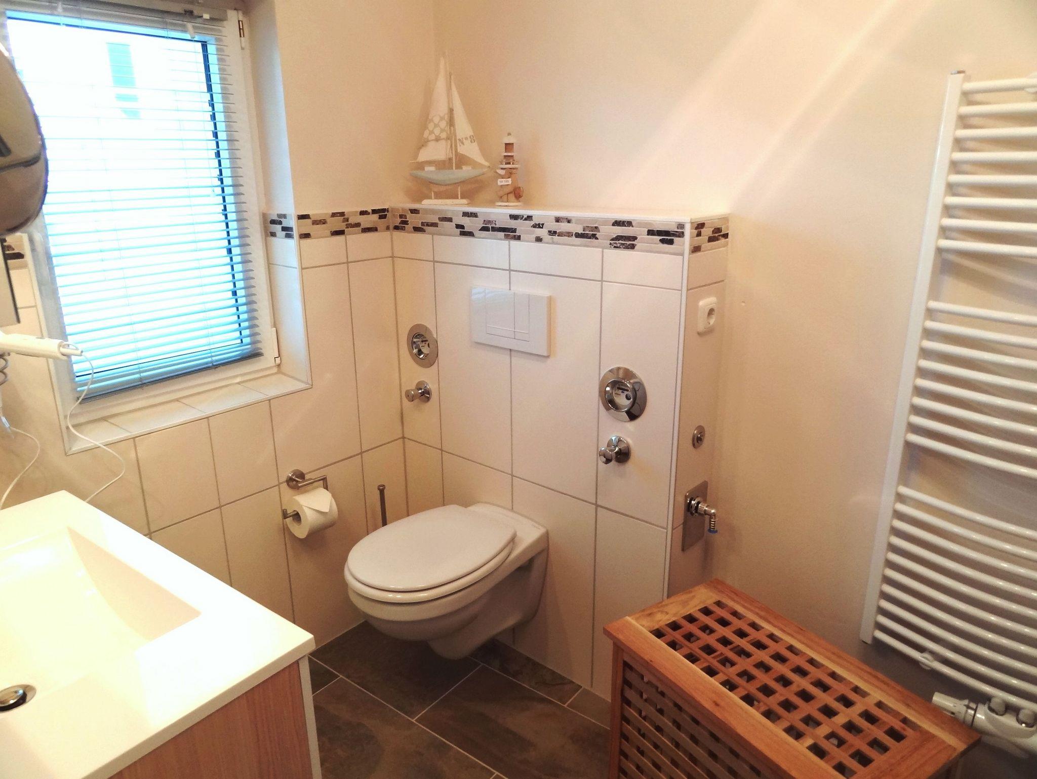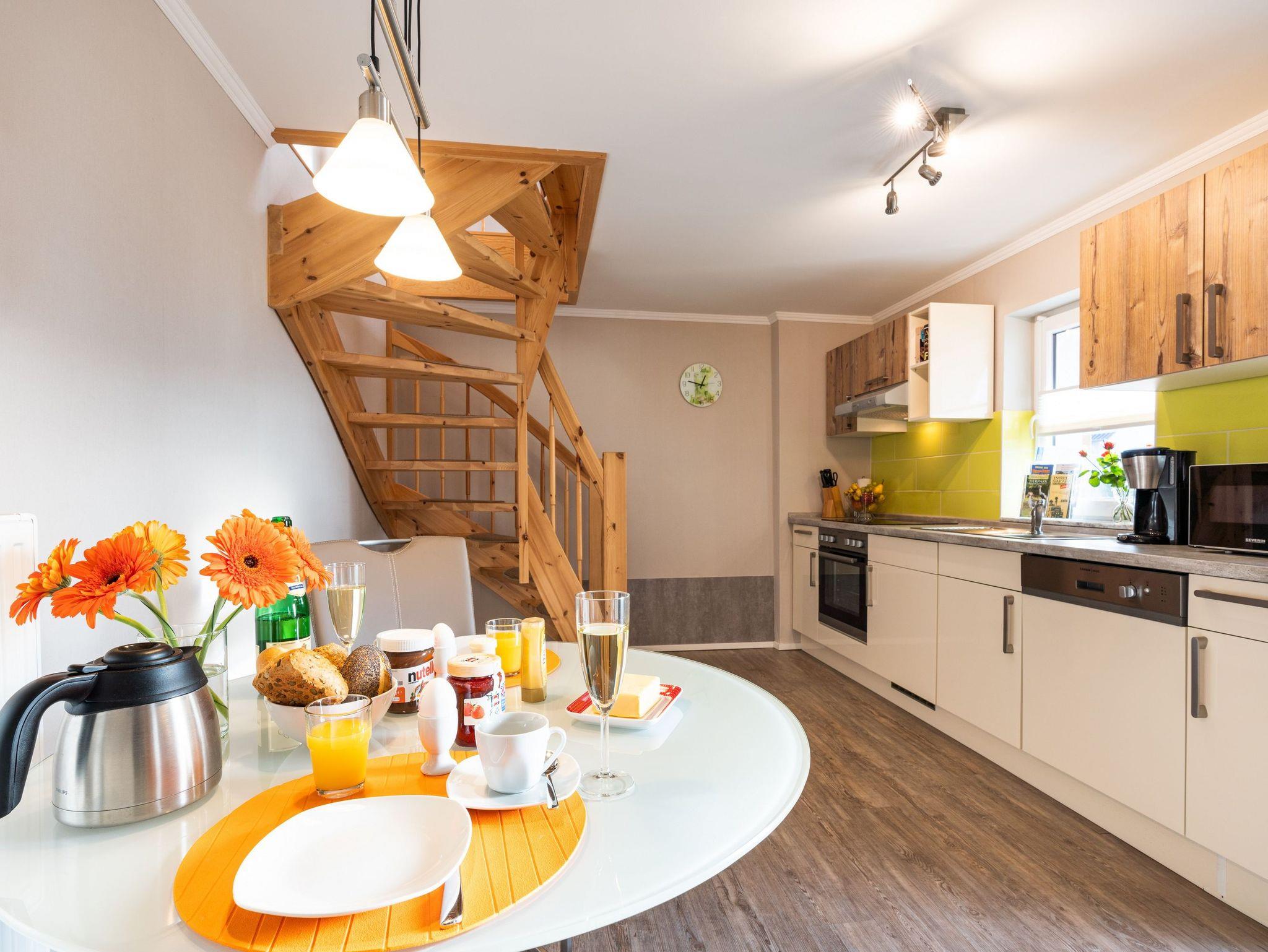 Im Erdgeschoss verfügt das Appartement über eine vollausgestatte Küchenzeile mit Ceranfeld, Backofen, Kühlschrank mit Gefrierfach, Geschirrspüler, Mikrowelle, Wasserkocher, Toaster, Kaffeemaschine und einen Essplatz für 2 Personen. Das Badezimmer, welches sich ebenfalls im Erdgeschoss befindet, ist mit Dusche, WC und einem Haartrockner ausgestattet.