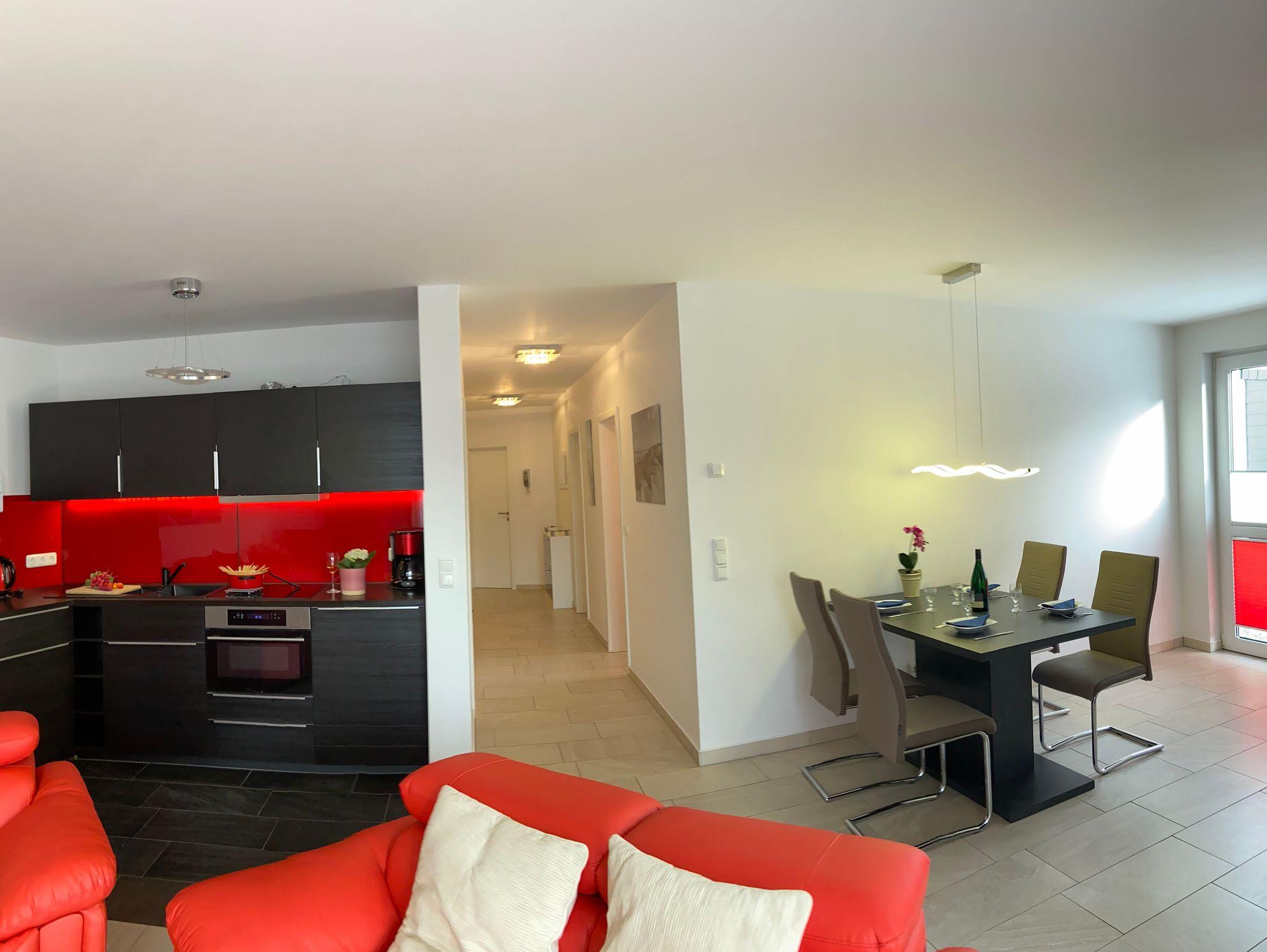 Die Wohnung besticht durch ihre moderne und zugleich gemütliche Einrichtung. Der offene Wohnbereich ist mit einem bequemen Sofa und einem Flachbildfernseher ausgestattet, ideal für entspannte Abende. Die Küche ist modern und bietet alle Annehmlichkeiten wie Geschirrspüler, Mikrowelle, Wasserkocher und Kaffeemaschine.