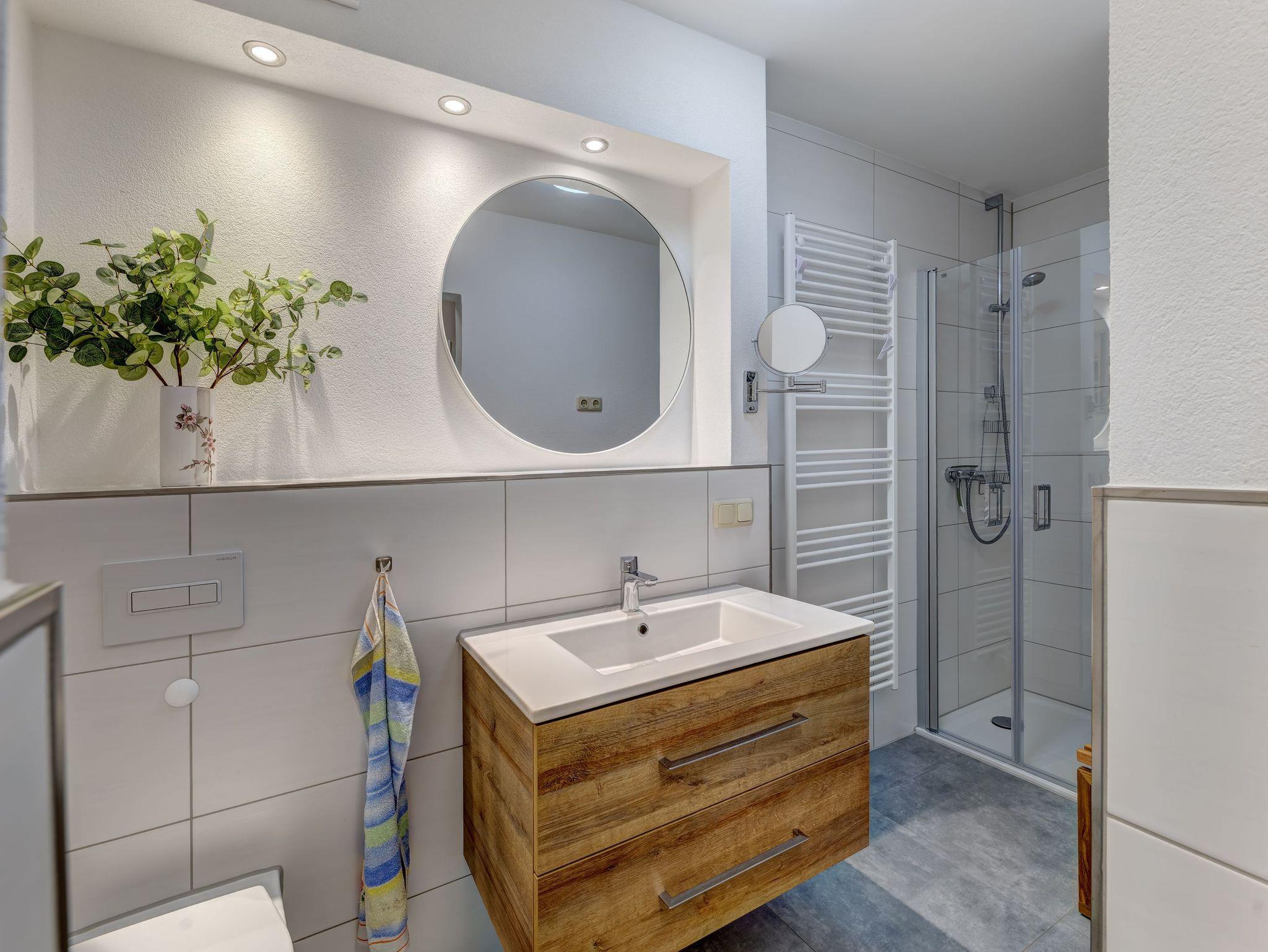 Im Badezimmer finden Sie einen Waschtisch, ein WC und eine Dusche vor.