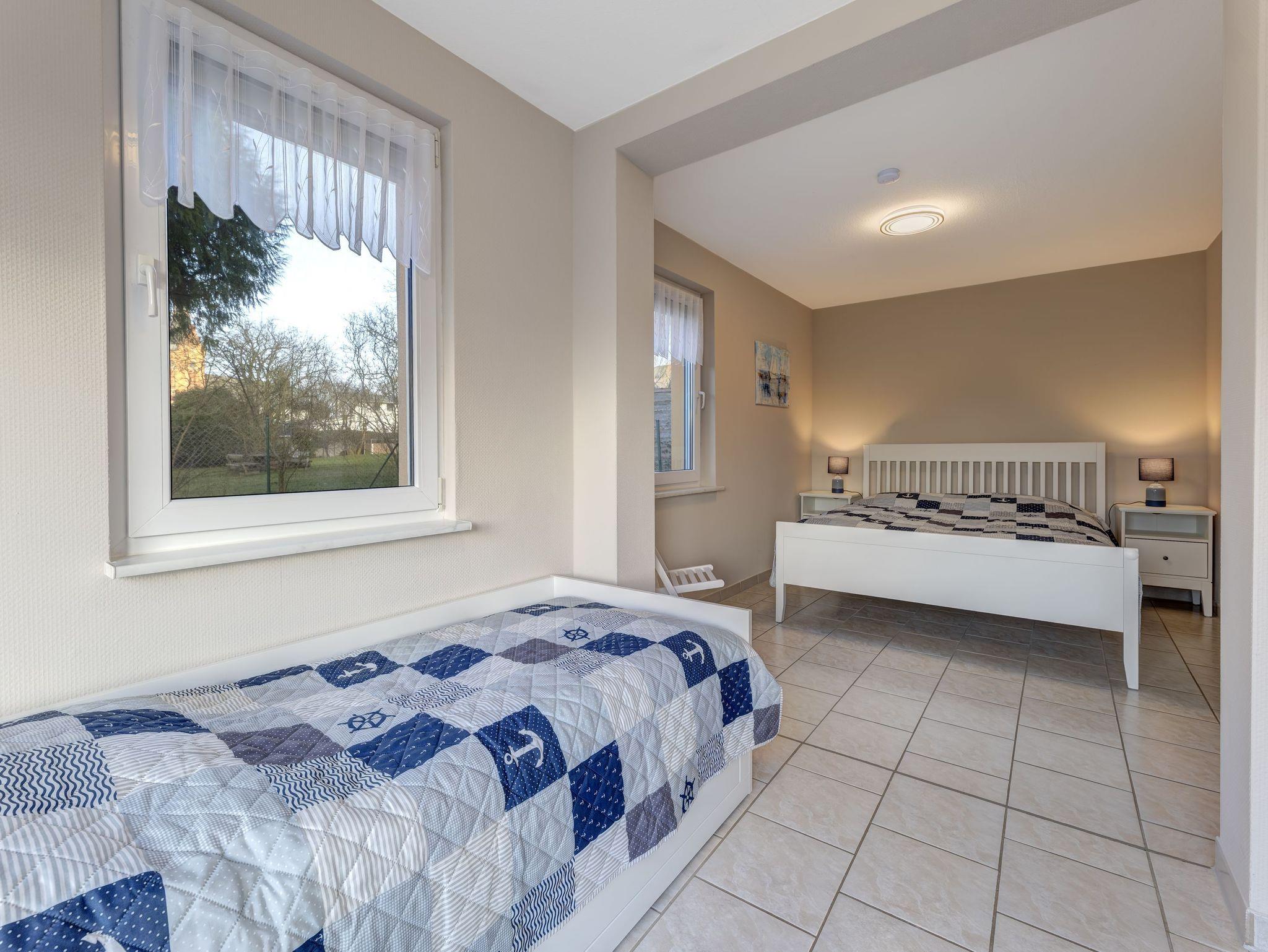Es bietet Zugang zum Schlafzimmer mit Doppelbett und Einzelbett.