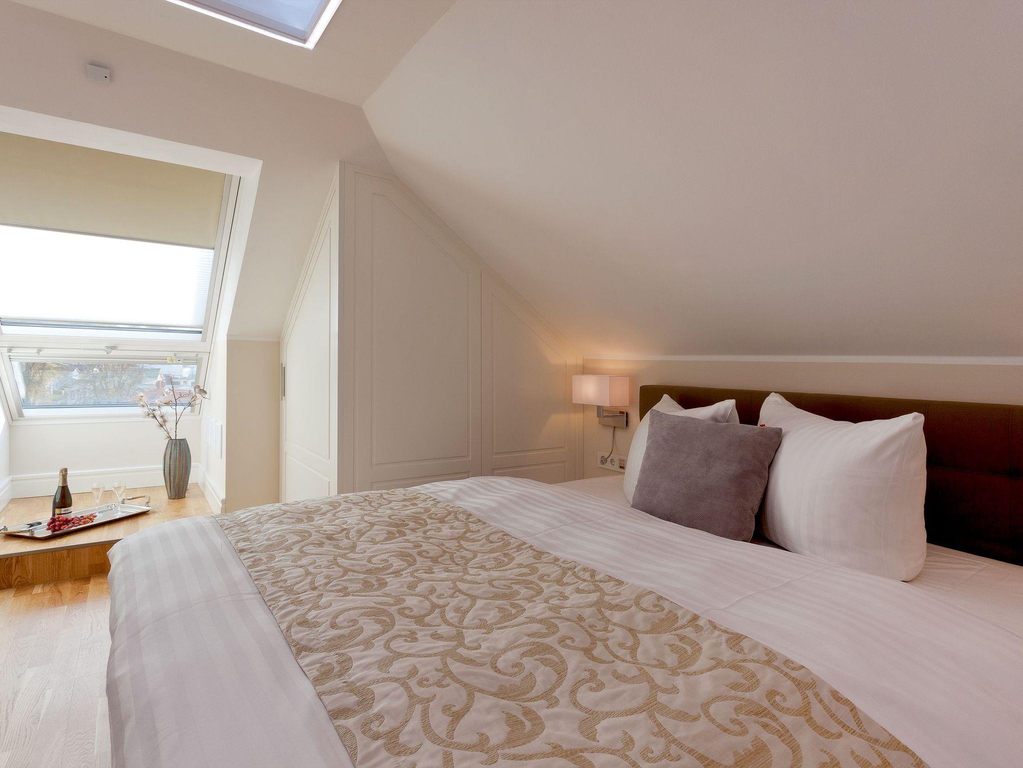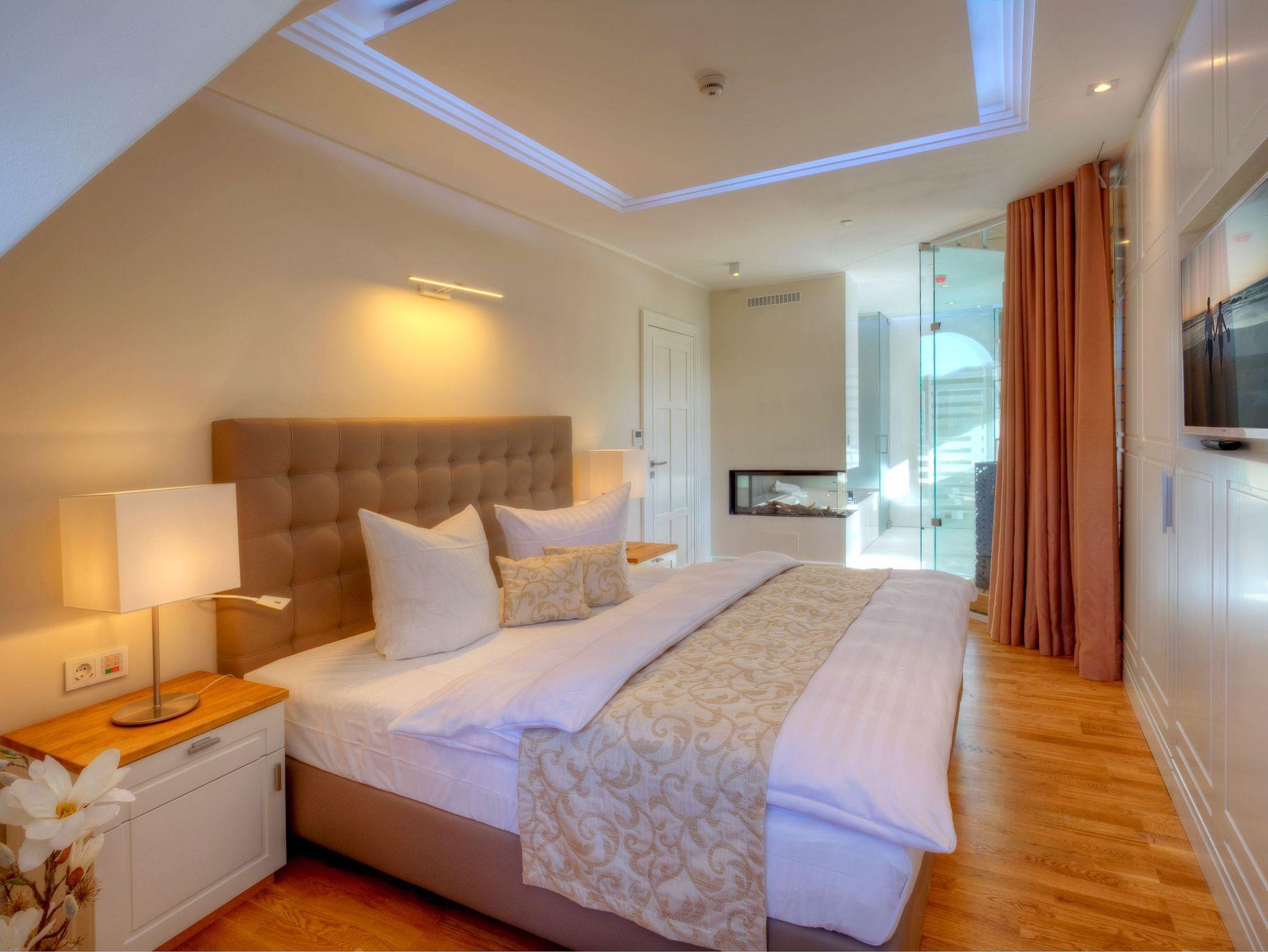 Das erste von vier Schlafzimmern mit Master-Bathroom ist ein Meisterwerk unseres Stylistenteams: Es wartet nicht nur mit einem der vier hochwertigen Boxspringbetten (200x200 cm) auf, sondern überzeugt ebenso mit einem Gaskamin und einer finnischen Sauna. In der Badewanne genießen Sie entweder das Flammenspiel des Gaskamins oder die TV Serie Ihrer Wahl. Komplettiert wird das Badezimmer mit einem Doppelwaschtisch, einer ebenerdigen Dusche sowie einem abgetrennten WC. Die Aufbettung für ein Kind ist im Schlafzimmer im Babyreisebett (max. 3 Jahre) möglich.