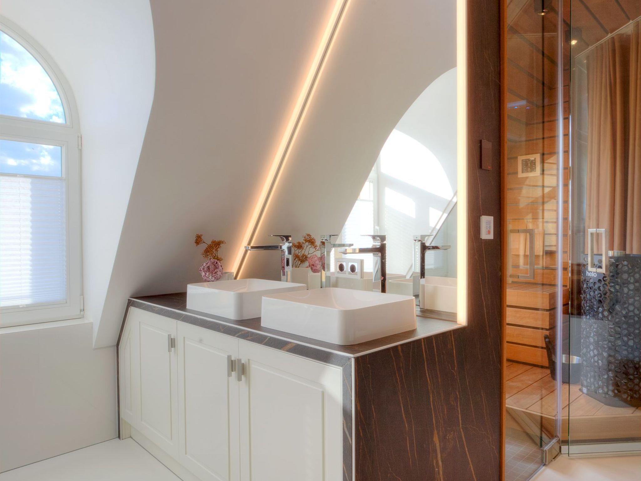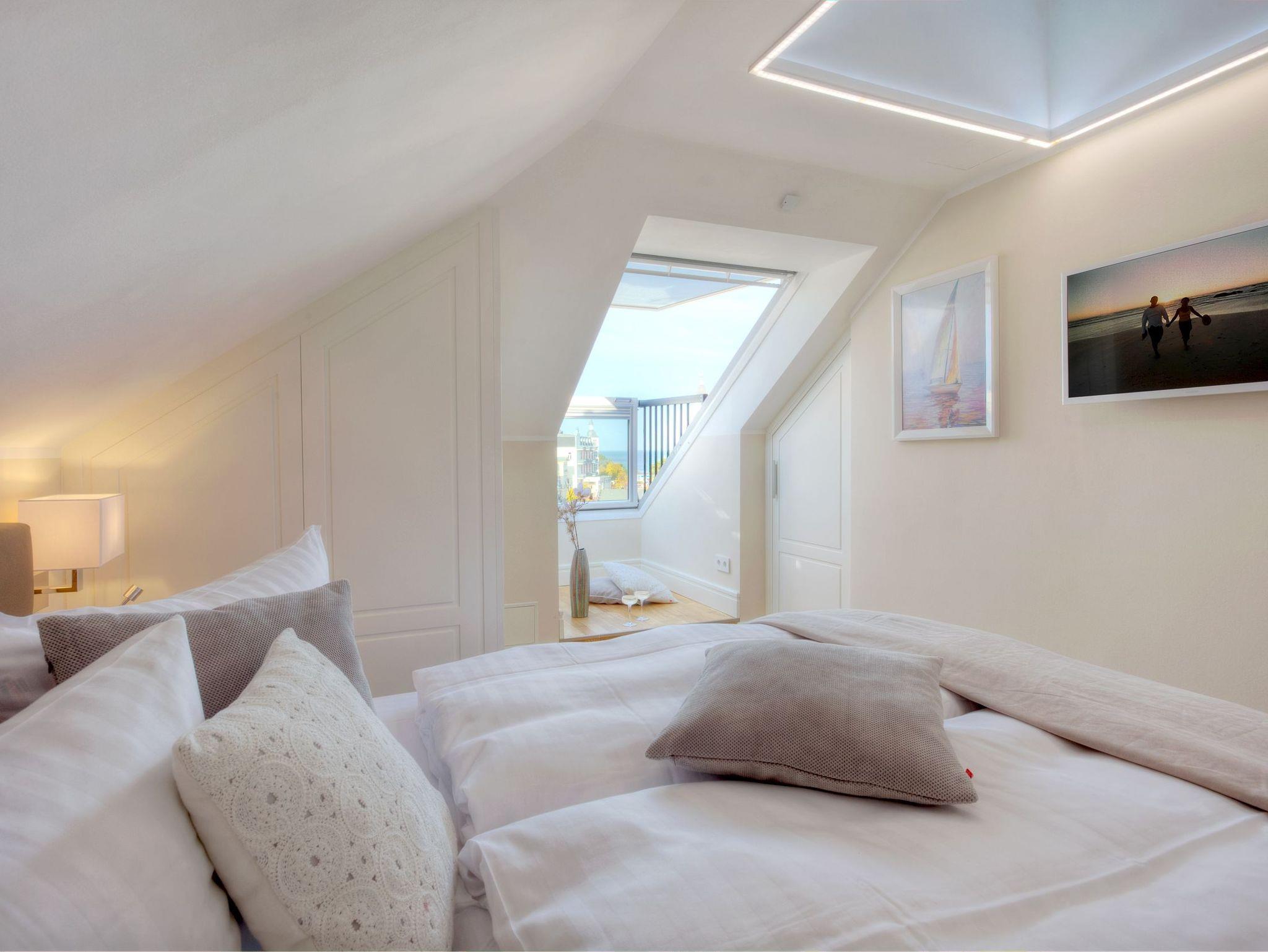Nun haben Sie den höchsten Punkt der Villa erreicht. Genießen Sie den atemberaubenden Fernblick über Zinnowitzs Dächer bis hin zum Meer. Lassen Sie hier den Abend bei einem gemütlichen Glas Wein ausklingen und fühlen sich wie Gott auf Usedom. Für die wohlige Wärme zu jeder Jahreszeit sorgen Fußbodenheizung und Klimaanlage.
