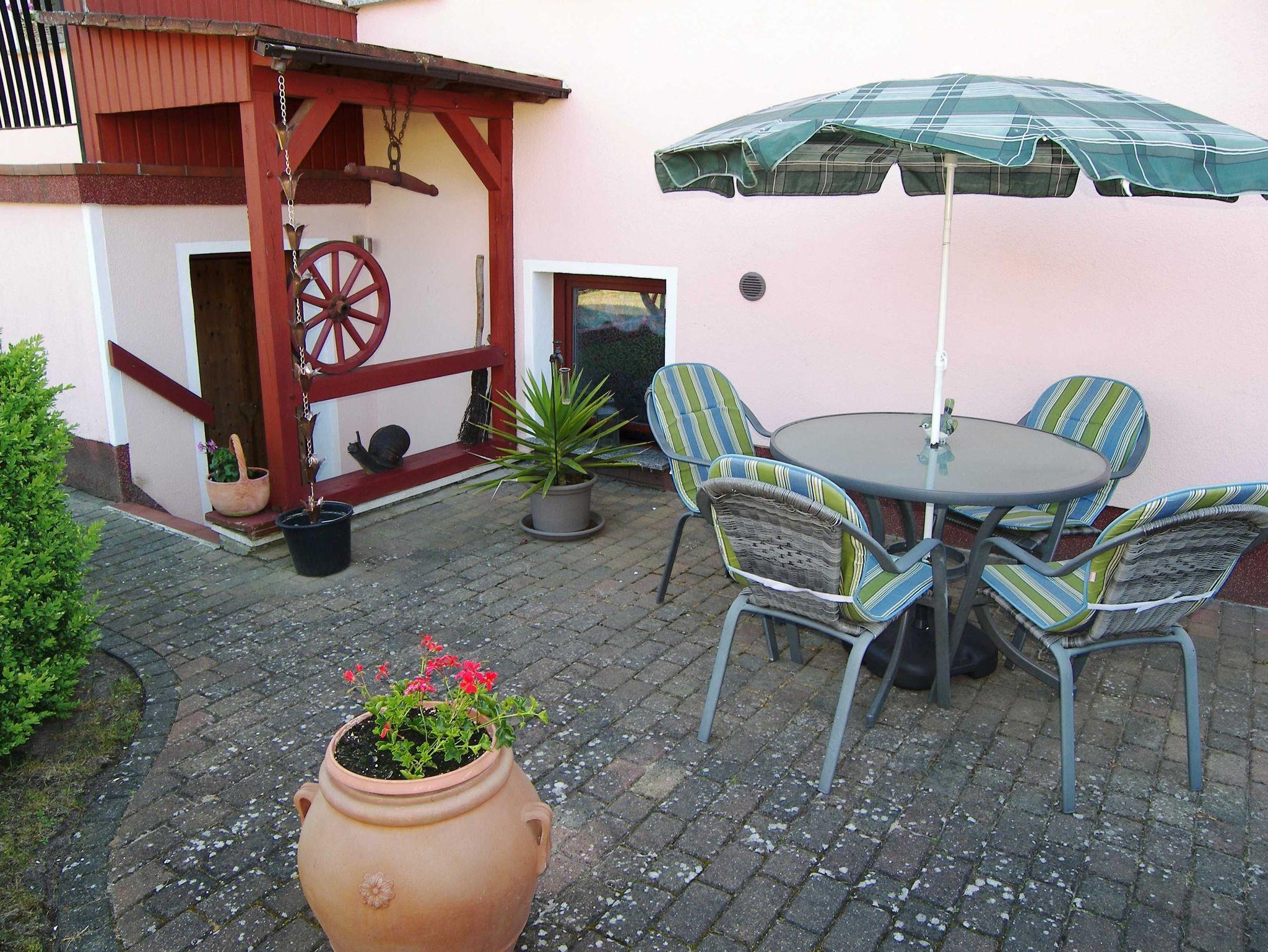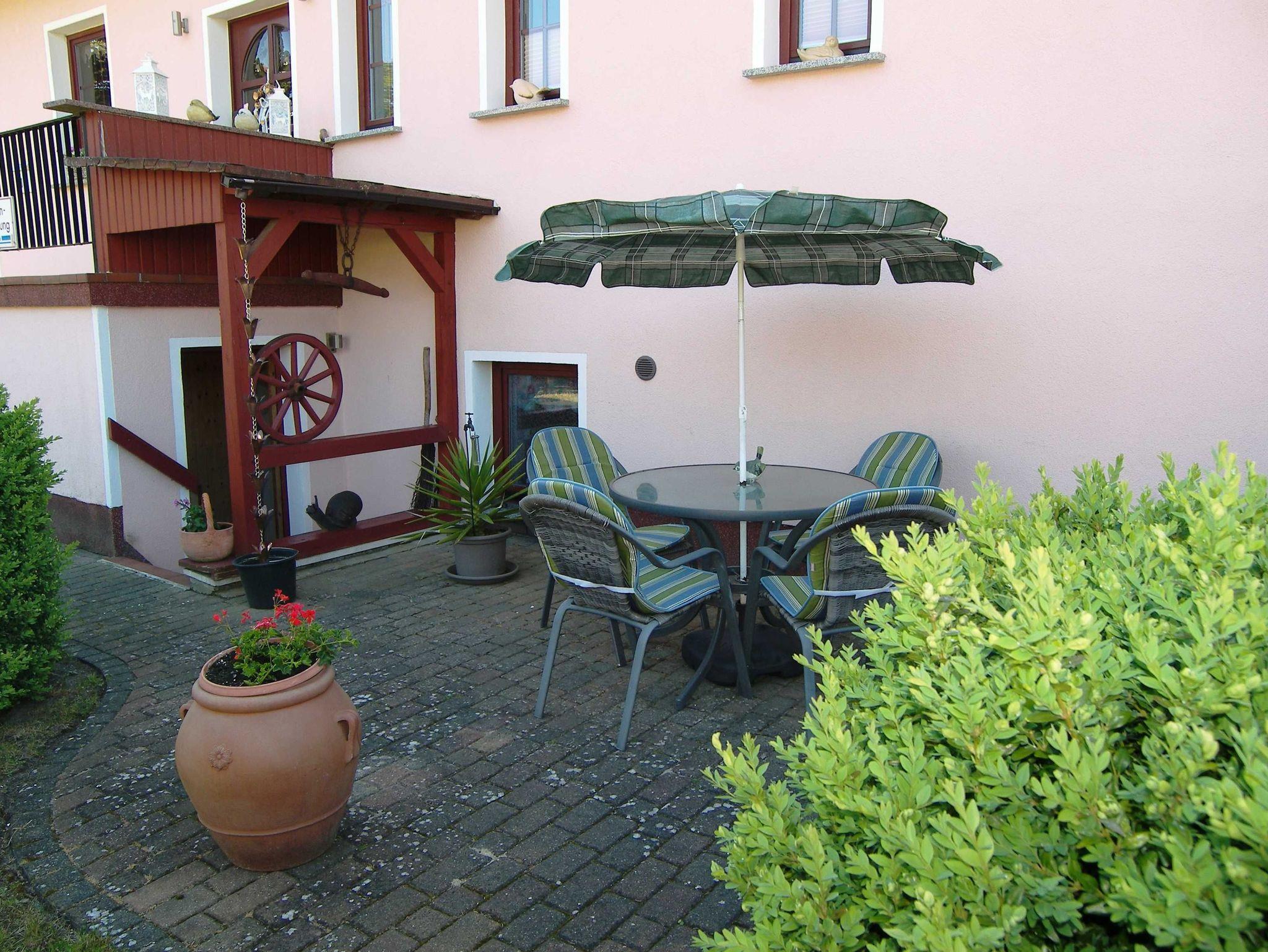 Die Ferienwohnung im Souterrain verfügt über ein Wohnzimmer mit Radio und Flat-TV einer Einbauküche mit Backofen, 4-Platten-Herd, Kühlschrank, Kaffeemaschine und Toaster. Des Weiteren gibt es ein Schlafzimmer mit Doppelbett und ein Badezimmer mit Dusche und WC. Die Aufbettung für ein Kind im Alter von maximal 12 Jahren über ein Zustellbett ist möglich. Eine Terrasse mit Gartenmöbeln und Grill steht den Gästen ebenfalls zur Verfügung. Auf Wunsch kann die Bettwäsche gegen Gebühr dazu gebucht werden.
