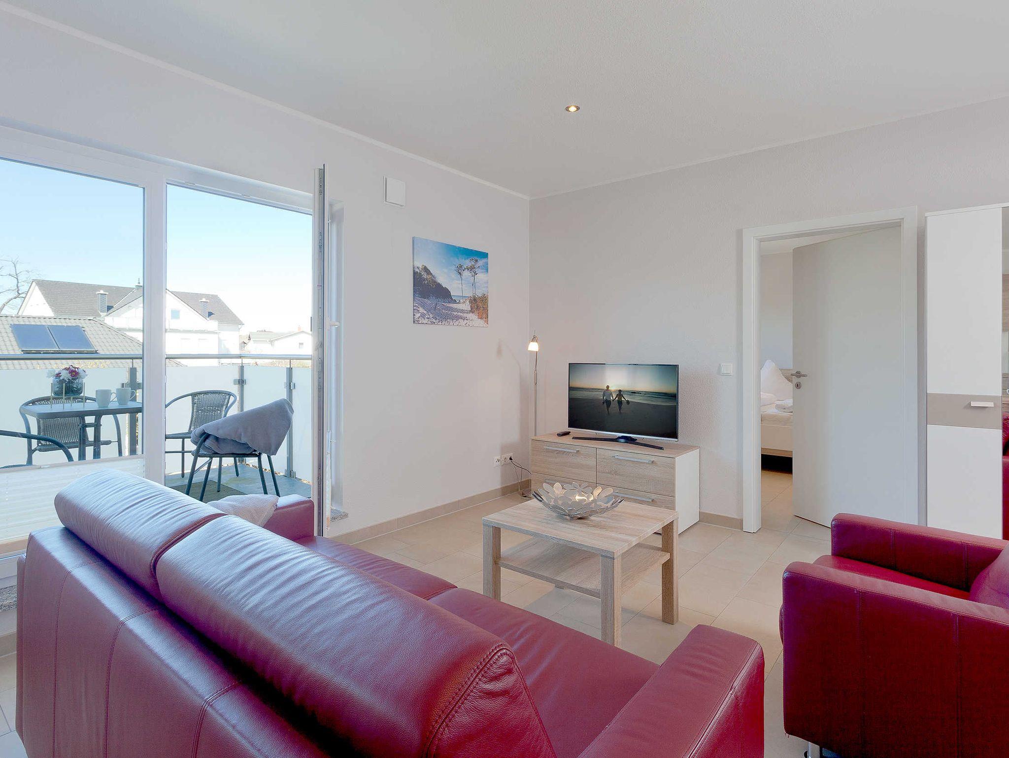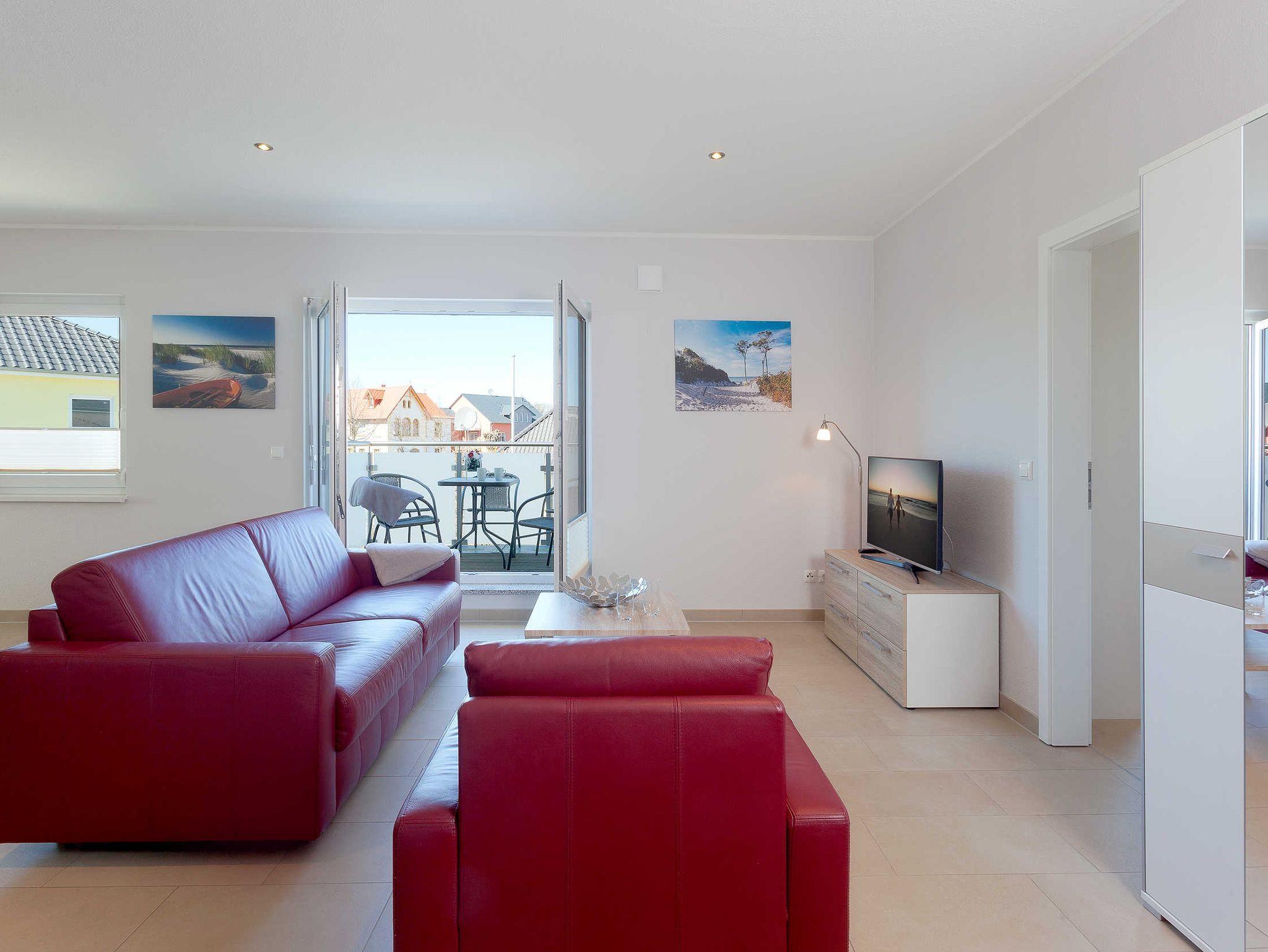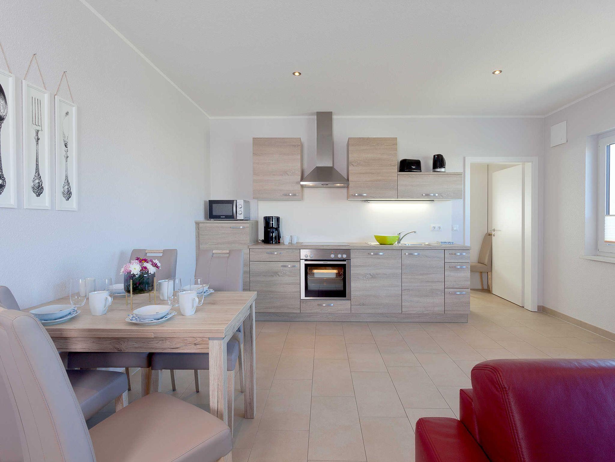 Die Ferienwohnung Steuerbord verfügt über einen eigenen Balkon mit Gartenmöbeln und ist modern, geschmackvoll und komfortabel eingerichtet.