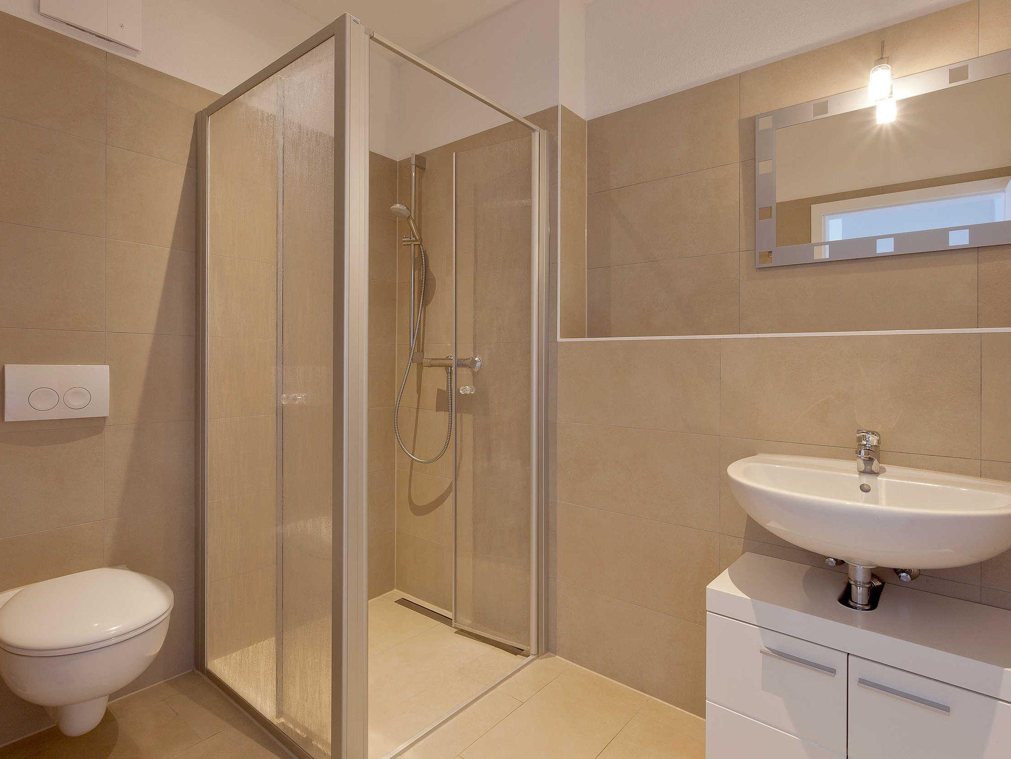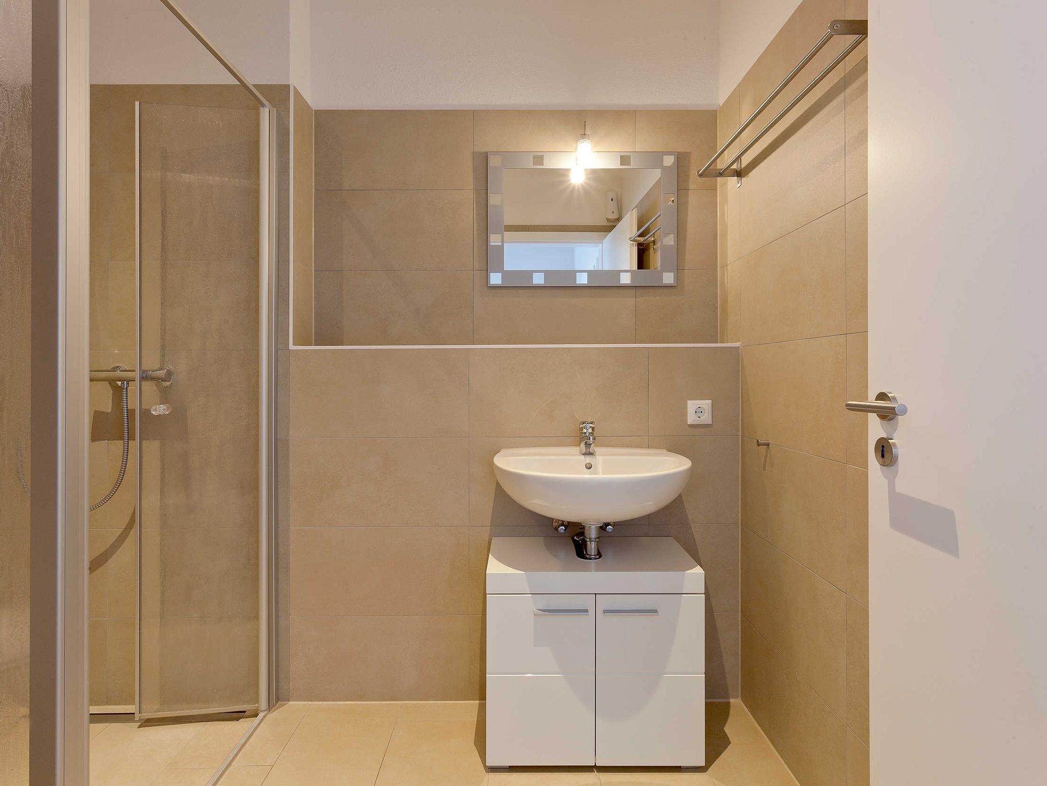 1 Bad mit Dusche, 1 Wohnzimmer mit Schlafcouch. In einem Schlafzimmer ist Platz für mindestens 1 Baby, das noch im Babybett schläft.